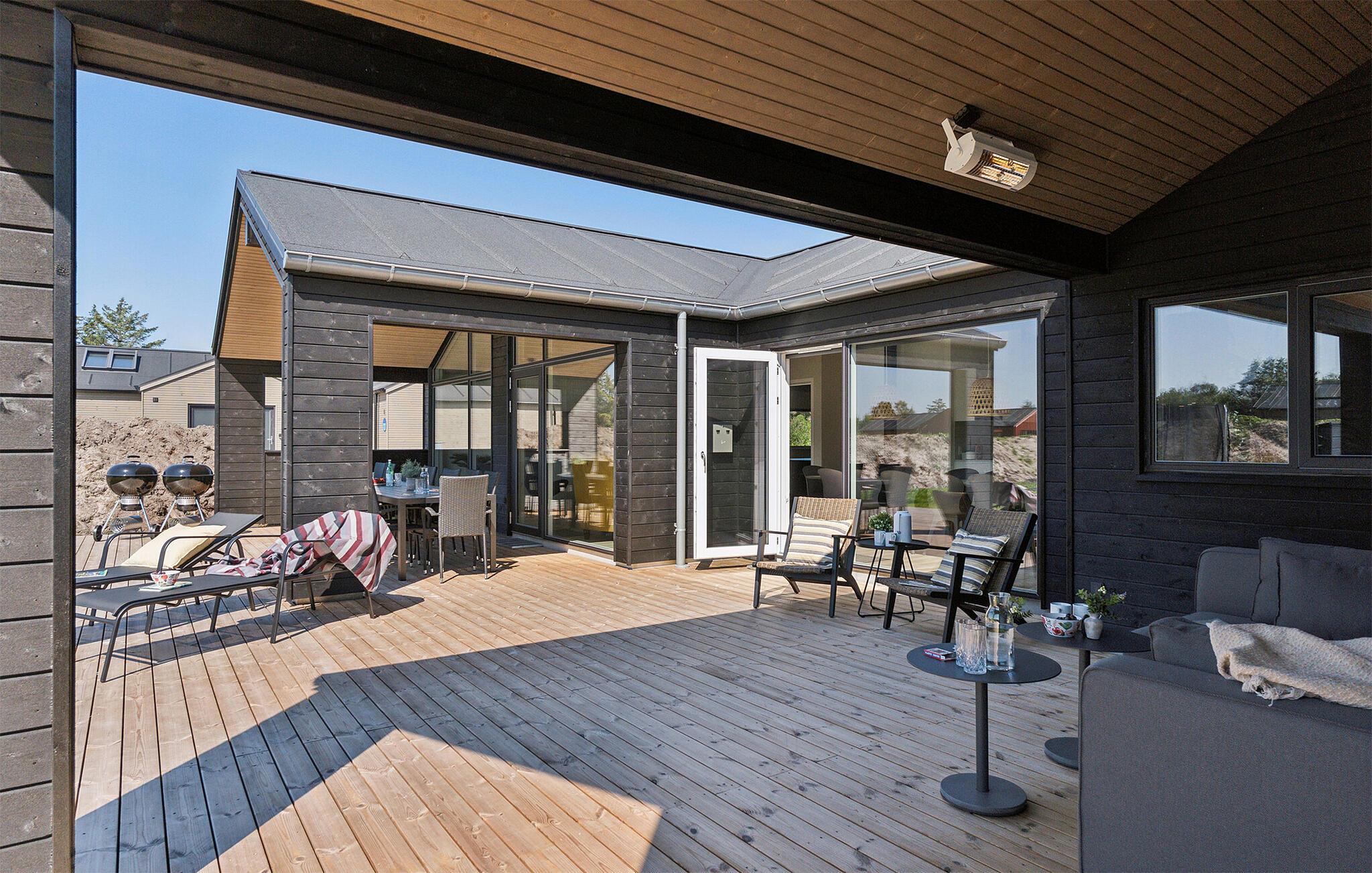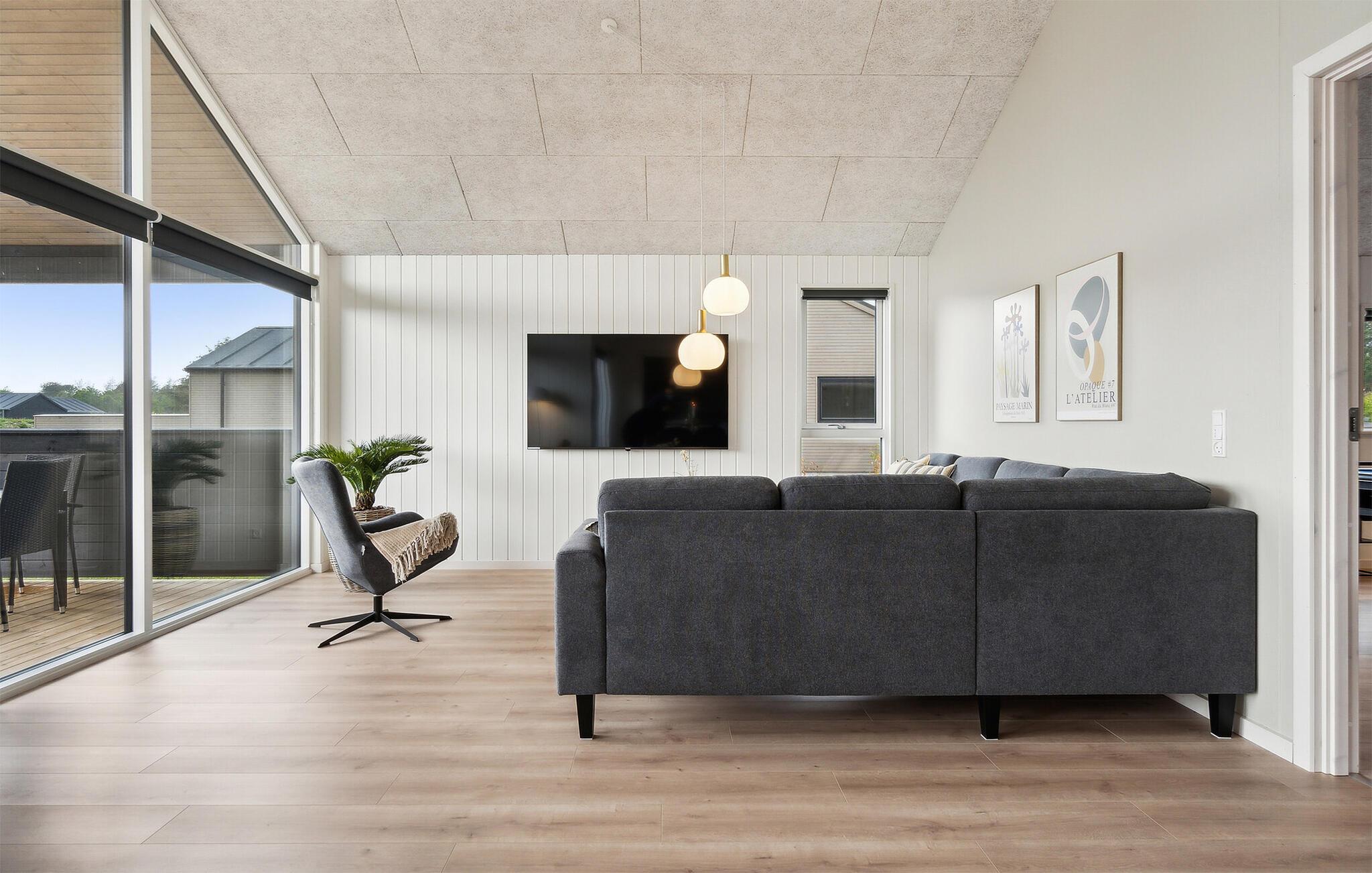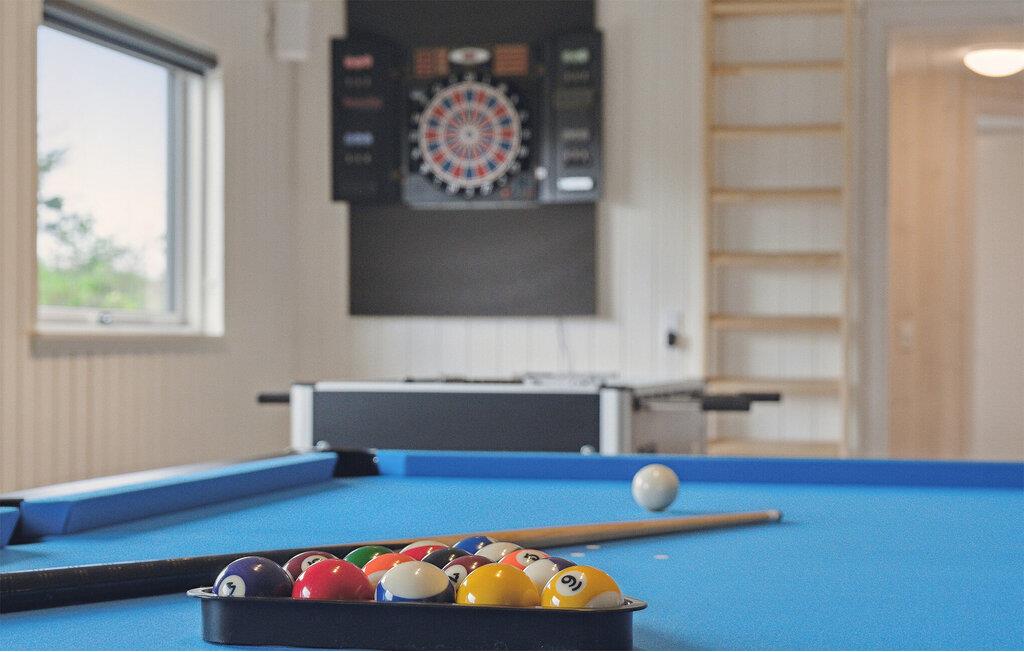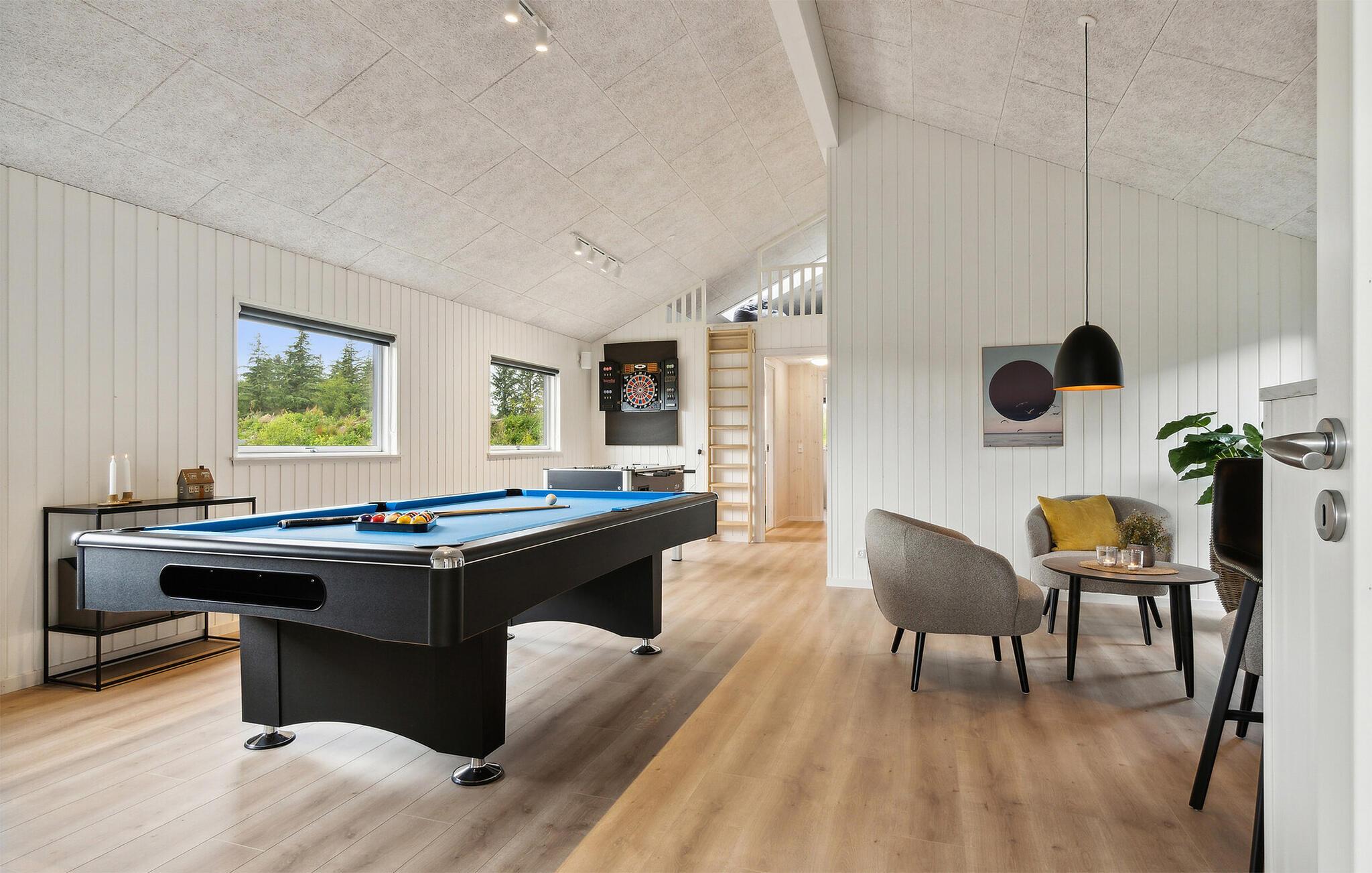 Dieses exquisite Ferienhaus bietet Ihnen Luxus und Entspannung pur. Die Lage ist traumhaft, eingebettet in die Natur und nur einen kurzen Spaziergang vom Strand entfernt. Im Inneren erwartet Sie ein stilvoll eingerichteter Wohnraum mit einem Holzofen, der für behagliche Abende sorgt. Die moderne Küche ist bestens ausgestattet und in den lichtdurchfluteten Räumen fühlen Sie sich sofort wohl. Der Aktivitätsraum mit Billard und Tischfußball bietet Spaß für Groß und Klein, und das private Schwimmbad mit Rutsche sowie die Sauna lassen keine Wünsche offen.