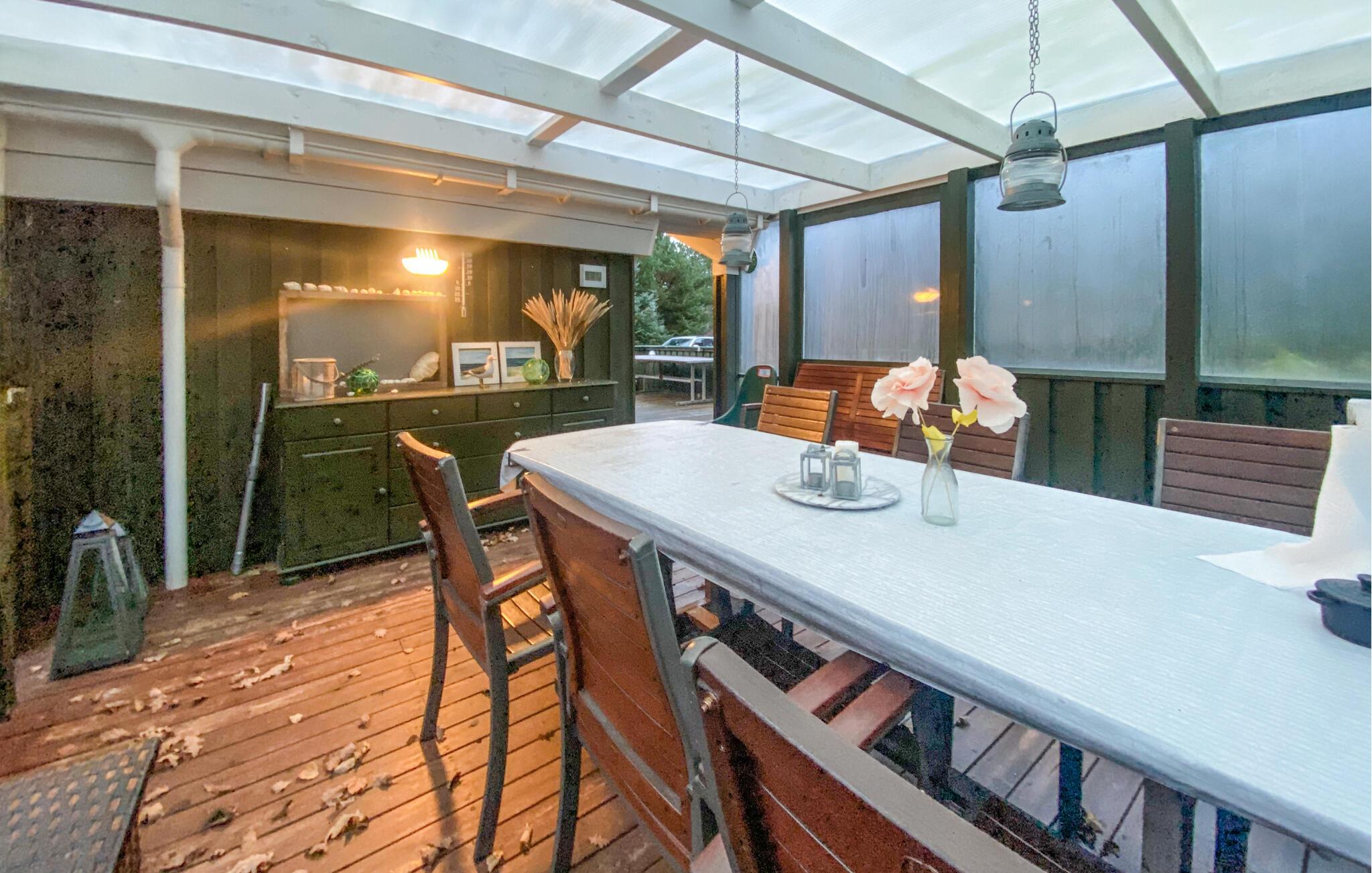 Der Außenbereich des Hauses ist von Bäumen umgeben und bietet Ihnen Privatsphäre sowie zahlreiche Möglichkeiten zum Entspannen. Nutzen Sie die große, überdachte Terrasse für gesellige Abende oder genießen Sie die Ruhe inmitten des weitläufigen Gartens. Spielen Sie hier mit der ganzen Familie lustige Spiele wie Petanque, Krocket oder Fußball.