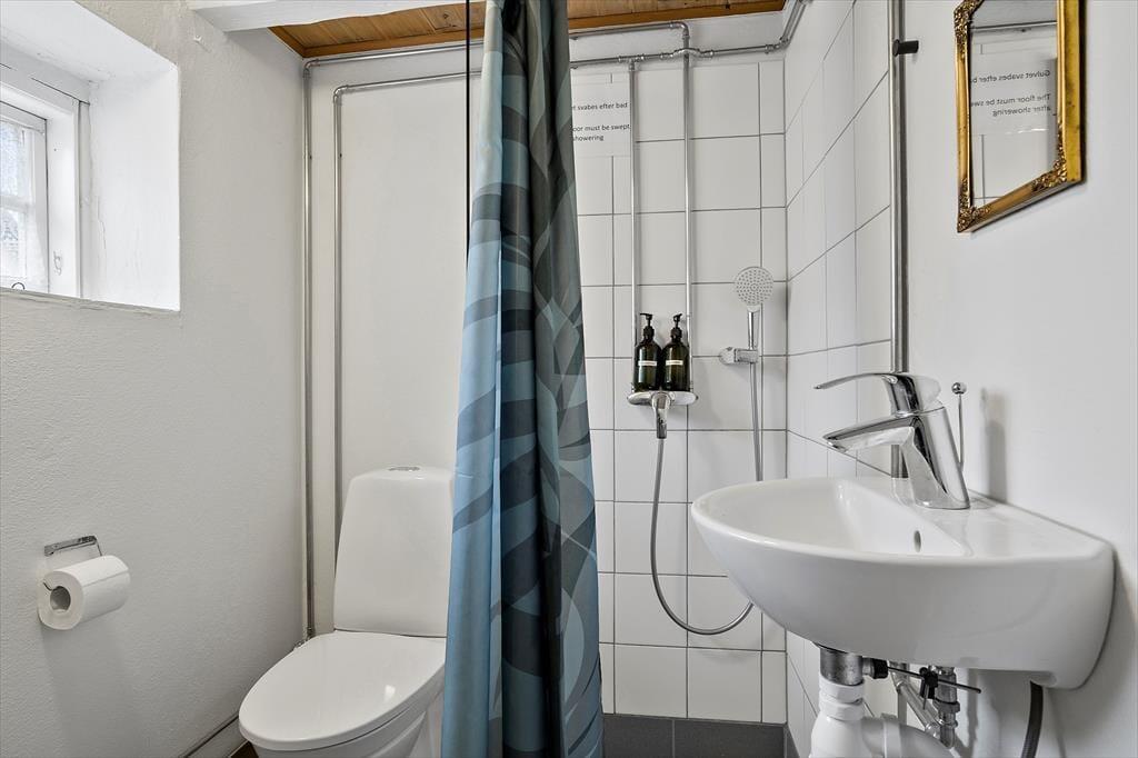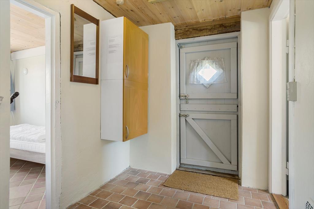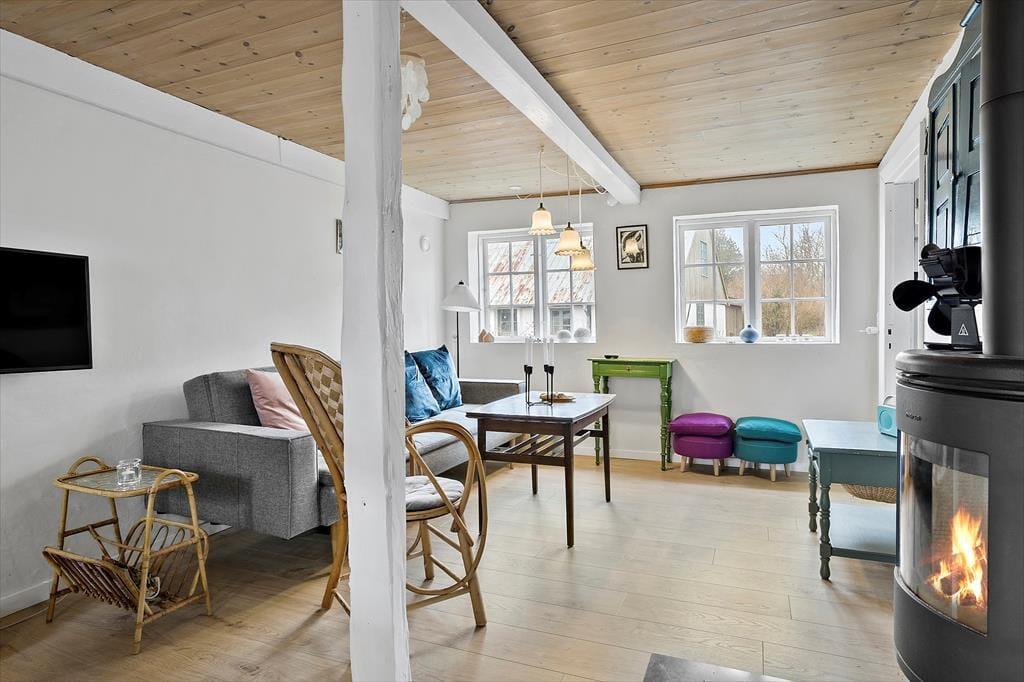 Wenn Sie den Eingangsbereich betreten, finden Sie einen gefliesten Boden und viel Platz für Ihre Mäntel vor. Von hier aus gelangen Sie in eine geräumige Wohnküche mit offen liegenden Deckenbalken und einem zentral platzierten Kaminofen. Die offene Küche verfügt über eine große Arbeitsfläche, einen Geschirrspüler und einen großen Kühlschrank mit Gefrierfach. Das Wohnzimmer enthält einen Essbereich mit einer schönen alten Bank und Blick auf den Hinterhof. In direktem Anschluss befindet sich eine gemütliche Sofaecke mit wandmontiertem Fernseher mit Chromecast. Hier ist es möglich, eigene Inhalte über Handy oder Tablet und das WiFi des Hauses zu schauen. Dies ist der absolute Sammlungspunkt des Hauses, in dem man zusammen kommt, um gemeinsam zu kochen oder zu entspannen.
