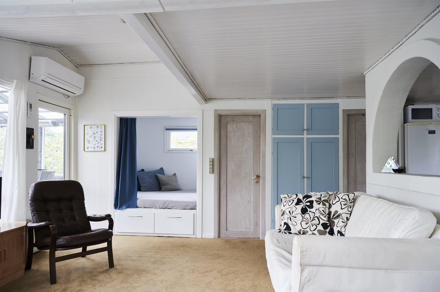 Es gibt einen Schlafraum. 2 Schlafplätze in einem Doppelbett.2 Schlafplätze im Alkoven. 2 von diesen Schlafplätzen befinden sich im Wohnzimmer. Ferner steht ein Kinderbett zur Verfügung.
