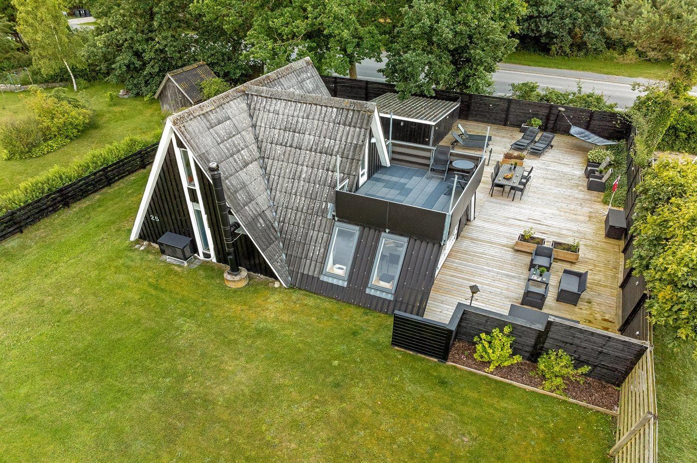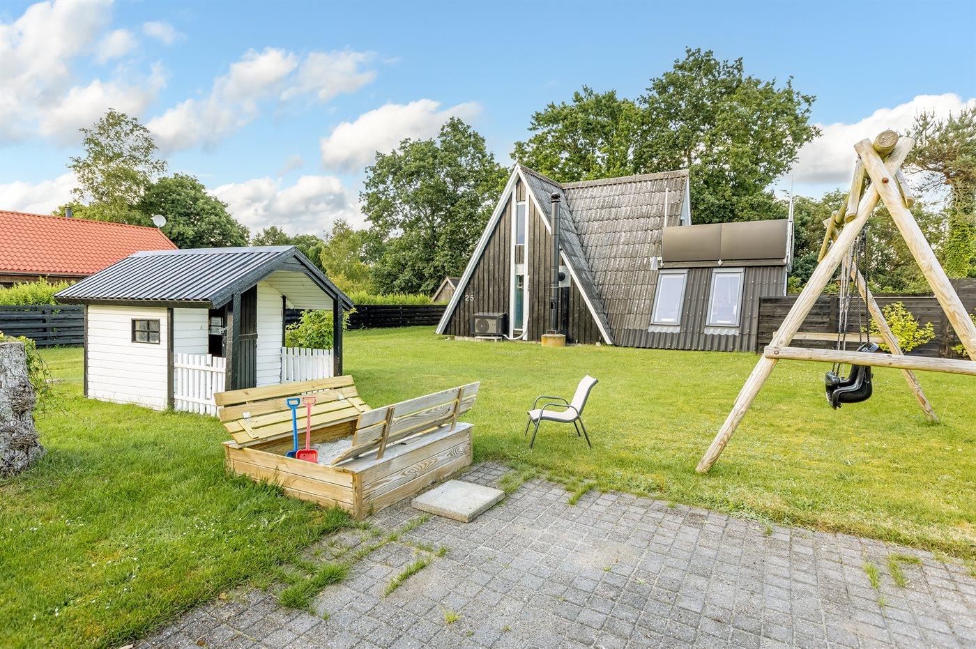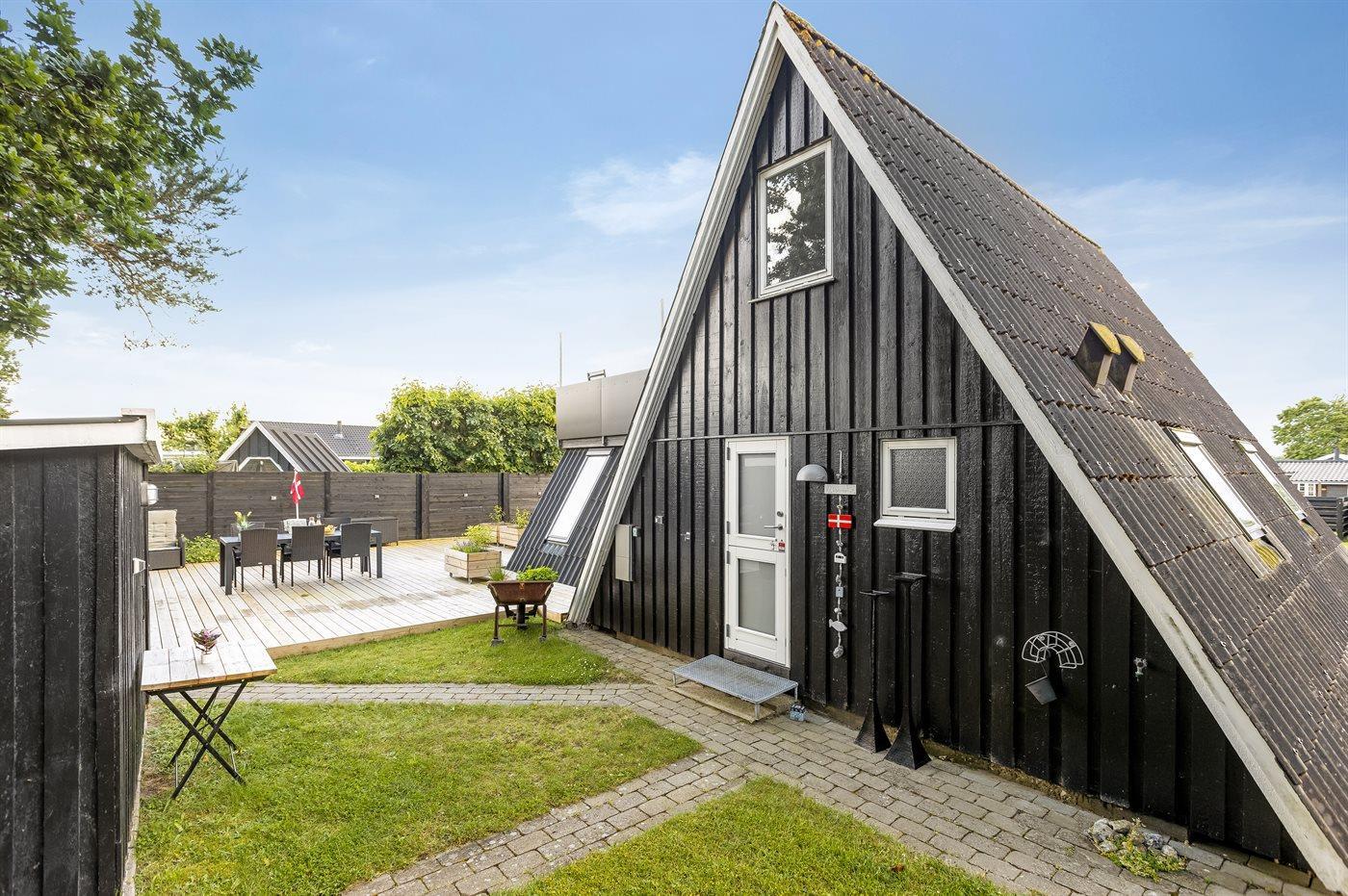 I dette specielle A-sommerhus er der skabt en hyggelig atmosfære, med hyggekroge både inde og ude. Indenfor kan der hygges med spil i den åbne planløsning, mens man nyder varmen fra brændeovnen. Ude kan man grille mens de små leger i legehuset, på gyngestativet eller i sandkassen.
