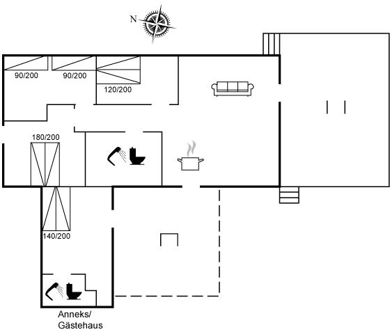 Die Schlafplätze verteilen sich auf 4 Schlafräume. 4 Schlafplätze in Doppelbetten. 3 Schlafplätze in Einzelbetten. 2 von diesen Schlafplätzen befinden sich im Gästehaus. Ferner stehen 2 Kinderbetten zur Verfügung.