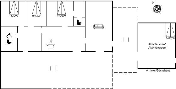 Die Schlafplätze verteilen sich auf 4 Schlafräume. 6 Schlafplätze in Doppelbetten. 2 Schlafplätze auf einer Doppelschlafcouch. 2 von diesen Schlafplätzen befinden sich im Aktivitätsraum im Gästehaus. Ferner steht ein Kinderbett zur Verfügung.