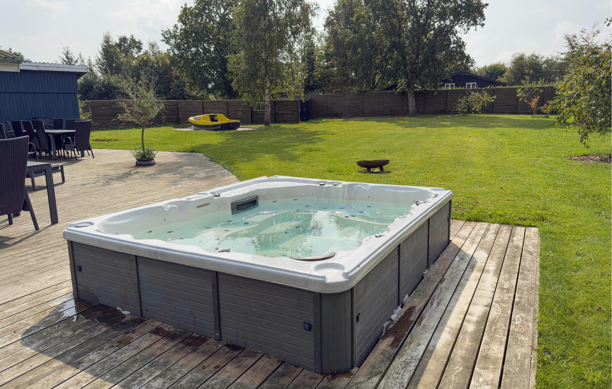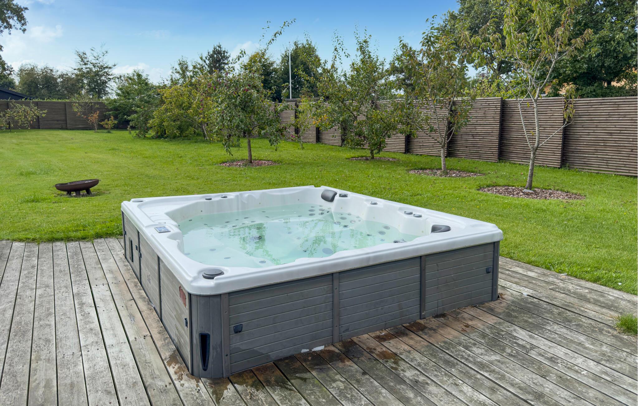 Genießen Sie die frische Luft auf der weitläufigen Holzterrasse. Erholen Sie sich im sprudelnden Whirlpool oder entspannen Sie auf den Sonnenliegen. Nehmen Sie Platz auf den gemütlichen Gartenmöbeln oder gönnen Sie sich ruhige Stunden im Wintergarten. Spielen Sie auf der großen Rasenfläche mit den Kindern oder lassen Sie einfach den Blick über das gepflegte Grün schweifen.