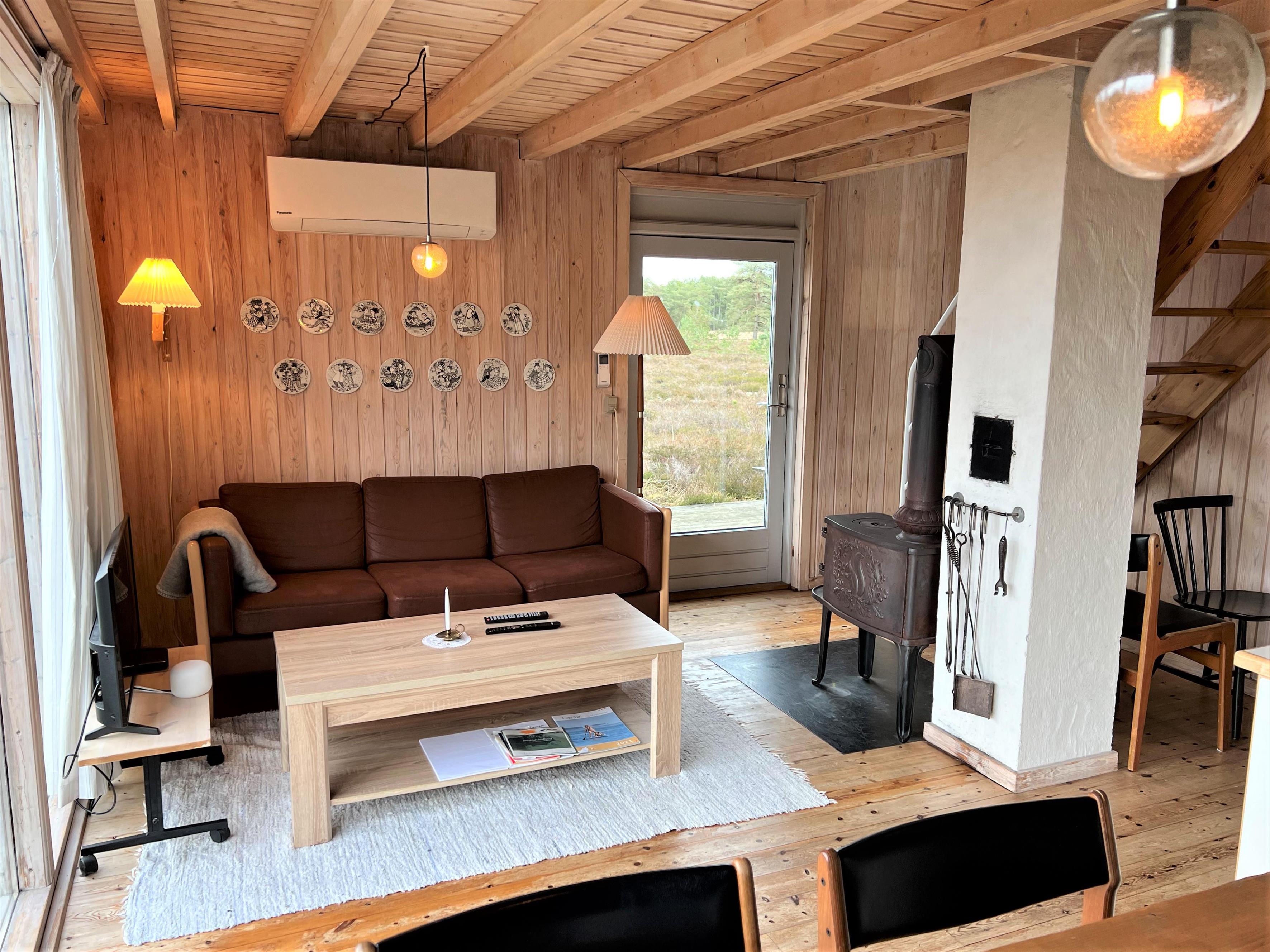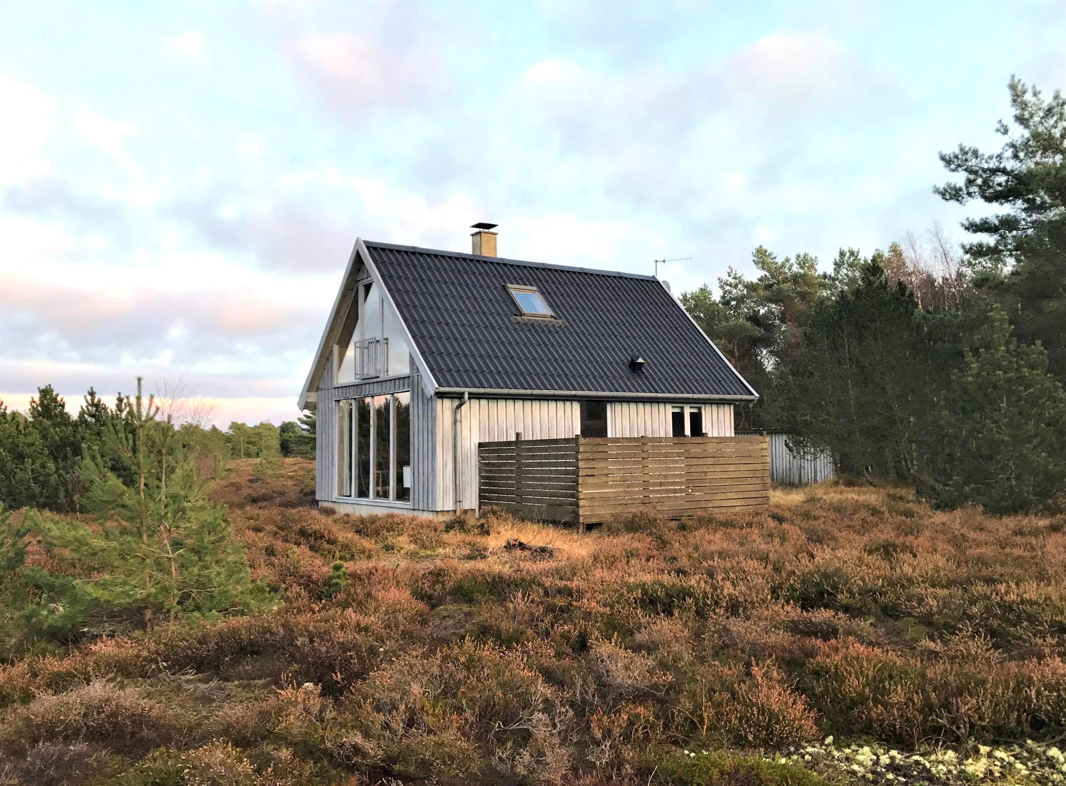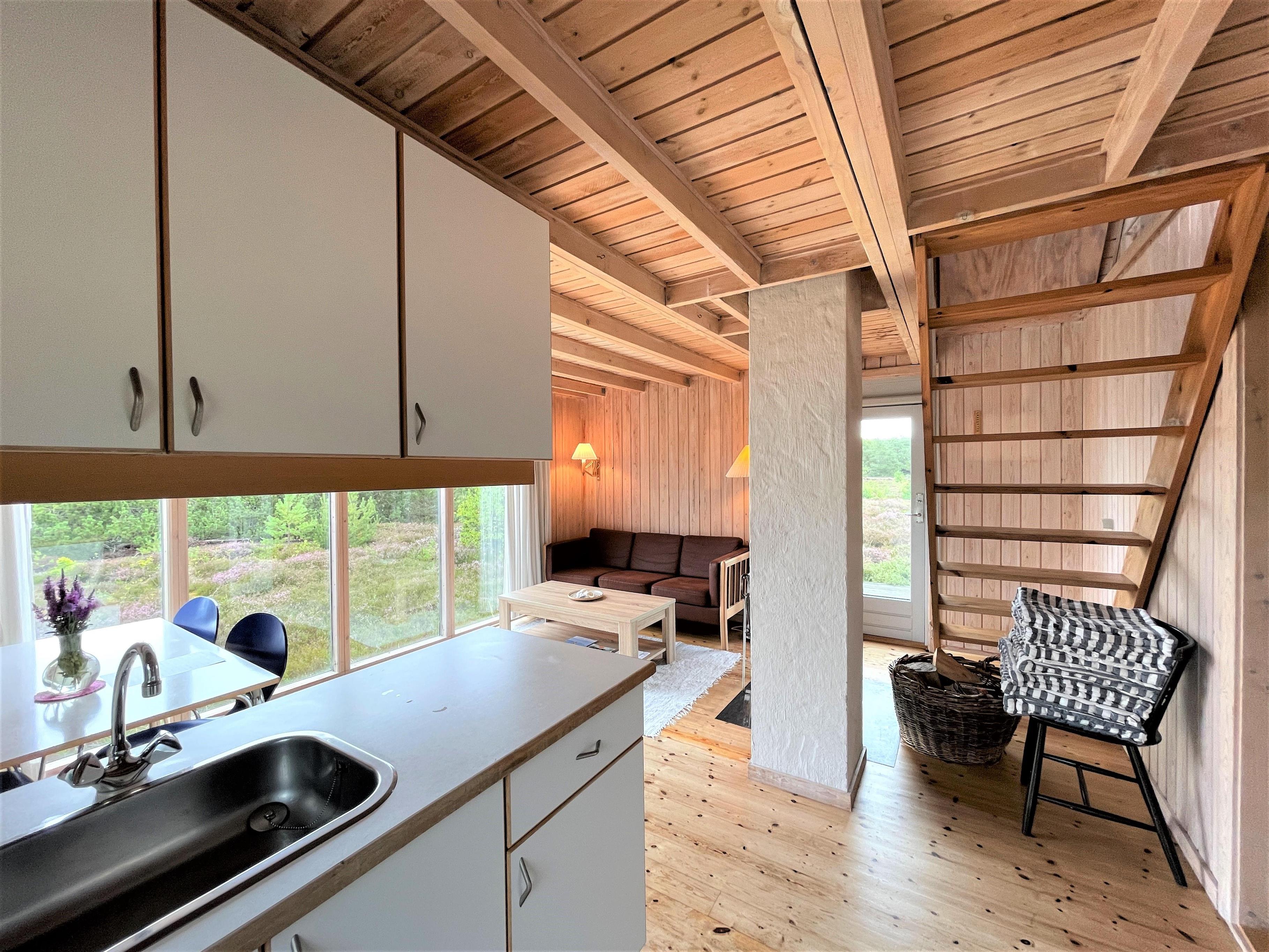 Das Haus selbst verfügt über eine große Wohnküche mit Essbereich und Sofaecke mit Holzofen. Schönes Licht und schöne Aussicht. Außerdem befinden sich im Erdgeschoss das Badezimmer mit Waschmaschine und ein Schlafzimmer mit Eizelbett. Von der Küche aus hat man Zugang zu einer gemütlichen, privaten Holzterrasse. Im 1. Stock gibt es einen Platz, um den Blick auf das einzigartige, reizvolle Heidegebiet zu genießen und auf das Meer zu blicken. Darüber hinaus ist die 1. Etage mit einem Doppelbett und einem Einzelbett ausgestattet.