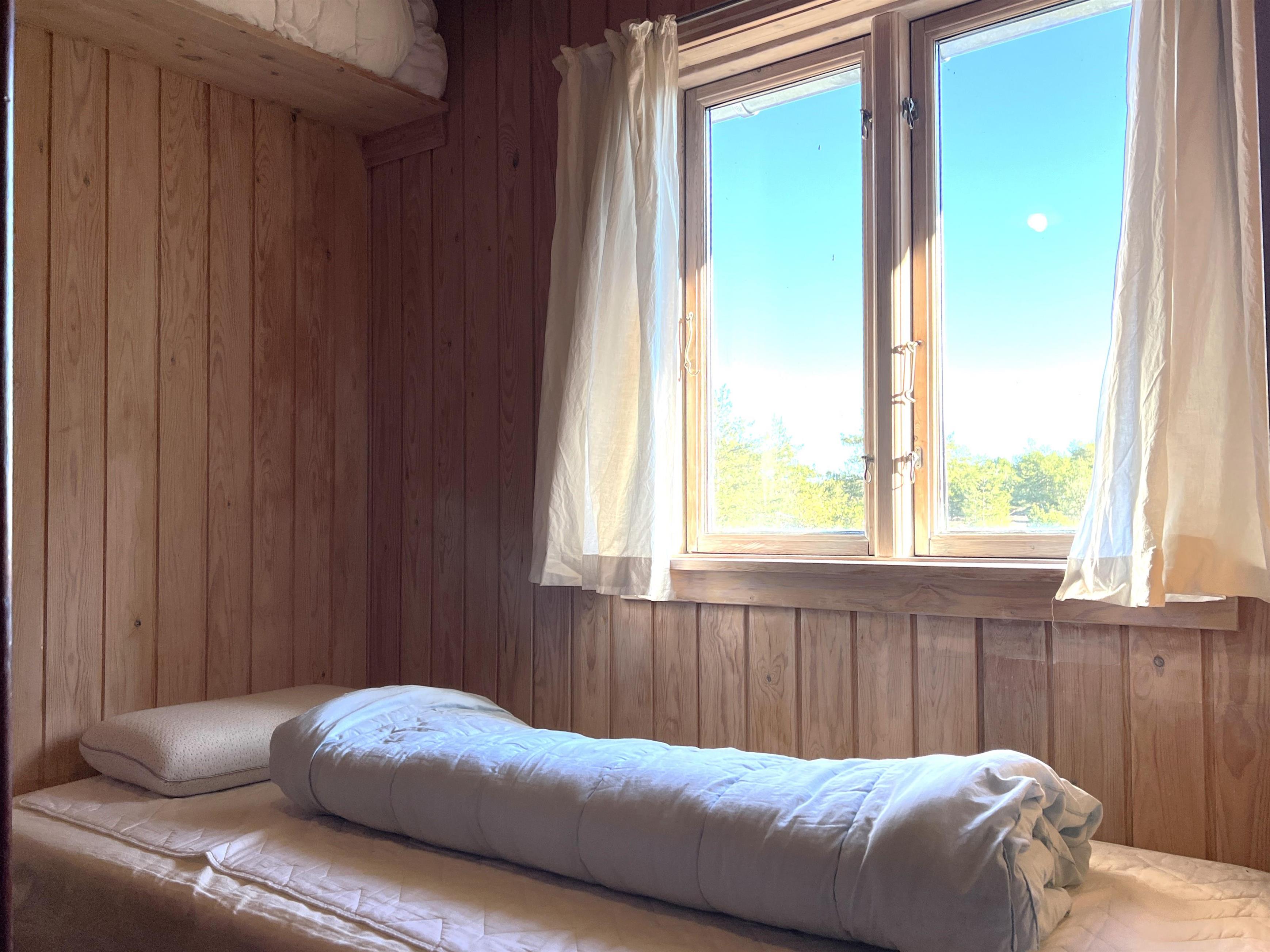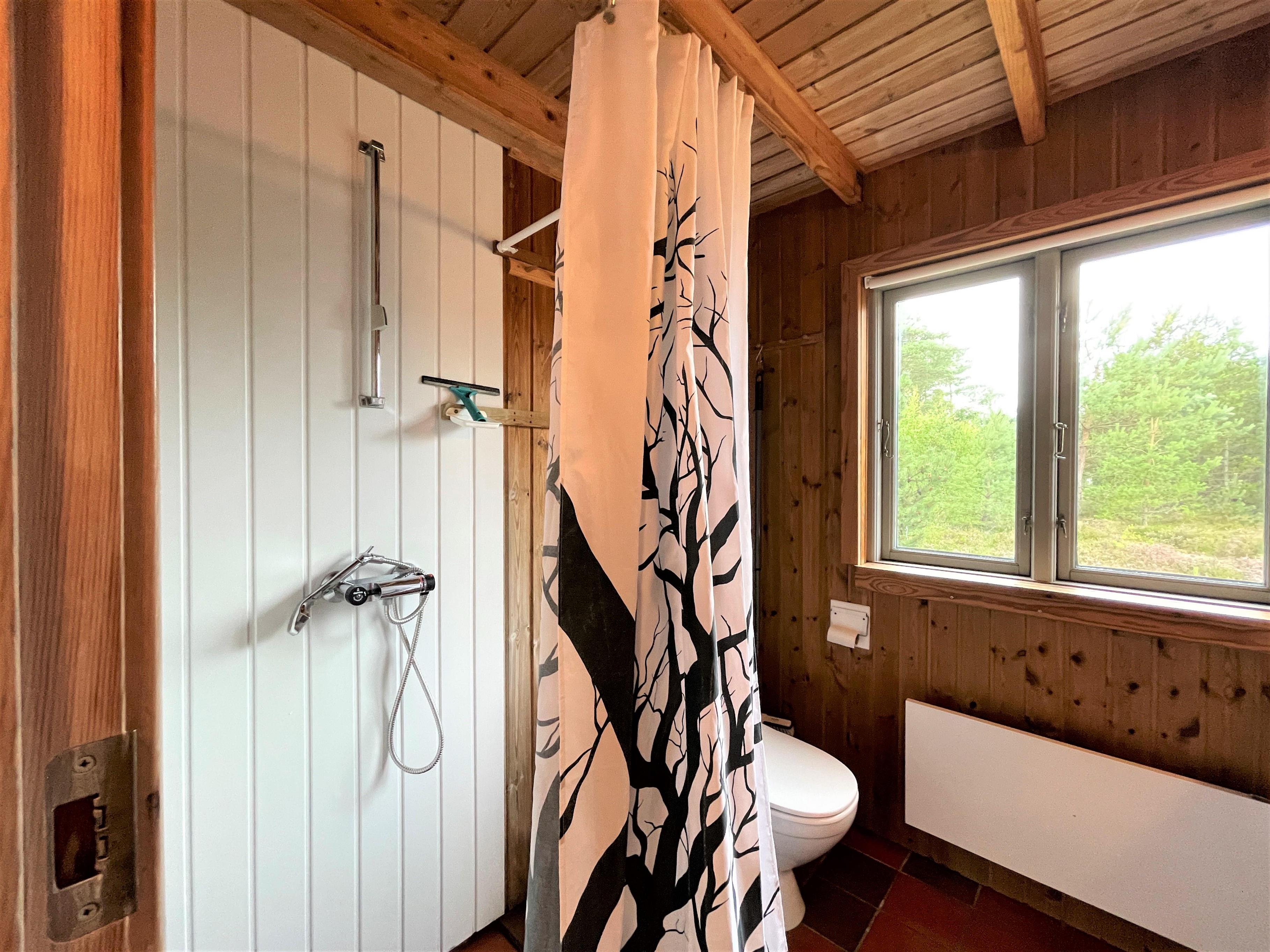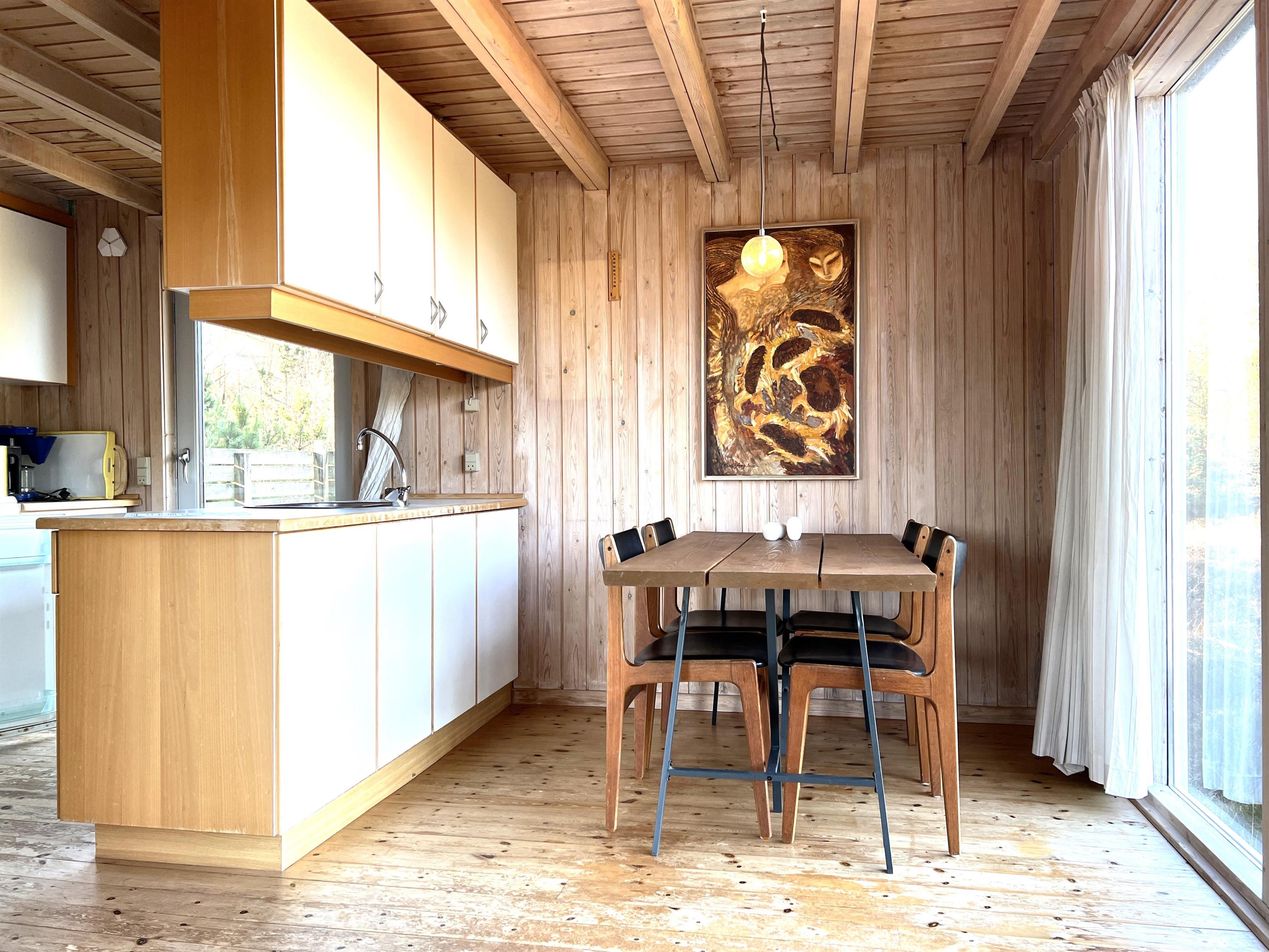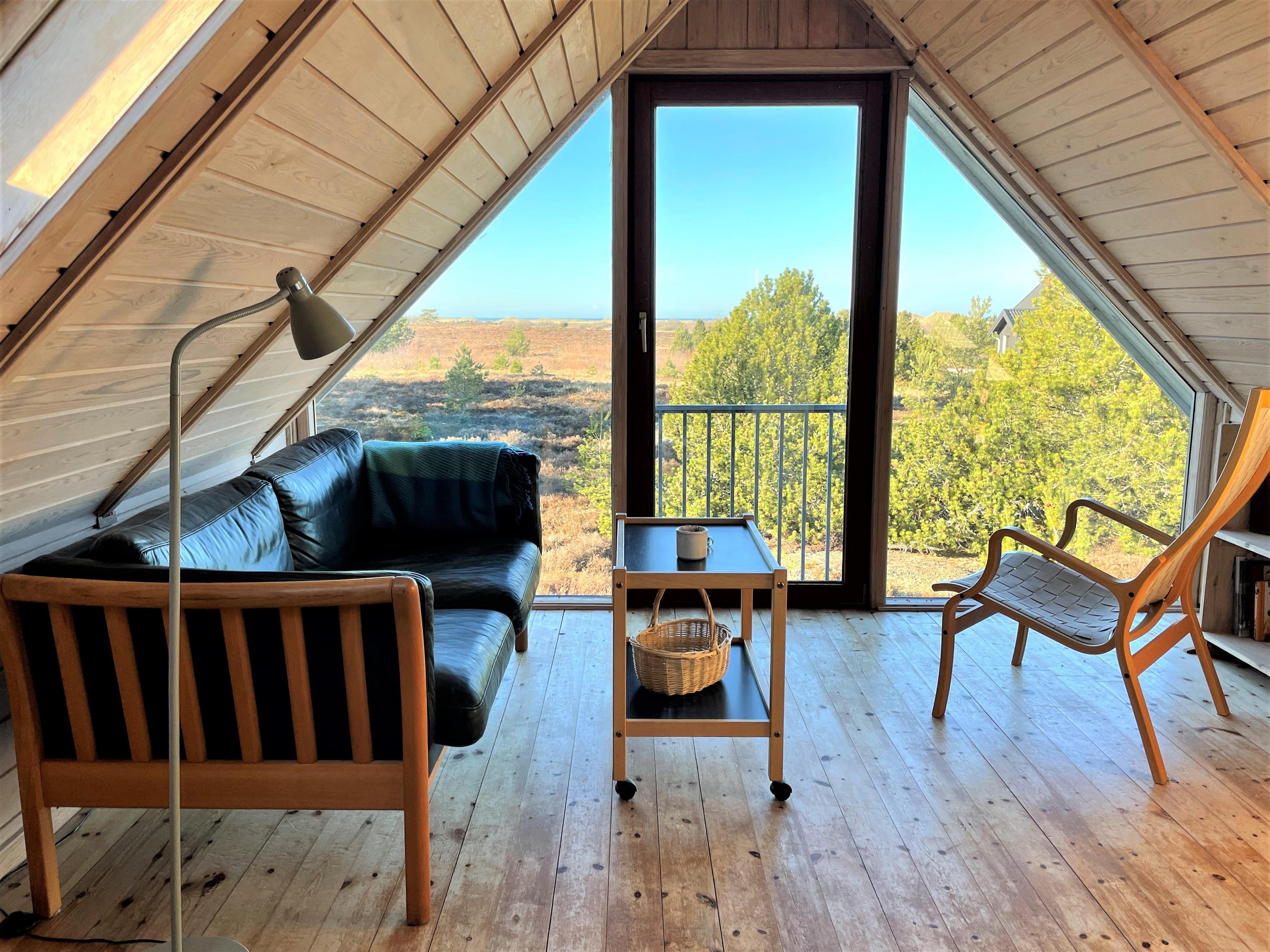 Das Haus selbst verfügt über eine große Wohnküche mit Essbereich und Sofaecke mit Holzofen. Schönes Licht und schöne Aussicht. Außerdem befinden sich im Erdgeschoss das Badezimmer mit Waschmaschine und ein Schlafzimmer mit Eizelbett. Von der Küche aus hat man Zugang zu einer gemütlichen, privaten Holzterrasse. Im 1. Stock gibt es einen Platz, um den Blick auf das einzigartige, reizvolle Heidegebiet zu genießen und auf das Meer zu blicken. Darüber hinaus ist die 1. Etage mit einem Doppelbett und einem Einzelbett ausgestattet.