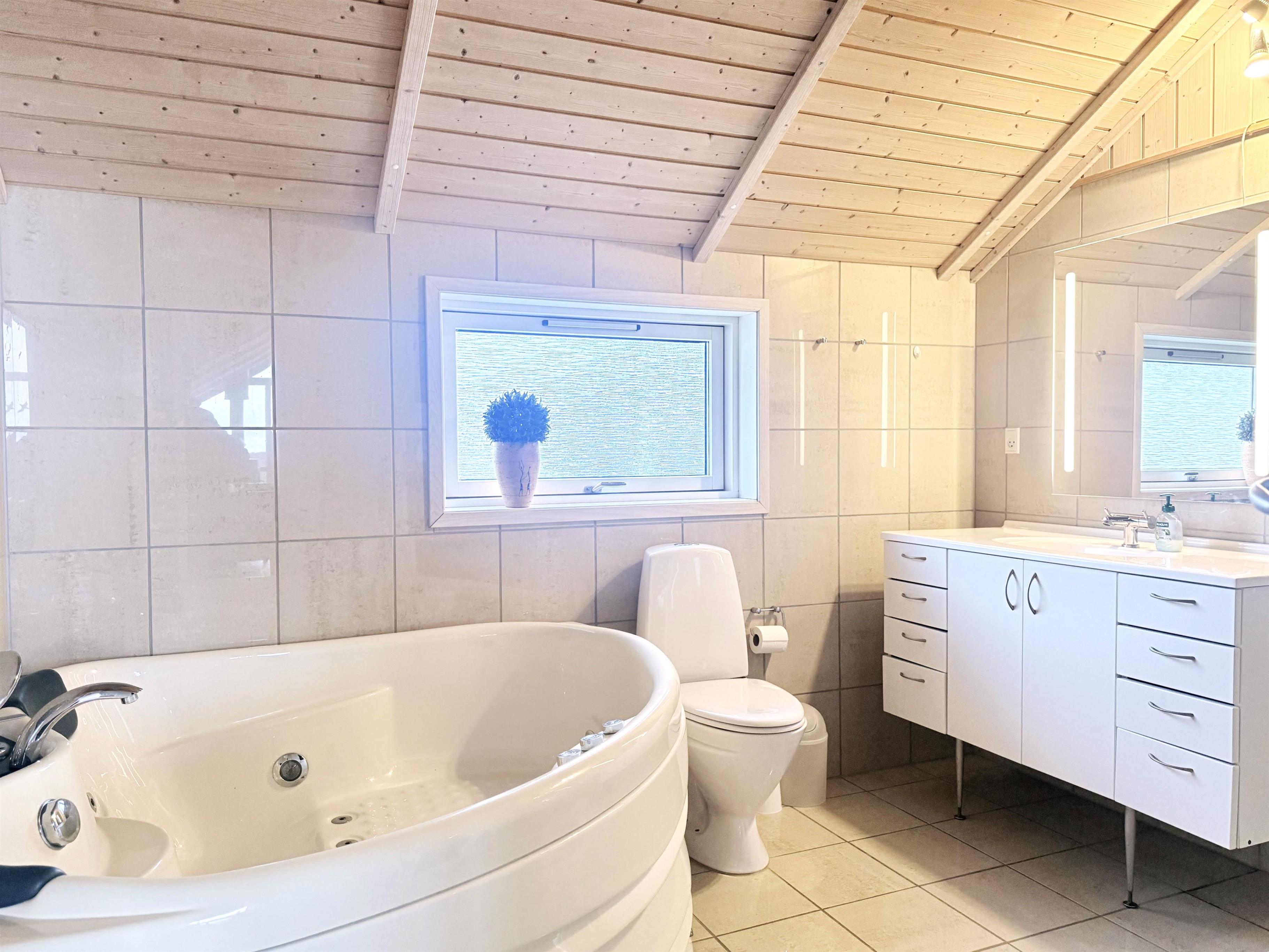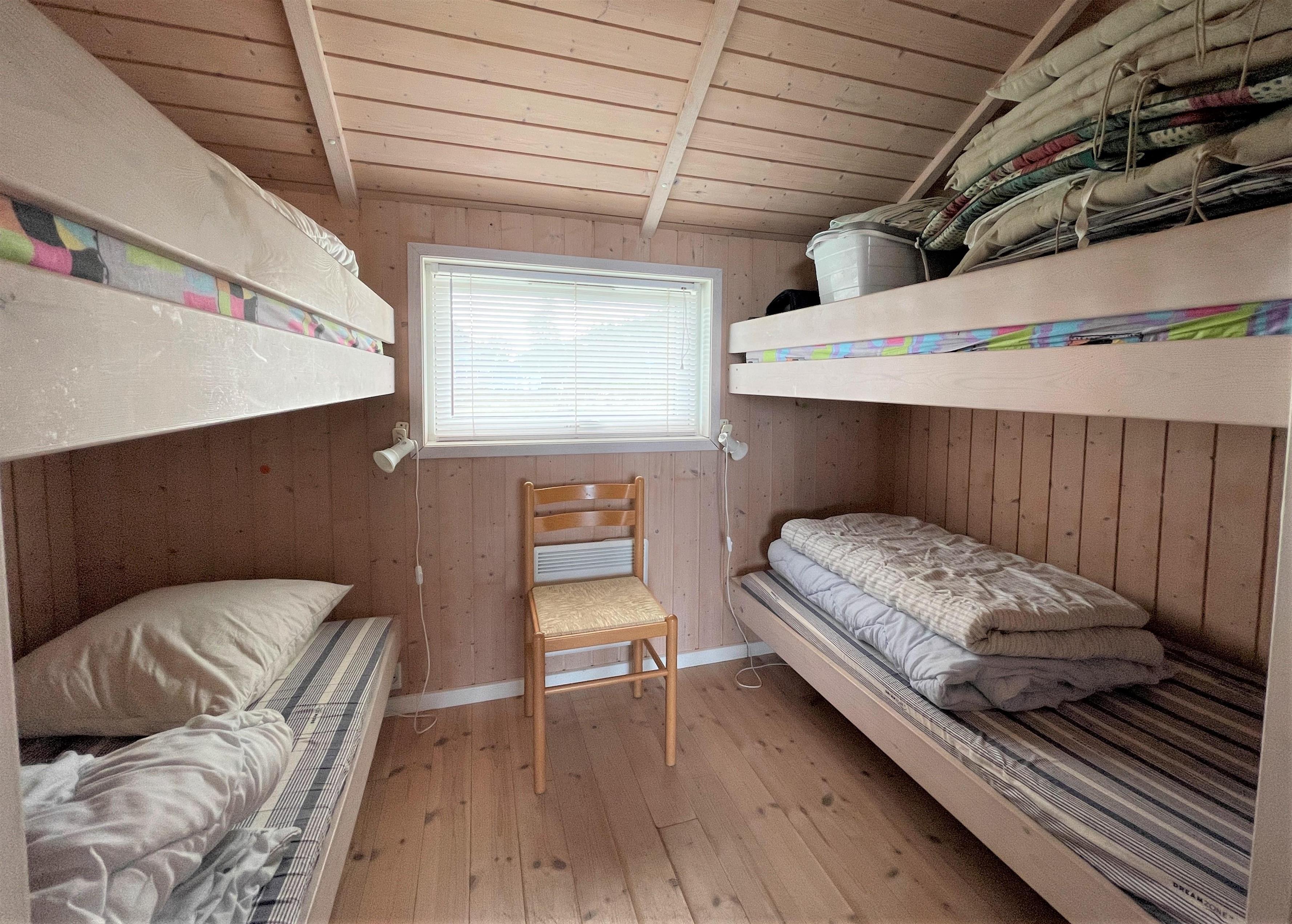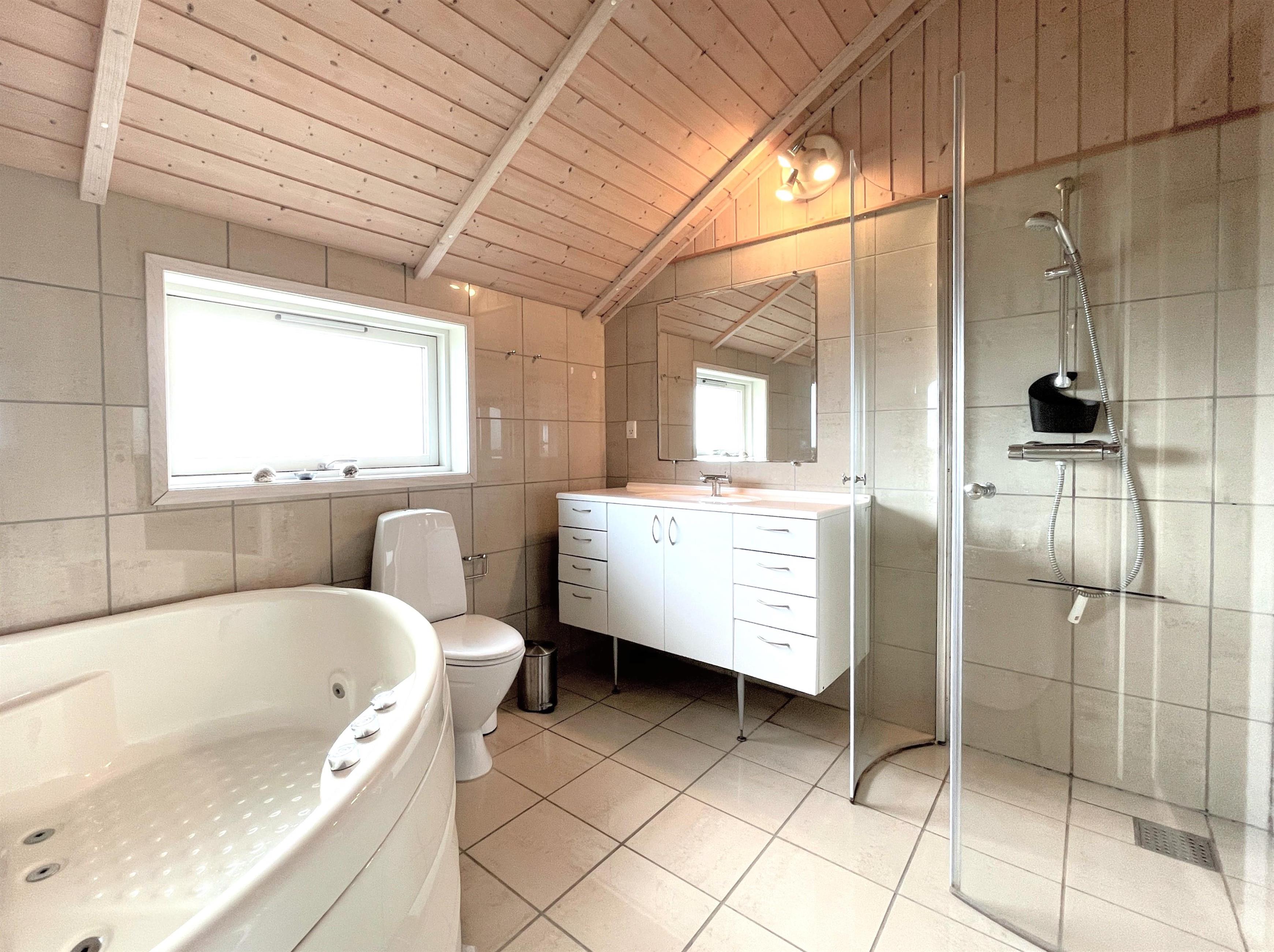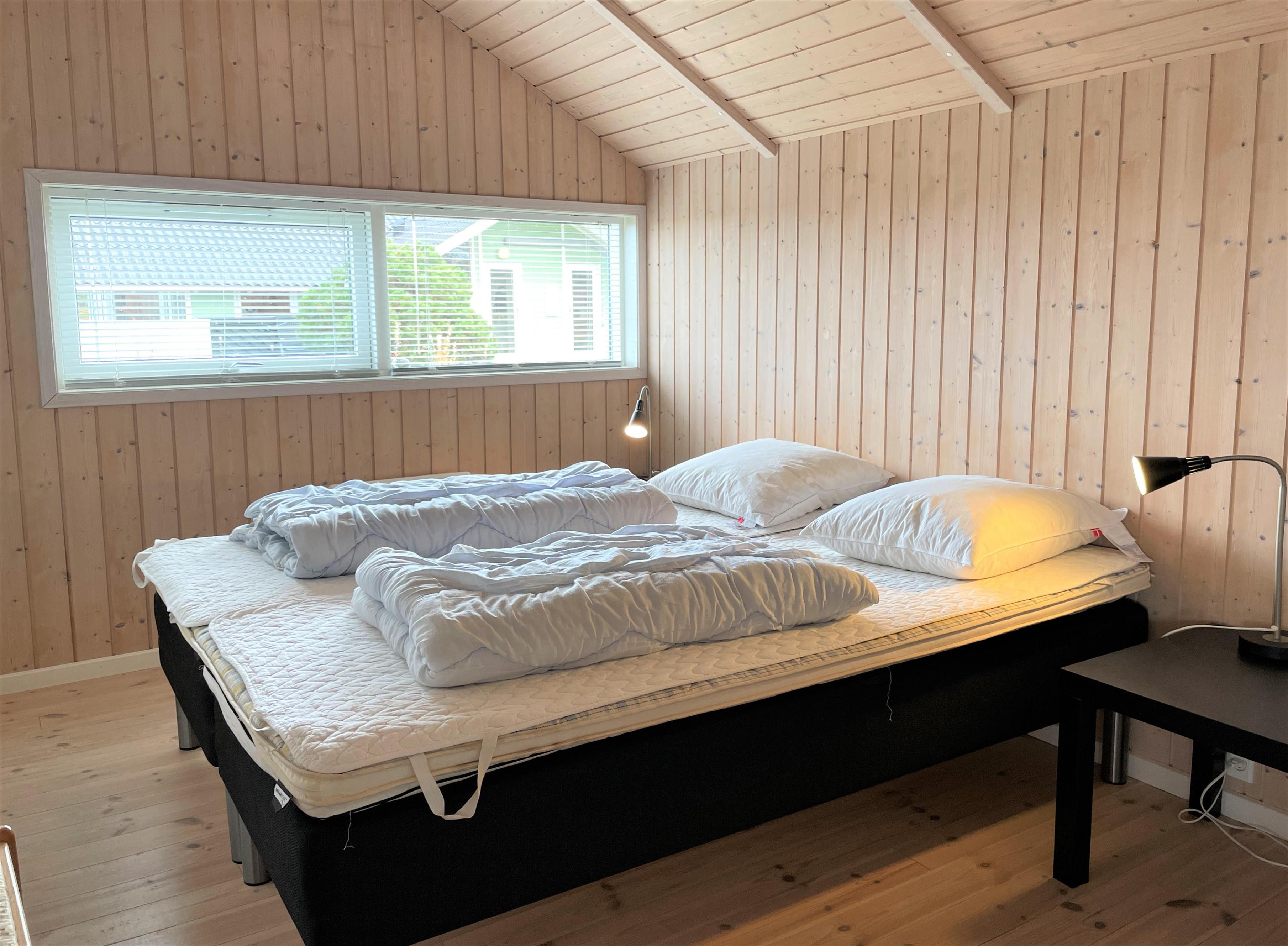 Das Haus hat drei Schlafzimmer mit beziehungsweise Dobbeltbetten und Etagenbetten. Schönes Badezimmer mit Whirlpool und Sauna.