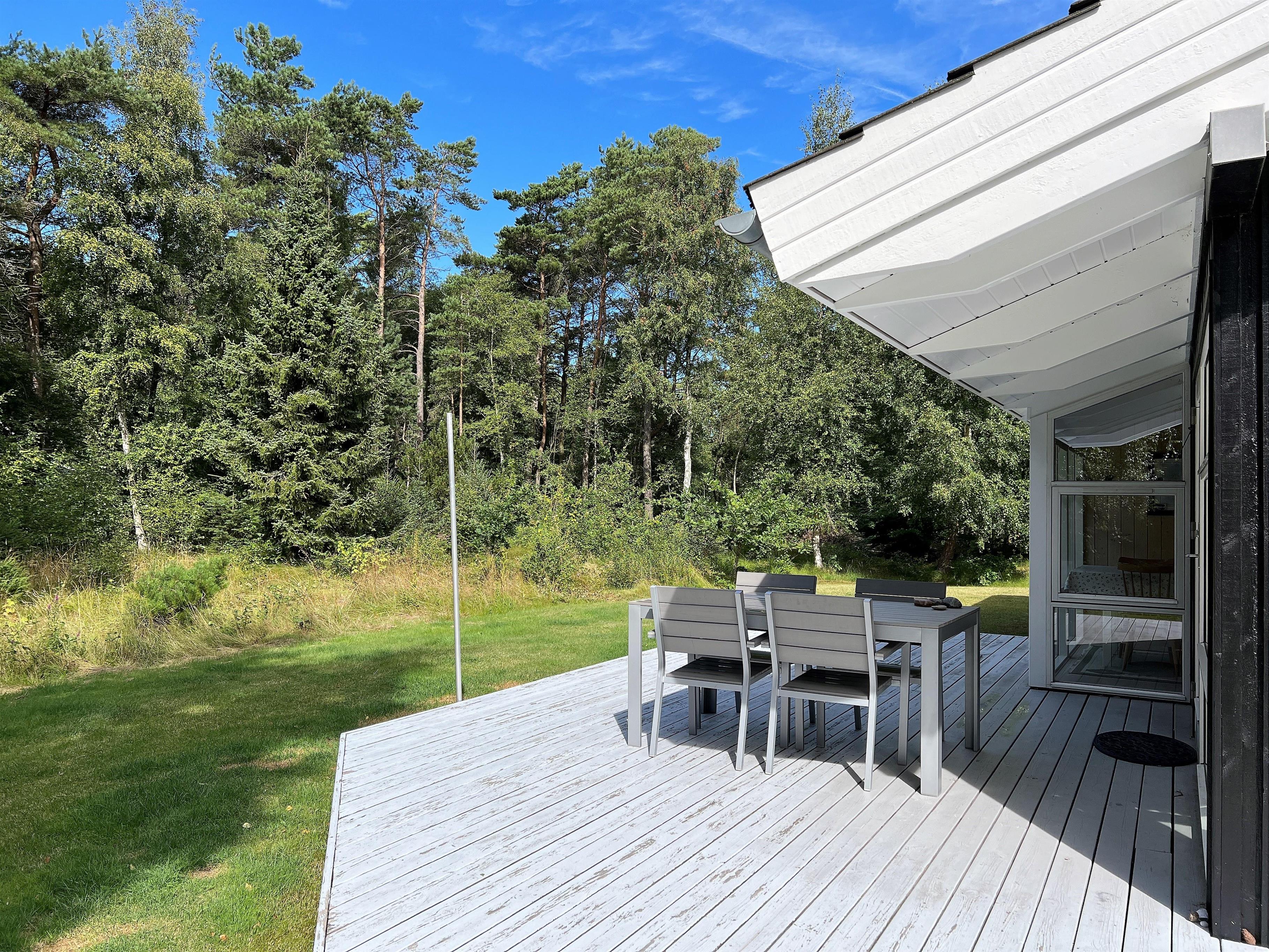 Das Haus liegt auf einem wunderschönen Naturgrundstück mit einer Rasenfläche rund um das Haus und einer schönen sonnigen Holzterrasse mit Sonnensegel für die Terrasse. Ein schönes, privates Grundstück in ruhiger Umgebung.