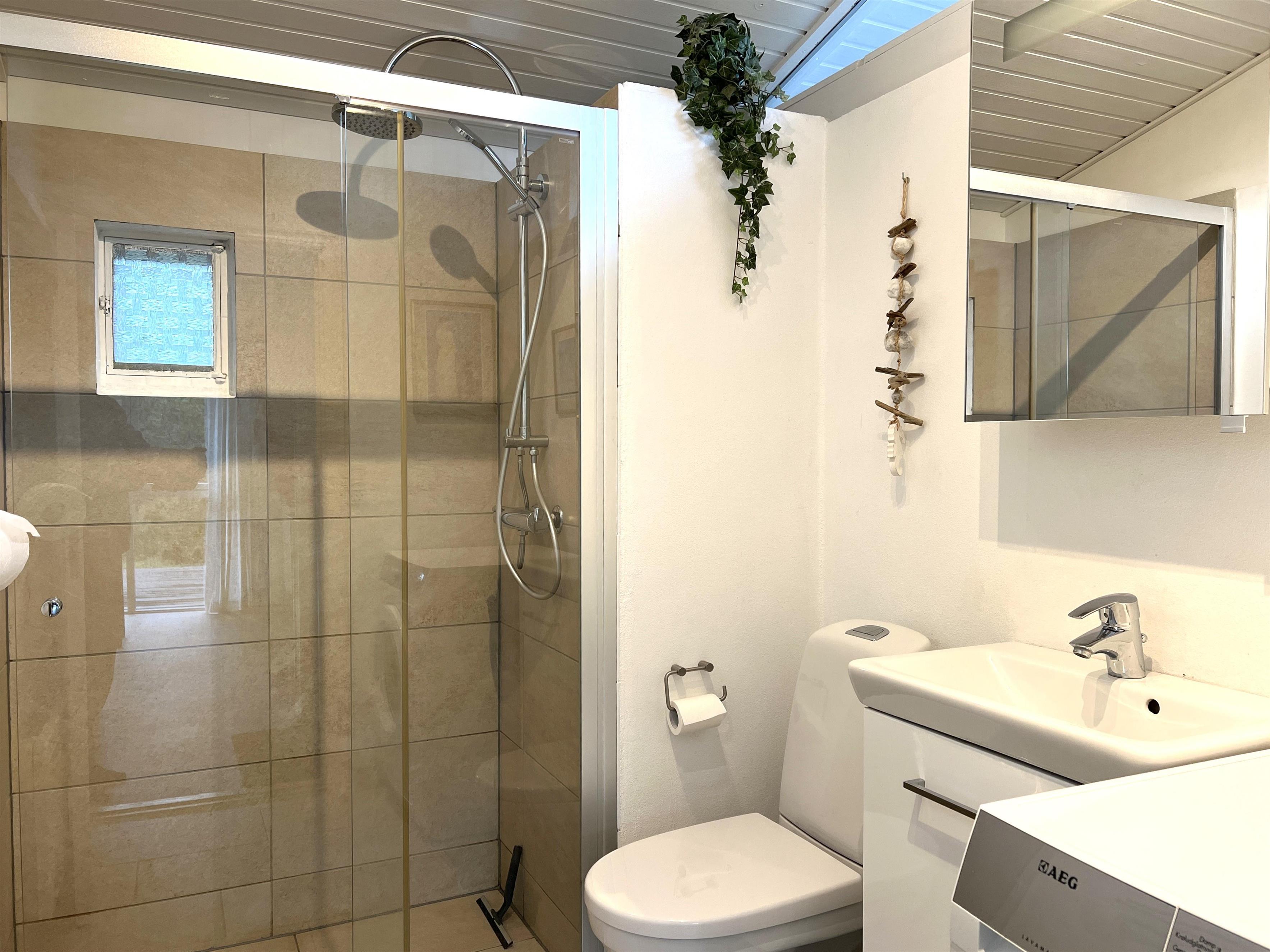 Schönes Badezimmer mit Dusche. Schöne Holzterrasse rund um das Haus, hier finden Sie leicht einen sonnigen Liegeplatz.