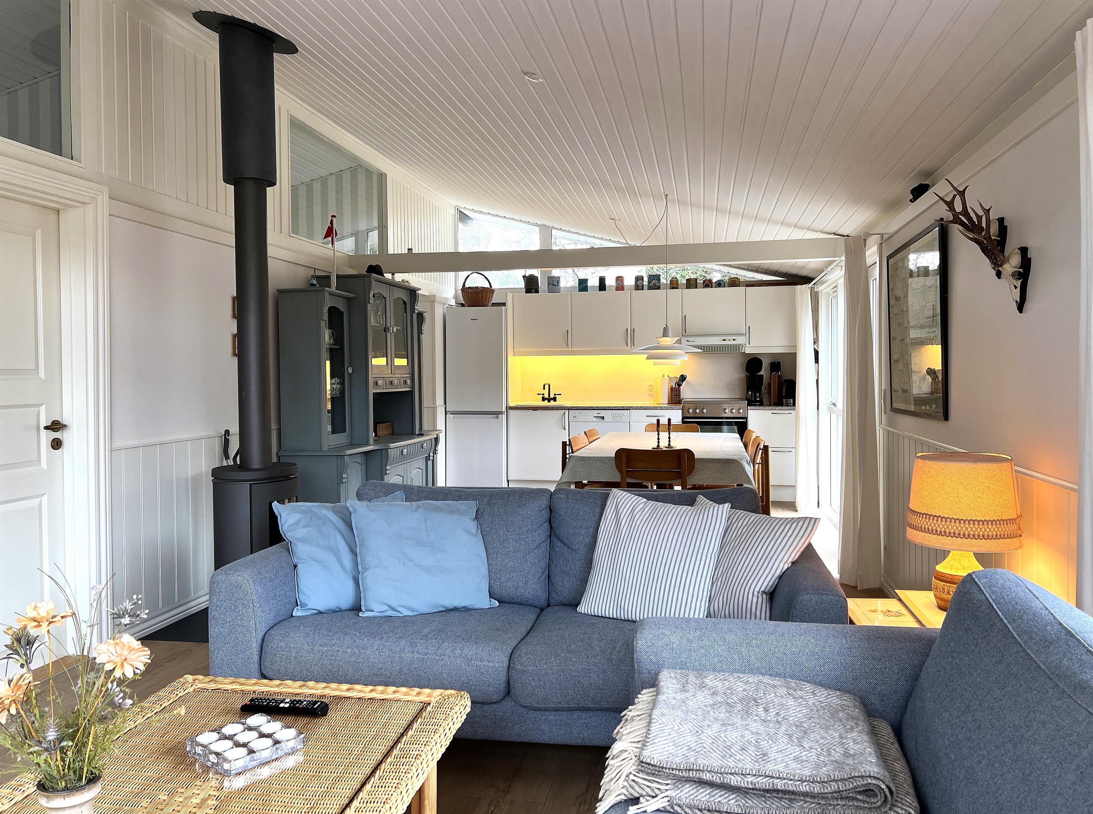 Das Haus verfügt über eine schöne helle Küche und ein gemütliches Wohnzimmer mit bequemen Möbeln und Holzofen.