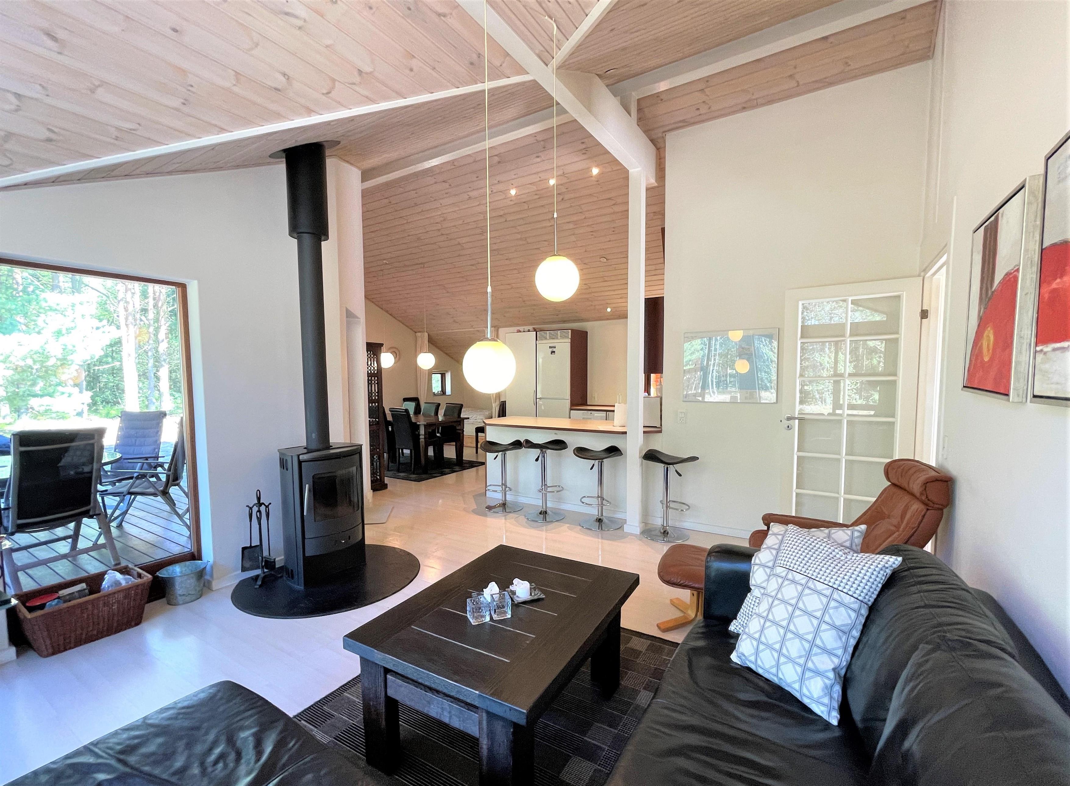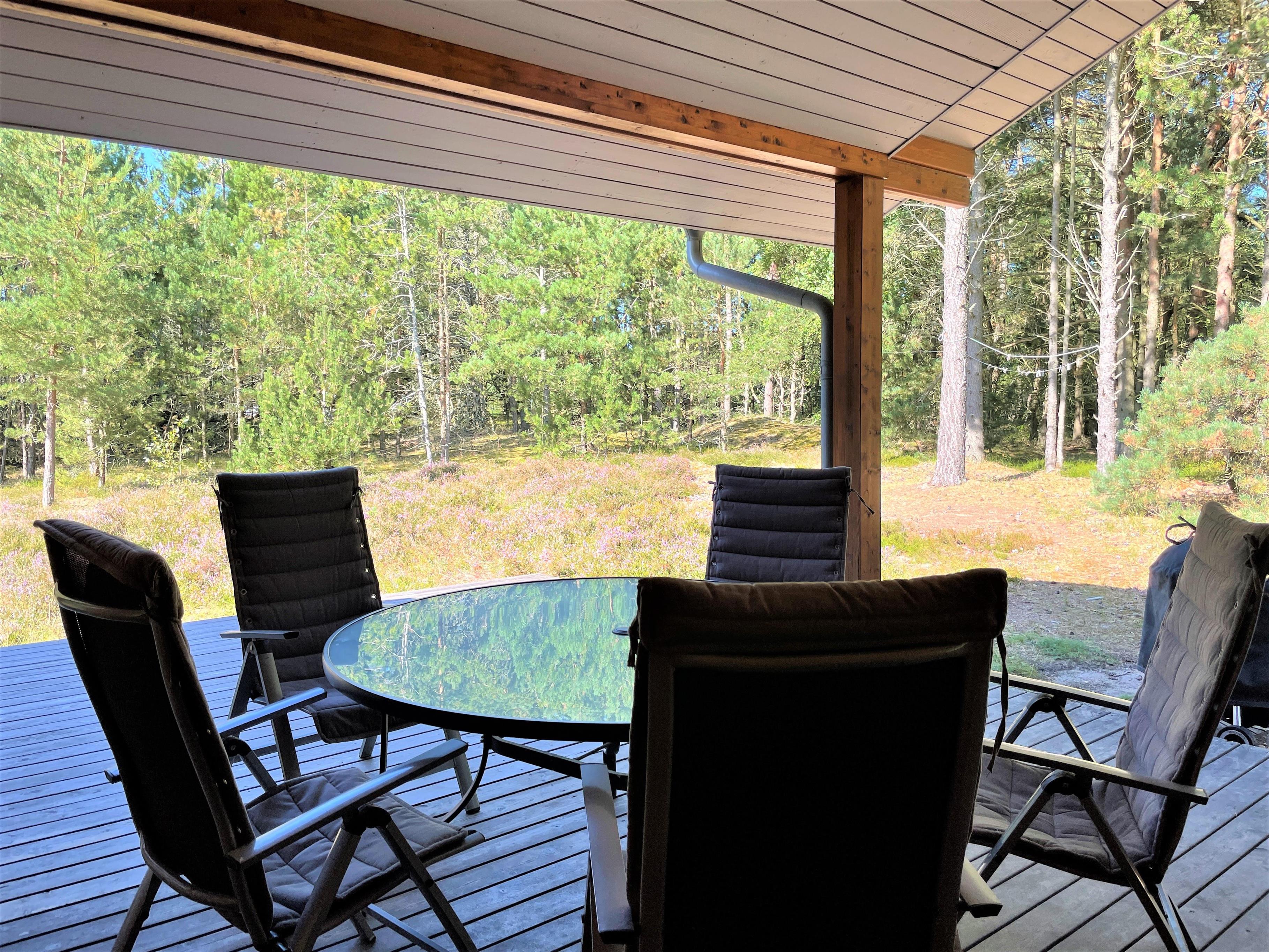Großes Holzsommerhaus in Læsø mit überdachter Terrasse, Kaminofen und Nähe zum Strand für erholsamen Urlaub in der Natur.