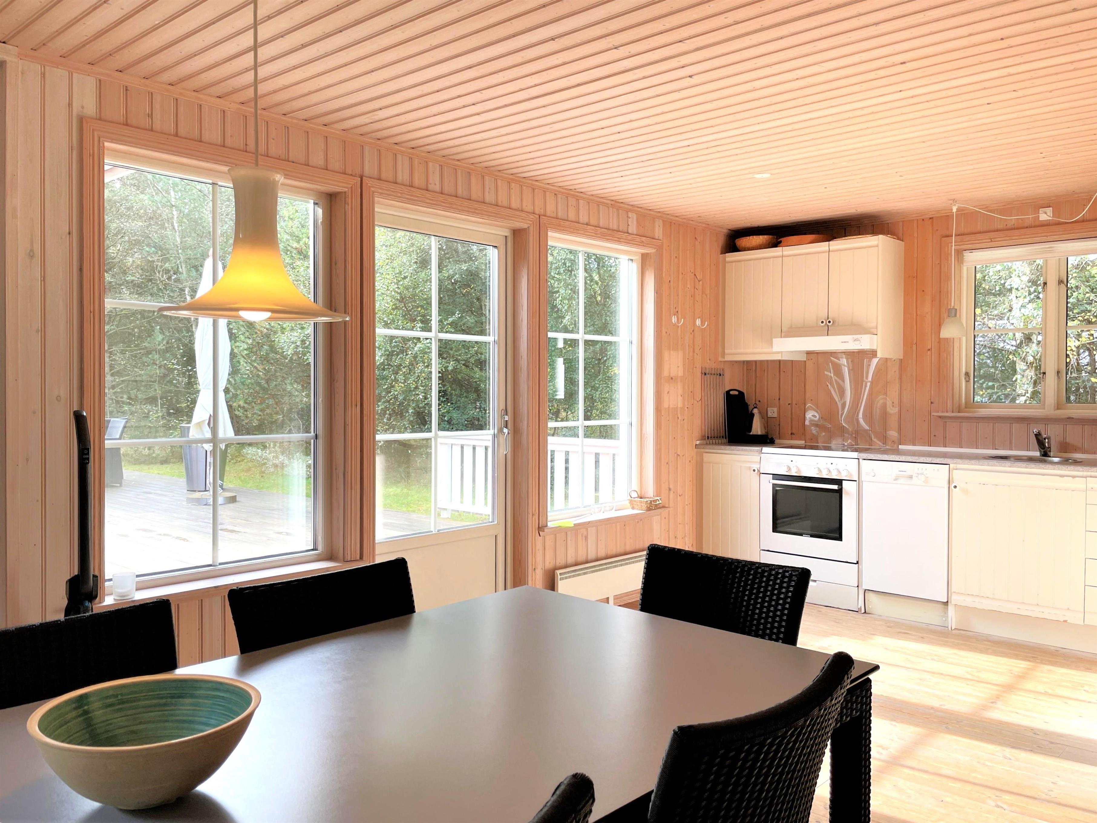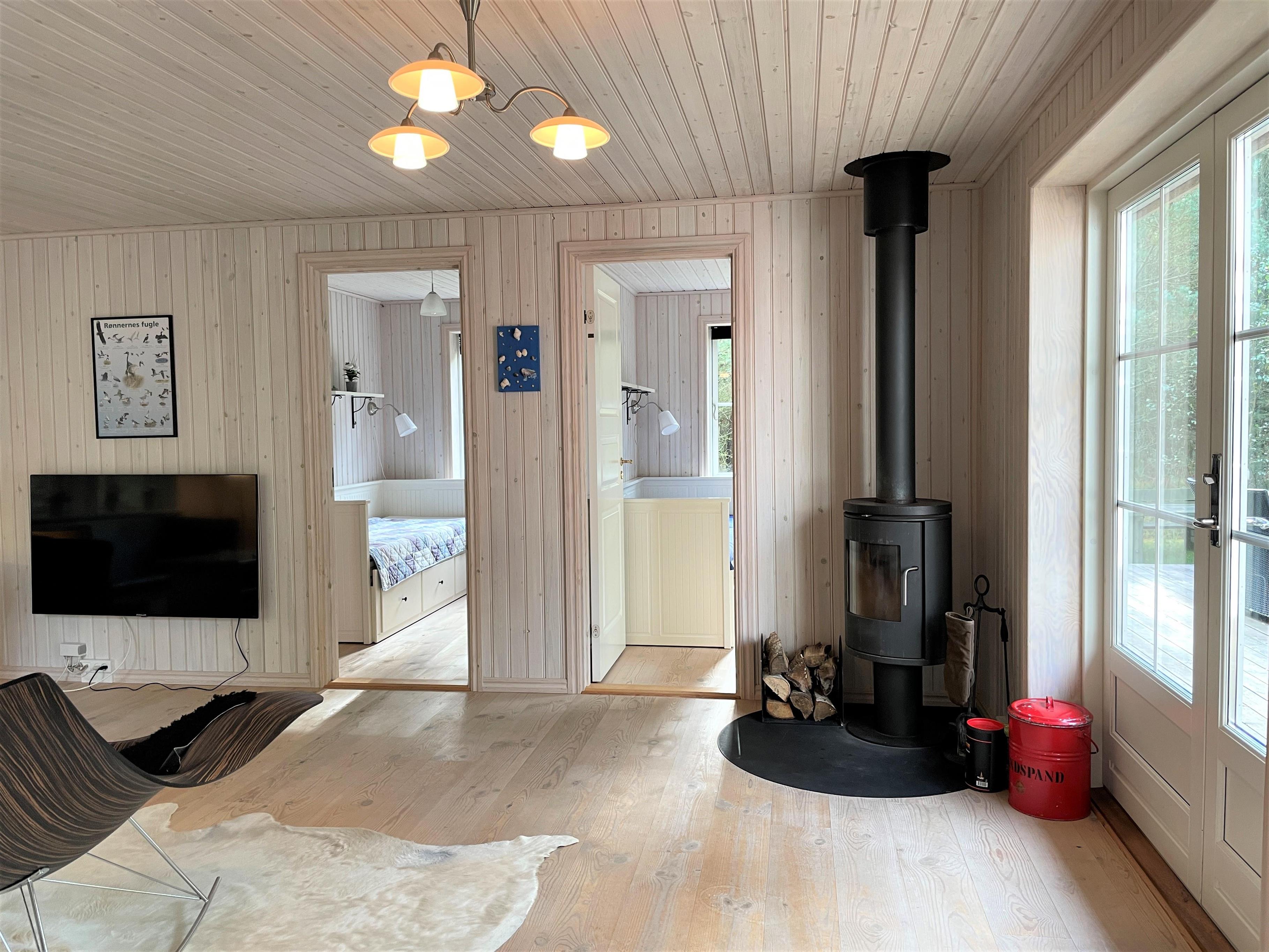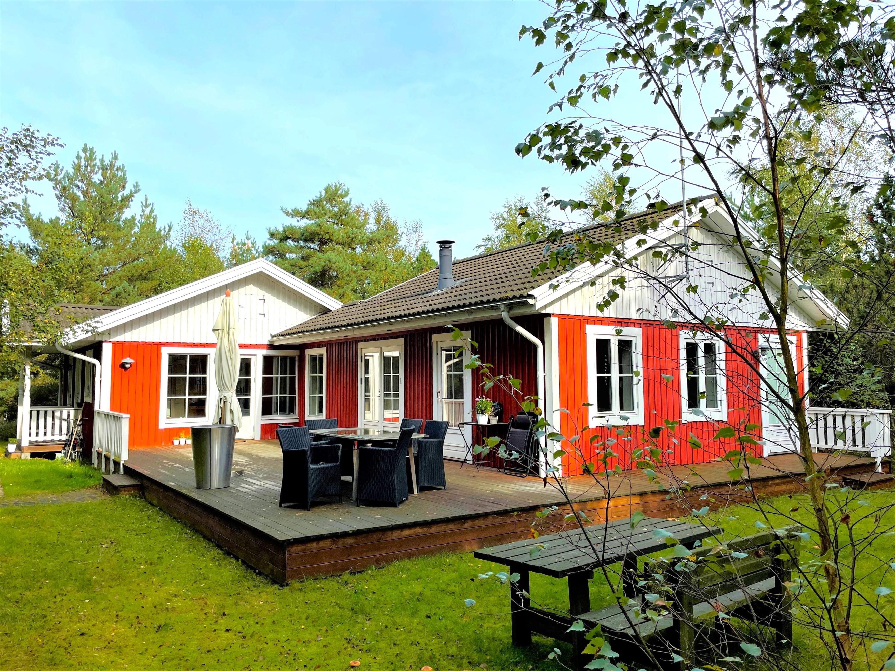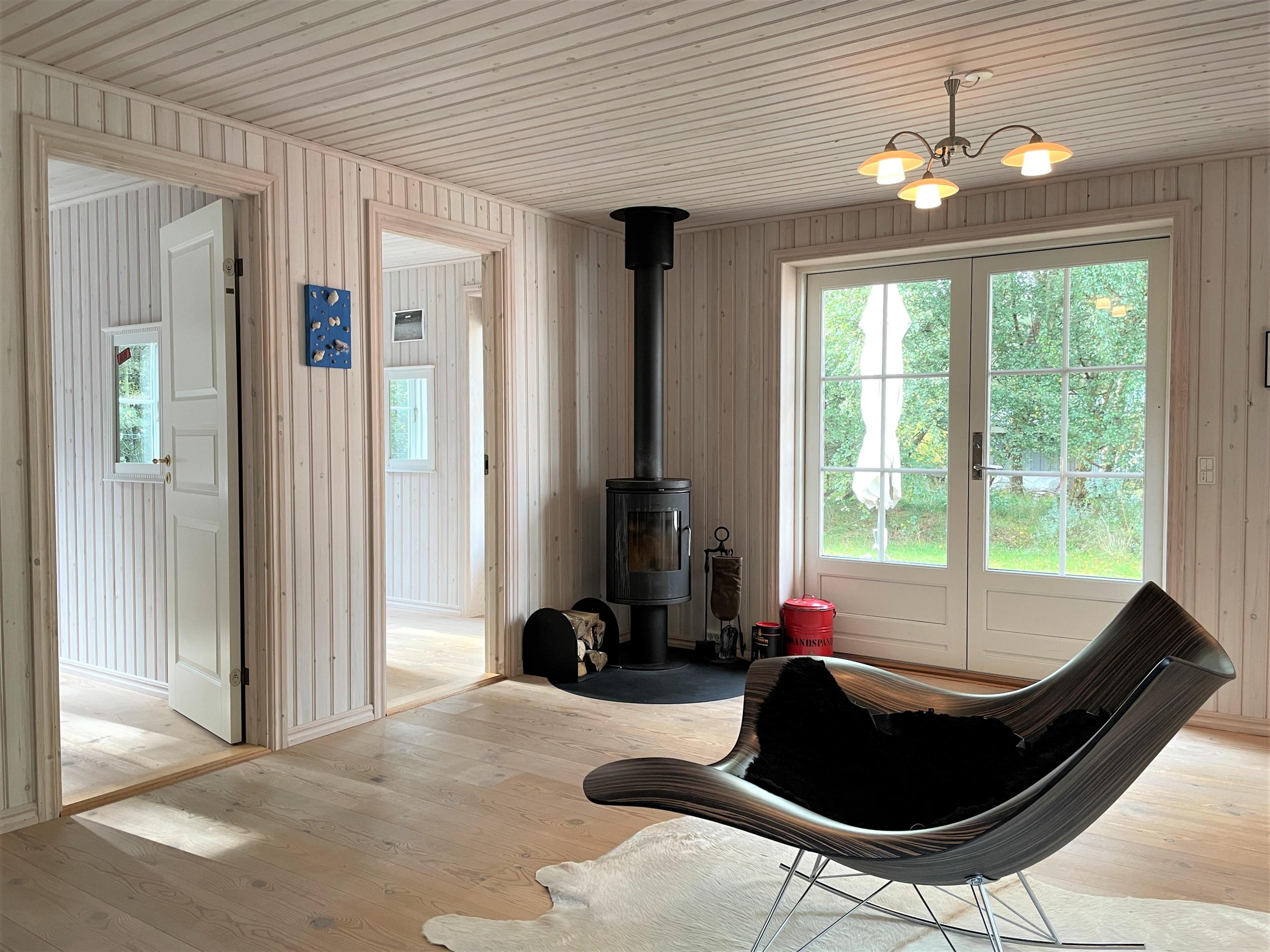 Schönes und gepflegtes Holzhaus, hell und modern. Große Wohnküche mit Zugang zur Terrasse. Gemütliches Wohnzimmer mit Holzofen und von dort Zugang zur großen Holzterrasse. Badezimmer mit Duschecke und Fußbodenheizung. Ein Zimmer mit Doppelbett. Drei Zimmer mit ausziehbaren Schlafsofas.