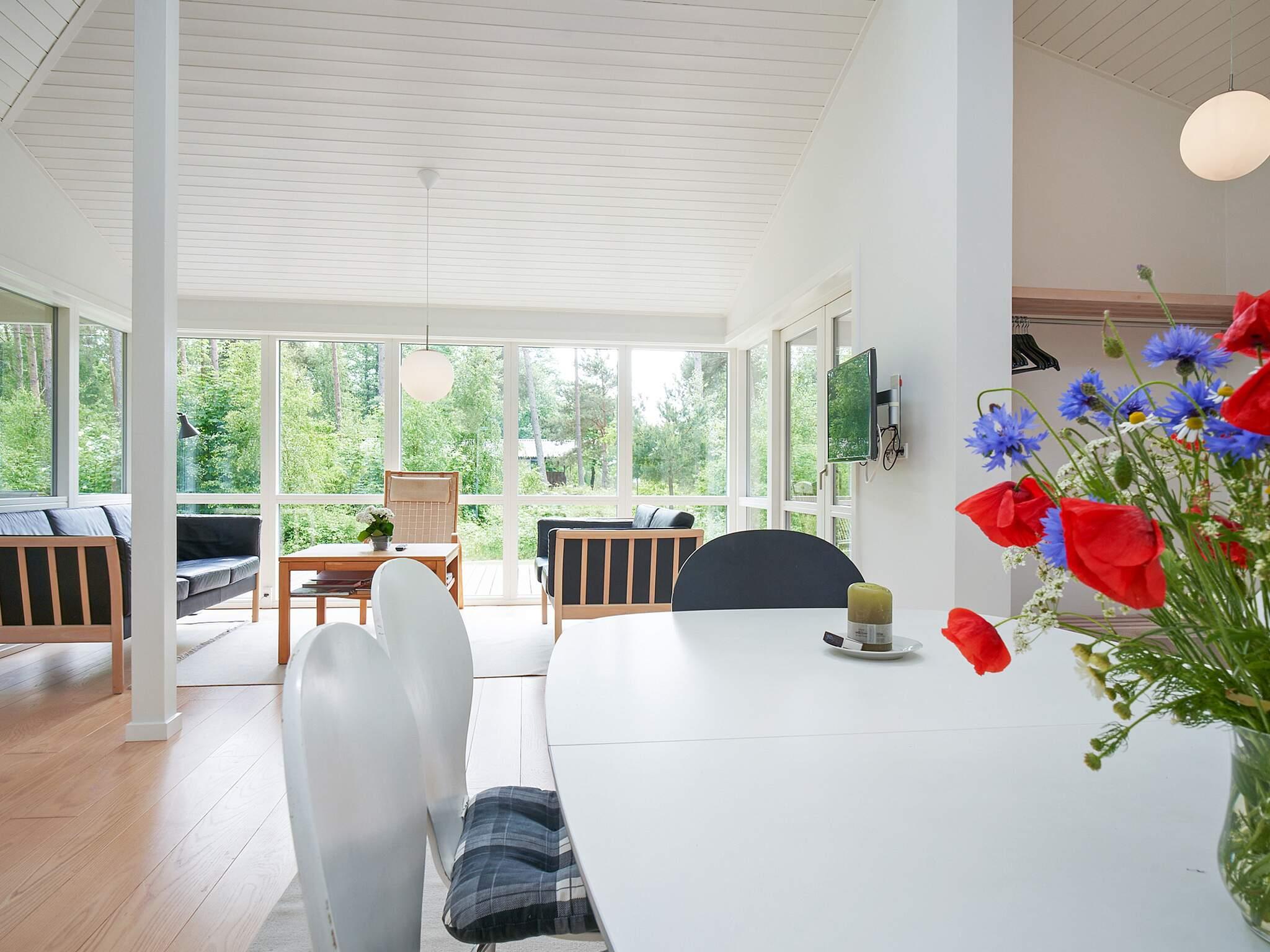 Das Ferienhaus präsentiert sich einladend und mit offener Aufteilung und kombiniertem Wohn- und Essbereich mit schönem Licht. Im Essbereich ist die Zimmerdecke besonders hoch und sorgt so für ein ganz besonders lichtes Ambiente. Es stehen außerdem drei Schlafzimmer und ein großes Badezimmer sowie eine Gästetoilette zur Verfügung. Im Wohnbereich mit bequemem Mobiliar hat man durch die großen Fensterpartien nach Süden schönen Ausblick in die Bornholmer Natur. Offene Küche mit allen modernen Geräten für die Selbstverpflegung.