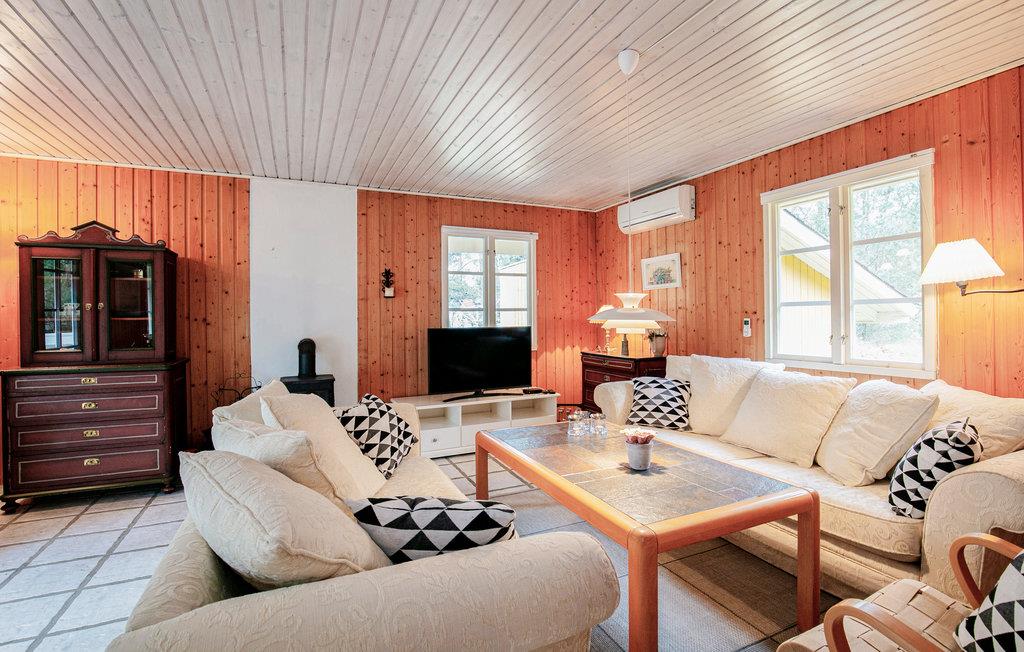 Gemütliches und gut ausgestattetes Holzhaus mit schönem Wohnzimmer. Das Ferienhaus liegt in einer kinderfreundlichen Gegend ganz in der Nähe von Wald und Strand.