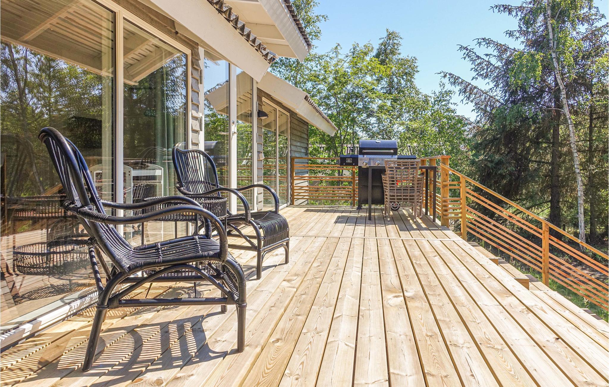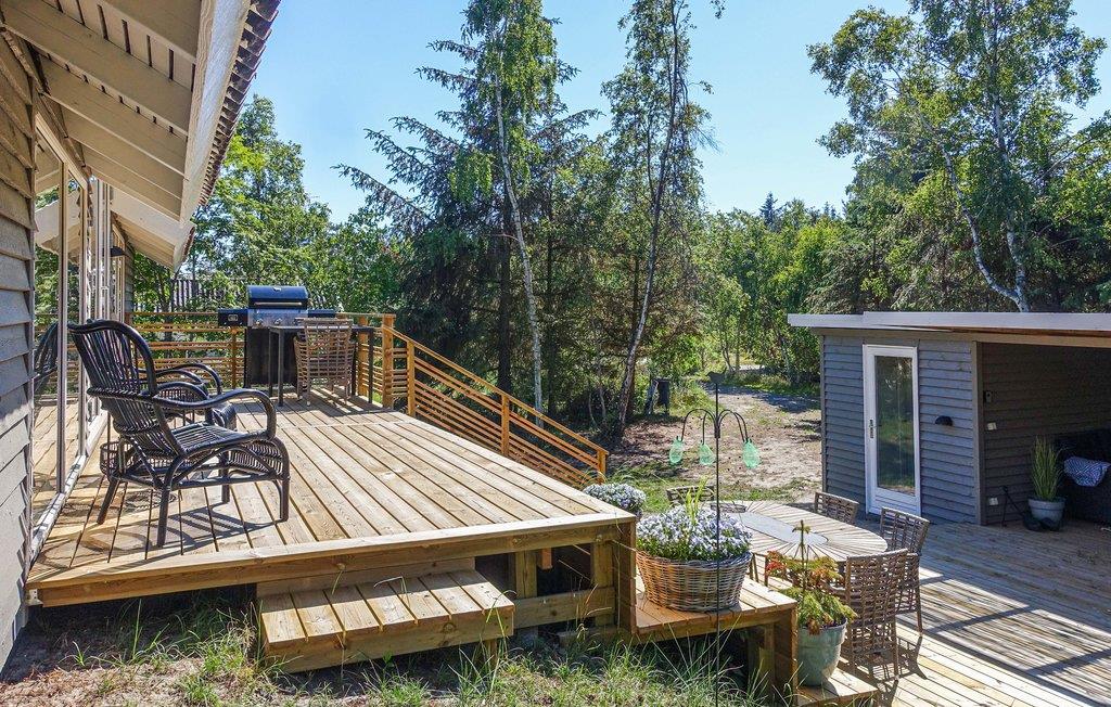 Draußen bietet das Haus auf mehreren Etagen schöne Holzterrassen, auch mit überdachtem Bereich mit Loungemöbeln sowie einer sonnigen Terrasse mit Outdoormöbeln und einem Gasgrill für gemeinsame Grillabende. Ihre Kinder können sich auf dem Gelände so richtig austoben.