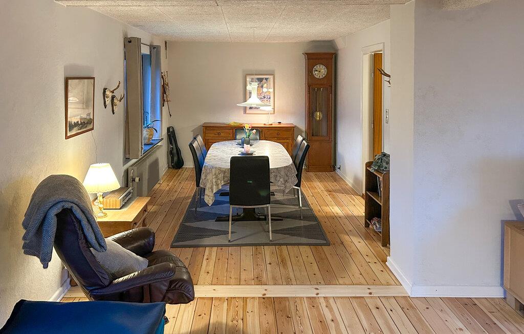 Ihr Ferienhaus bietet Ihnen die Möglichkeit, sich eine Pause vom Alltag zu gönnen und die Umgebung in Ihrem eigenen Tempo zu erkunden. Machen Sie es sich im großzügigen Wohnbereich gemütlich. Die Holzböden und die warme Einrichtung sorgen für eine behagliche Atmosphäre. Verbringen Sie entspannte Abende auf dem Sofa und den Sesseln, lesen Sie ein Buch oder schauen Sie einen Film. Der angrenzende Essbereich lädt zu geselligen Mahlzeiten ein, die Sie in der praktischen Küche zubereiten können.