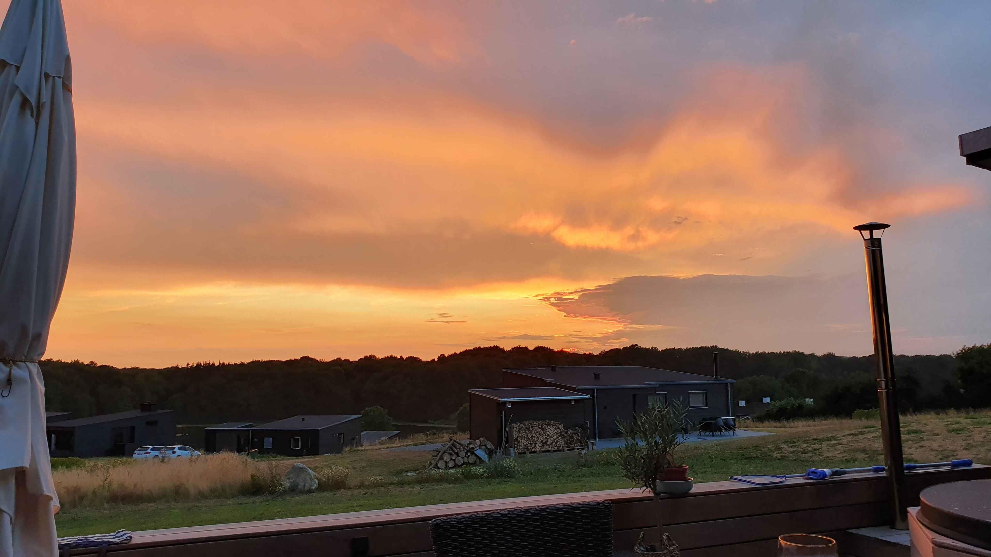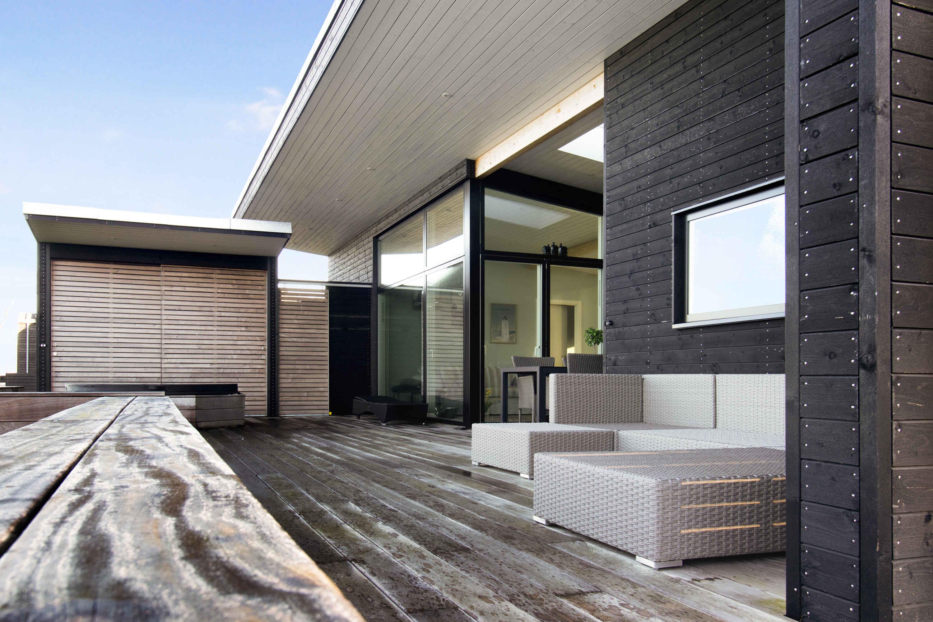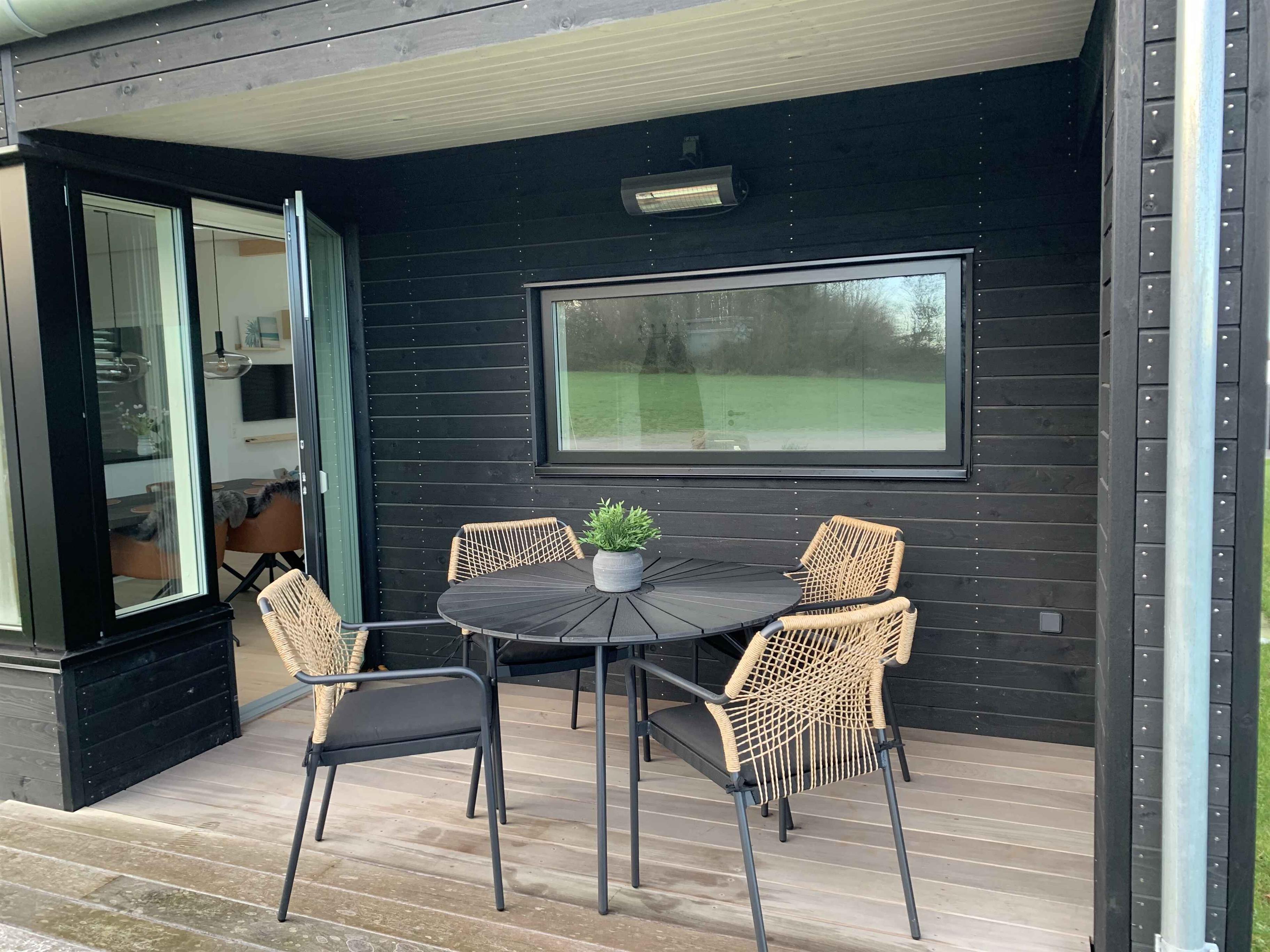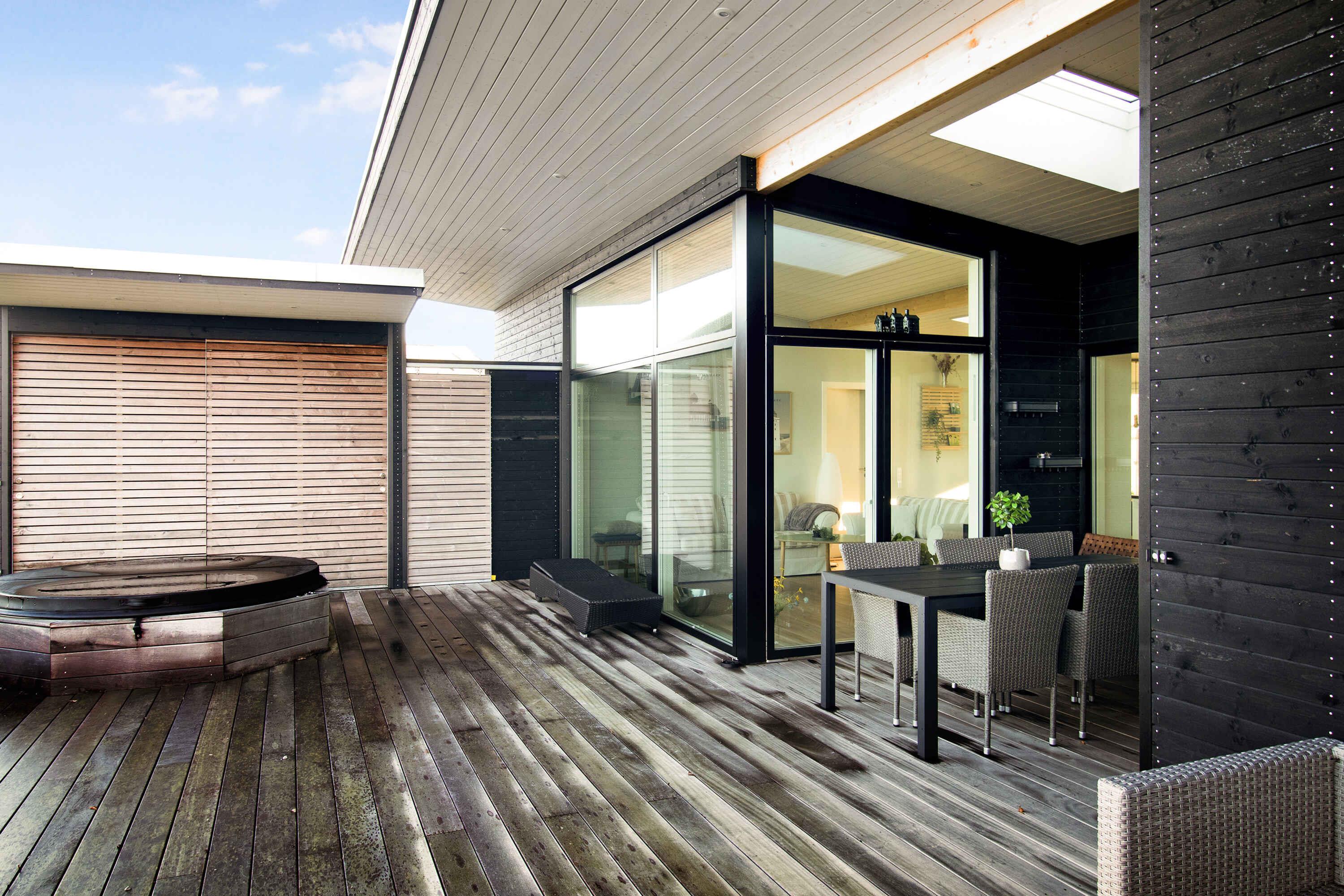 Neues hochmodernes Ferienhaus auf 100 m2 mit herrlicher Holzterrasse, Aussenwhirlpool und fantastischem Panoramablick auf Wald und Landschaft, nur 400 m vom Wasser entfernt. Platz für insgesamt 4 Personen.