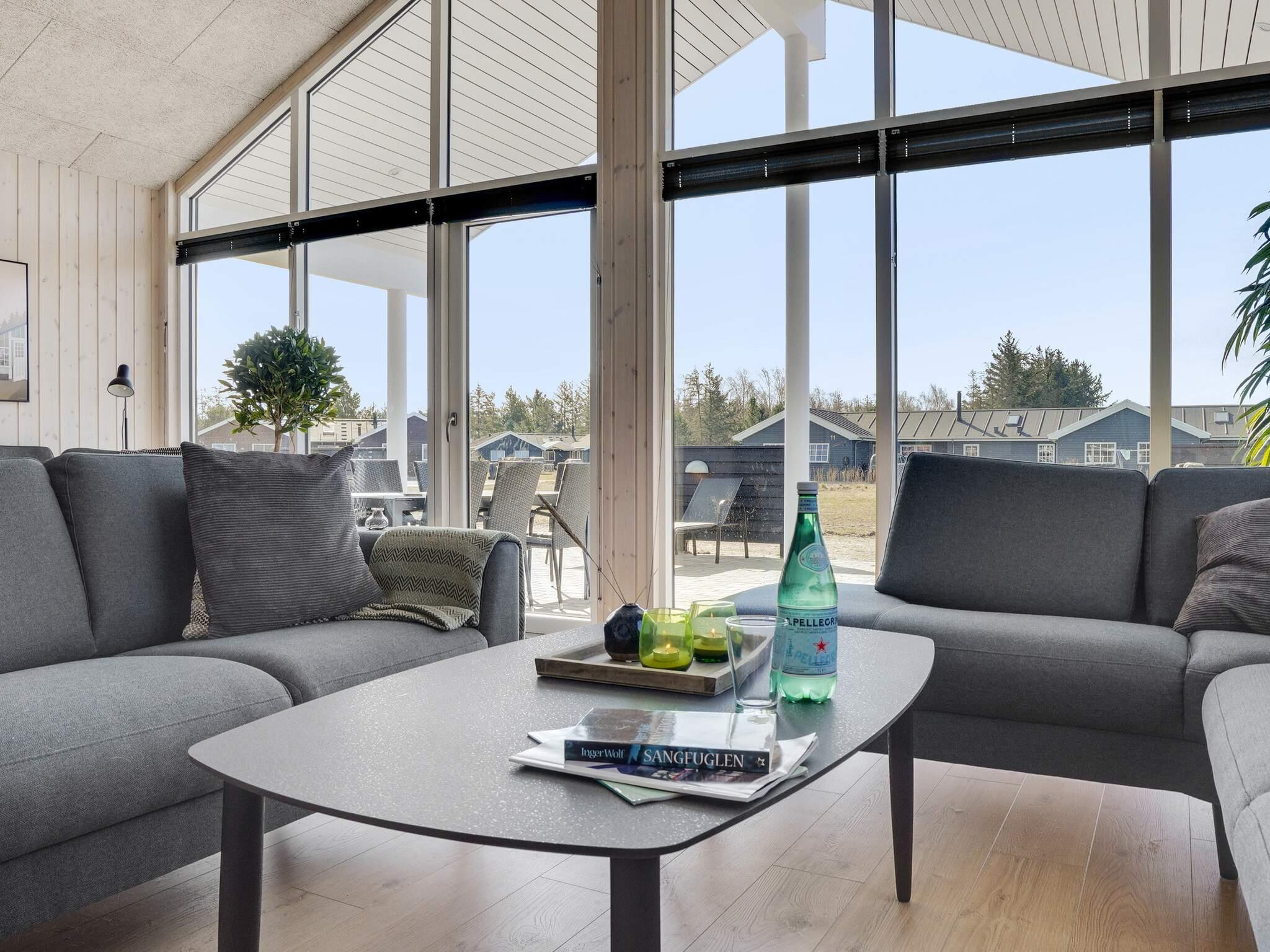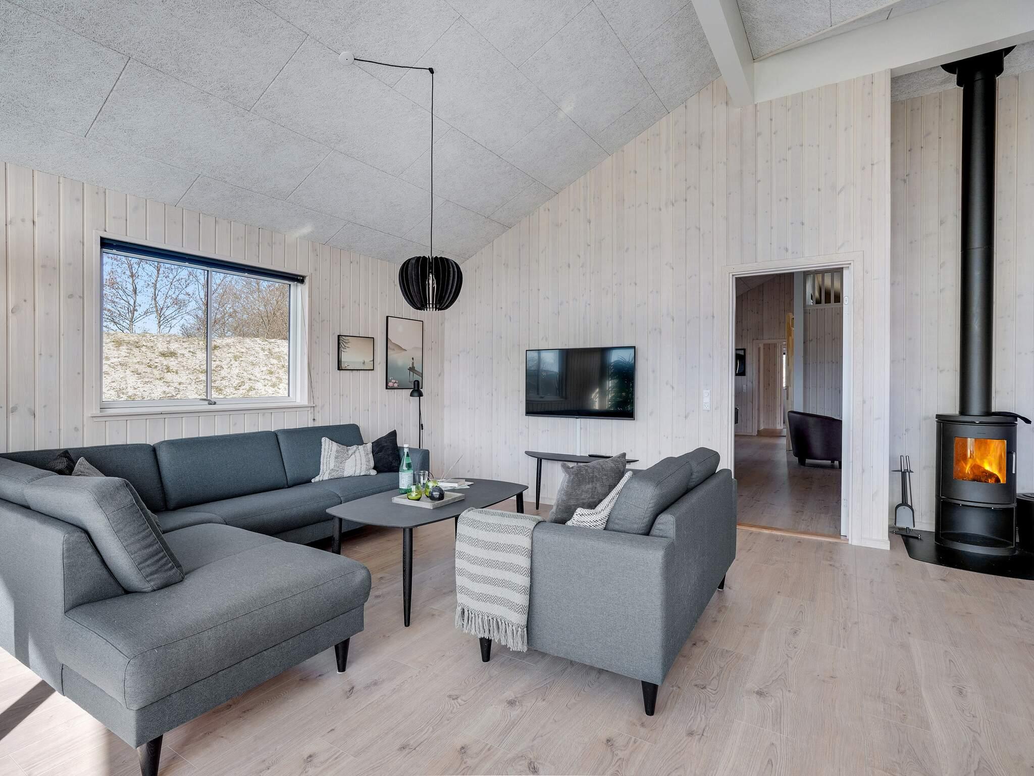 In der Wohnküche befindet sich auch die Sofagruppe, die in der Nähe des Holzofens des Ferienhauses steht, der an kühlen Tagen eine wohlige Wärme verbreitet.