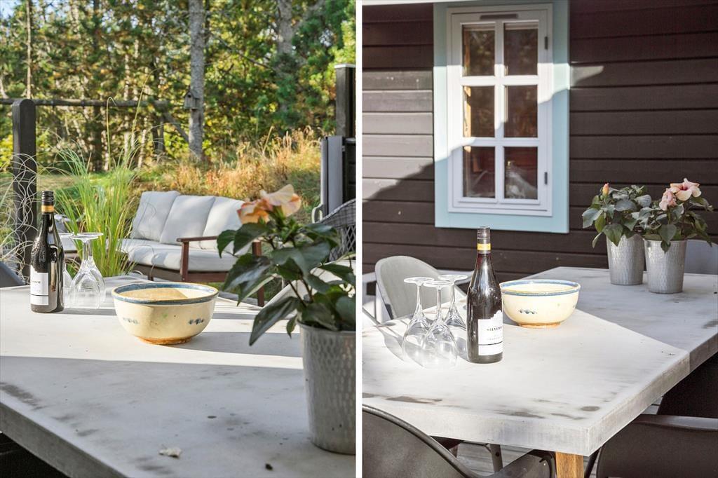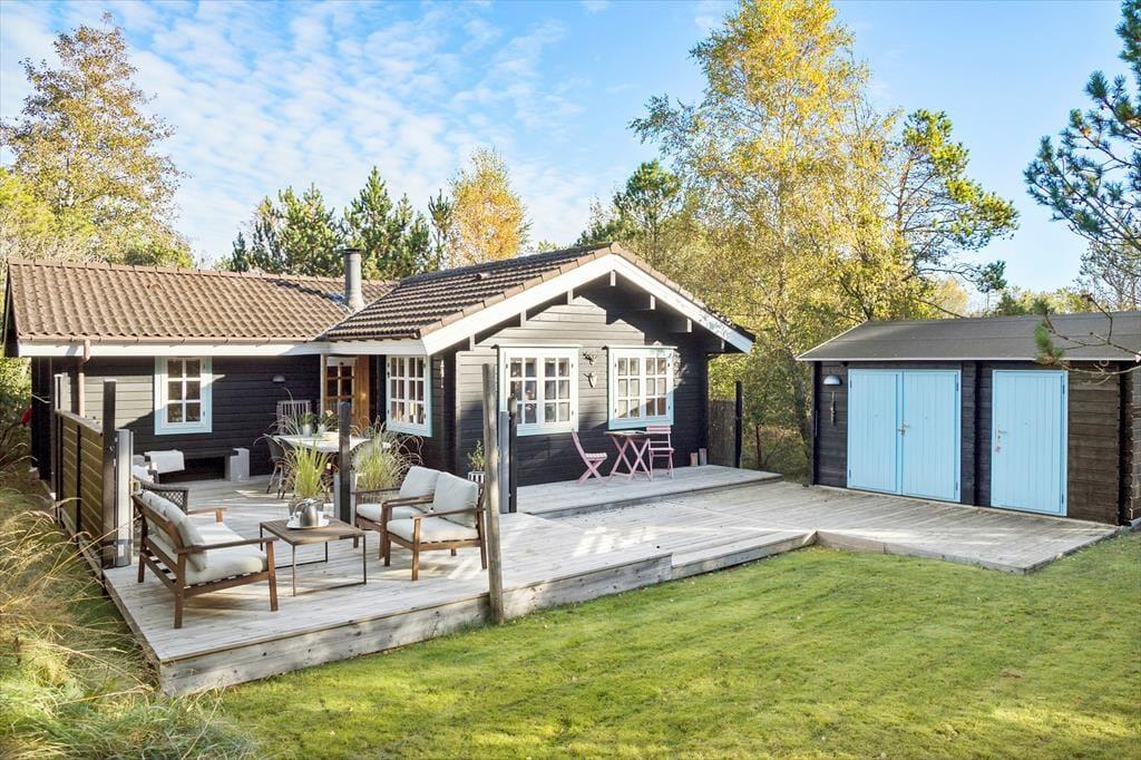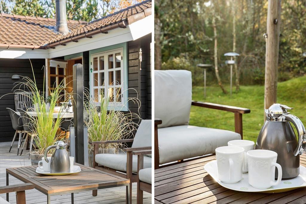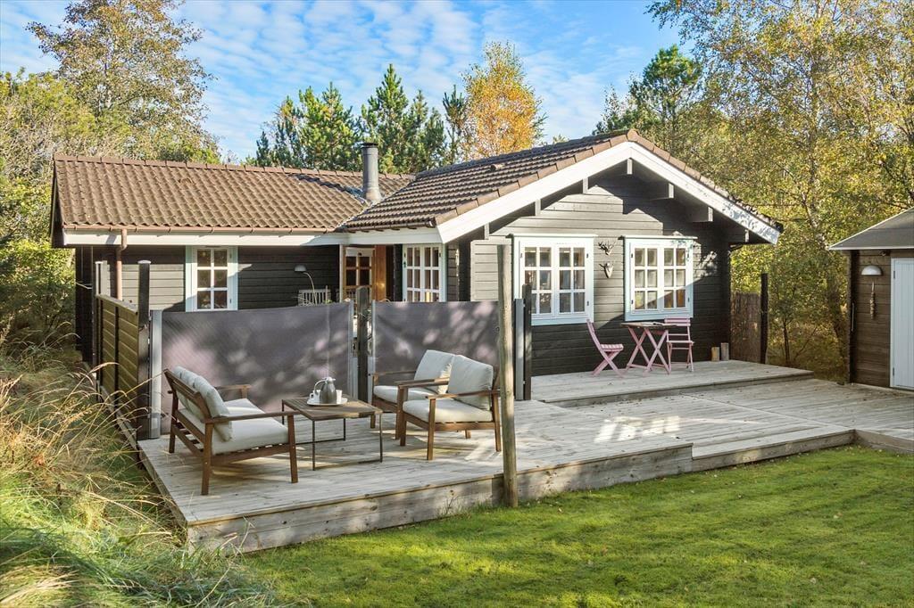 Das Ferienhaus liegt friedvoll platziert in einer Sackgasse, die an ein bewaldetes Gebiet grenzt. Dein Naturgrundstück wird ebenfalls durch Bäume geprägt. An die Südseite des Hauses schmiegt sich eine schöne Holzterrasse. Hier kannst du mit deinen Lieben in aller Ruhe und völlig ungestört sitzen, in der Sonne frühstücken und ein Mittagsschläfchen im Schatten des Sonnenschirms genießen. Abends lädt der hauseigene Grill zu gemütlichen Runden und stimmungsvollen Stunden ein. Während ihr euer Abendessen genießt, unterhalten euch garantiert die in den Bäumen sitzenden Vögel mit ihrem abendlichen Gesang.