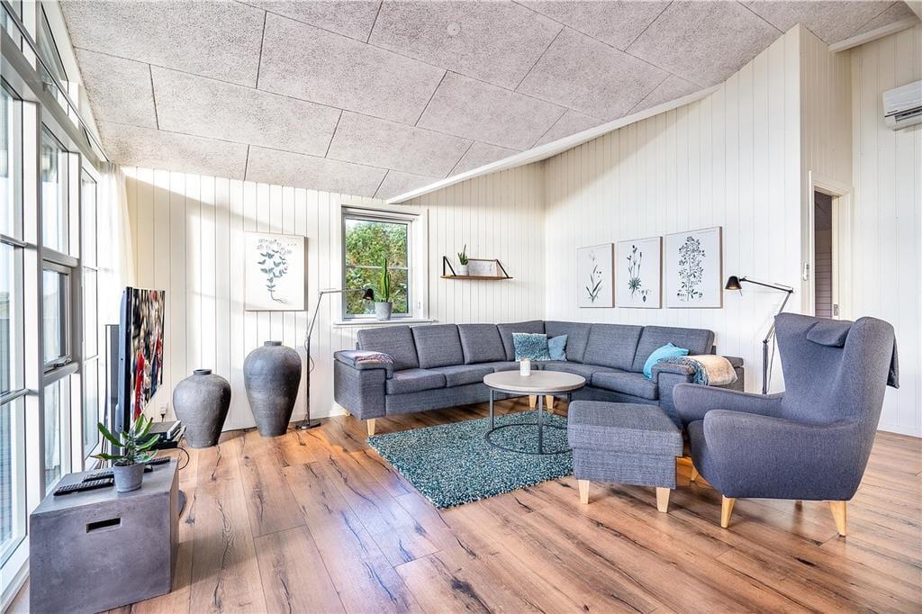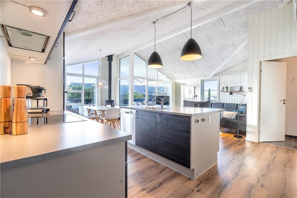 Das Ferienhaus ist mit drei Schlafzimmern ausgestattet, welche zusammen Platz für sechs Personen bieten. Das Badezimmer ist mit einer Dusche, einem Whirlpool und einer Sauna ausgestattet und bietet dadurch einen hervorragenden Wellness-Faktor. Neben der Eingangshalle verfügt der Rest des Hauses über einen offenen Wohnbereich, in dem Küche und Wohnzimmer zu einer Einheit verschmelzen, so dass Sie die idealen Voraussetzungen haben, um Ihren Urlaub in trauter Zweisamkeit zu genießen. Die Küche ist angenehm eingerichtet und an der Kücheninsel kann man ein Glas Wein genießen und dem Koch ein paar Tipps geben. Die Mahlzeiten werden gemütlich am Esstisch serviert, wo der Holzofen für Wärme sorgt. Das Wohnzimmer ist mit einer gemütlichen Sofalandschaft ausgestattet, und die Wärmepumpe, die Akustikdecken bis an die raumhohen Fenster sorgen für eine angenehme Atmosphäre.