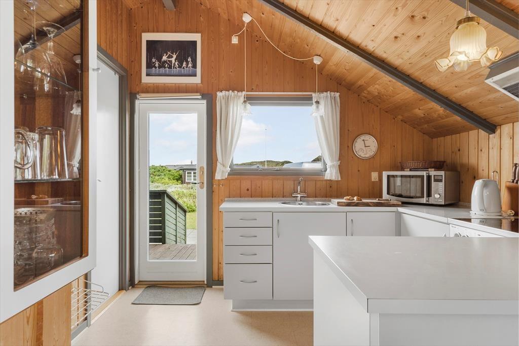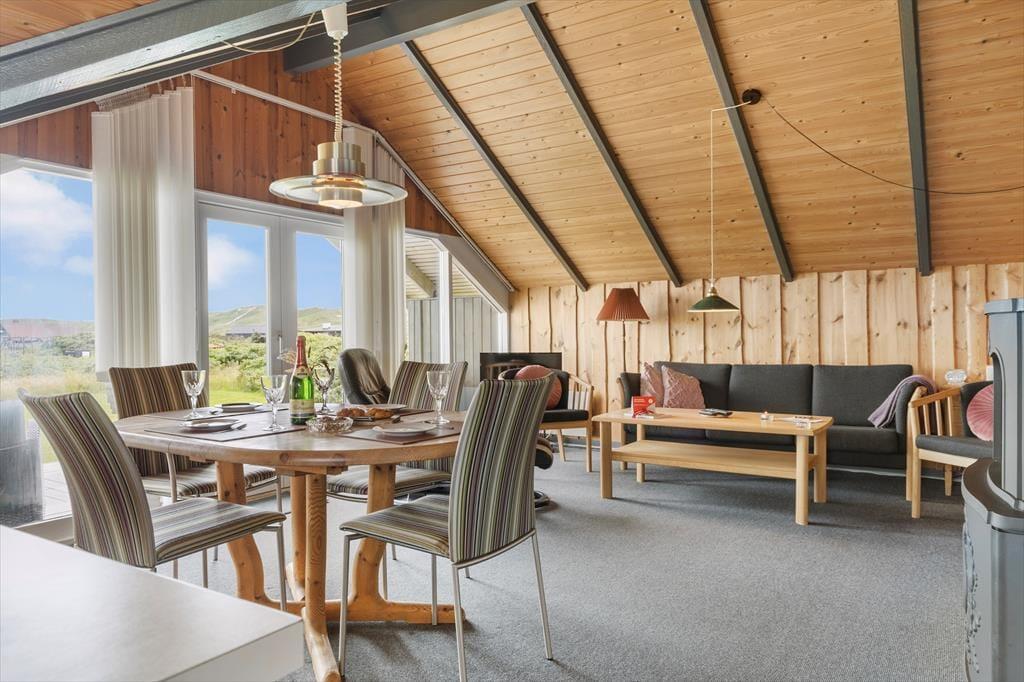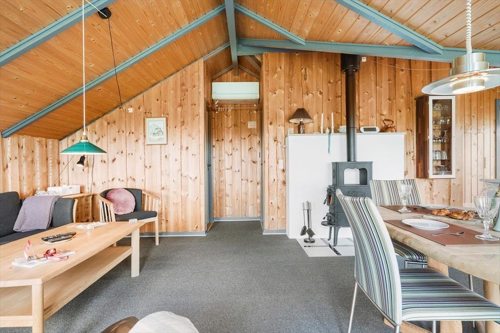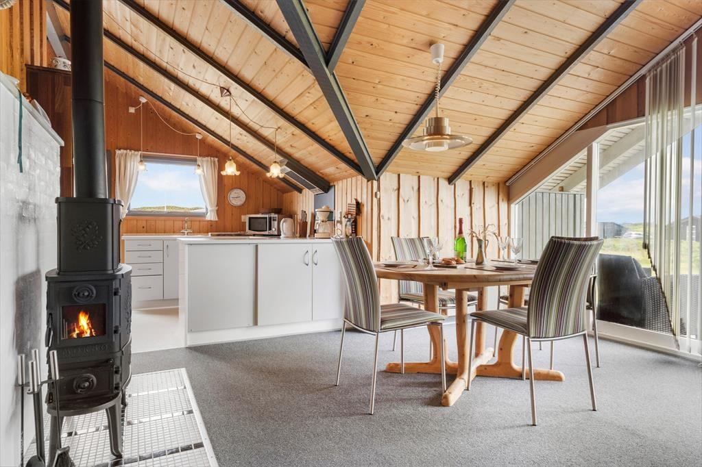 Das gemütliche, 54 m² große Ferienhaus beherbergt mit seinen beiden Schlafzimmern und dem Duschbadezimmer mit Fußbodenheizung und Waschmaschine bis zu vier übernachtende Urlauber. Der Rest der Wohnfläche ist dem stimmungsvollen Aufenthaltsraum mit einem Kaminofen, einer komfortablen Möblierung und einer guten, offen integrierten Küche überlassen. Wie der Rest des Hauses verfügt auch der Wohnraum über hohe Decken und rustikale Holzvertäfelungen. Die Giebelfenster gewähren einen Ausblick über die Dünenlandschaft und tragen somit maßgeblich zur schönen, klassischen Ferienhausatmosphäre bei.
