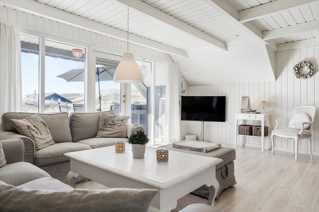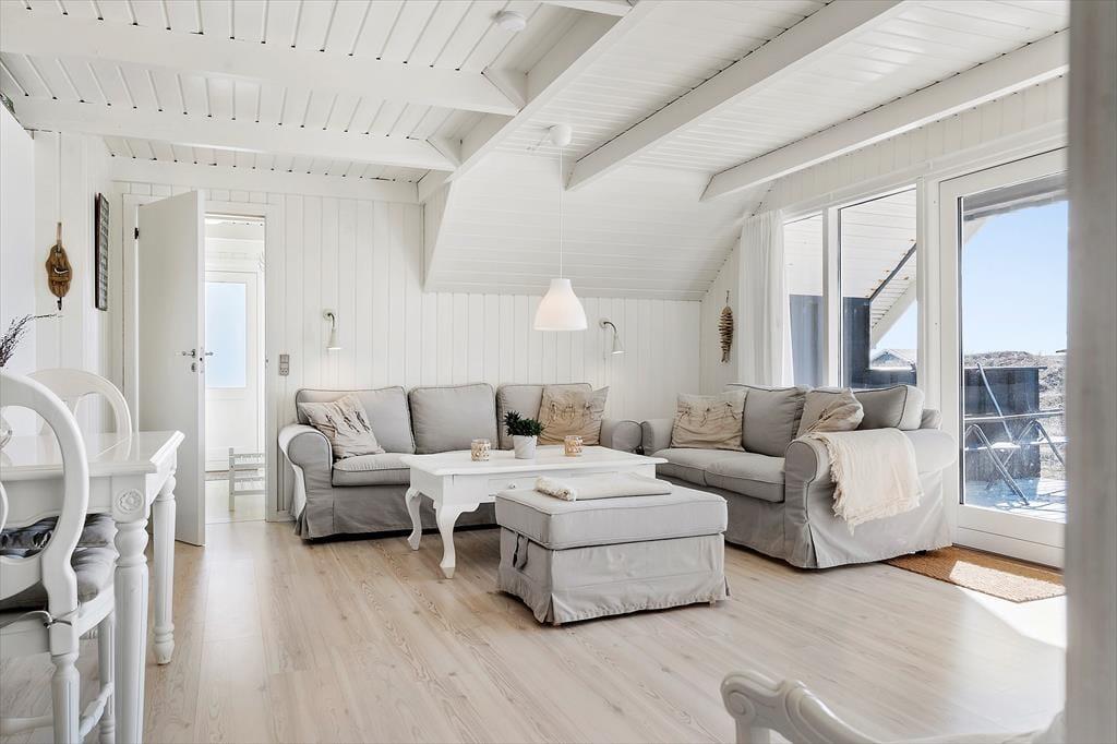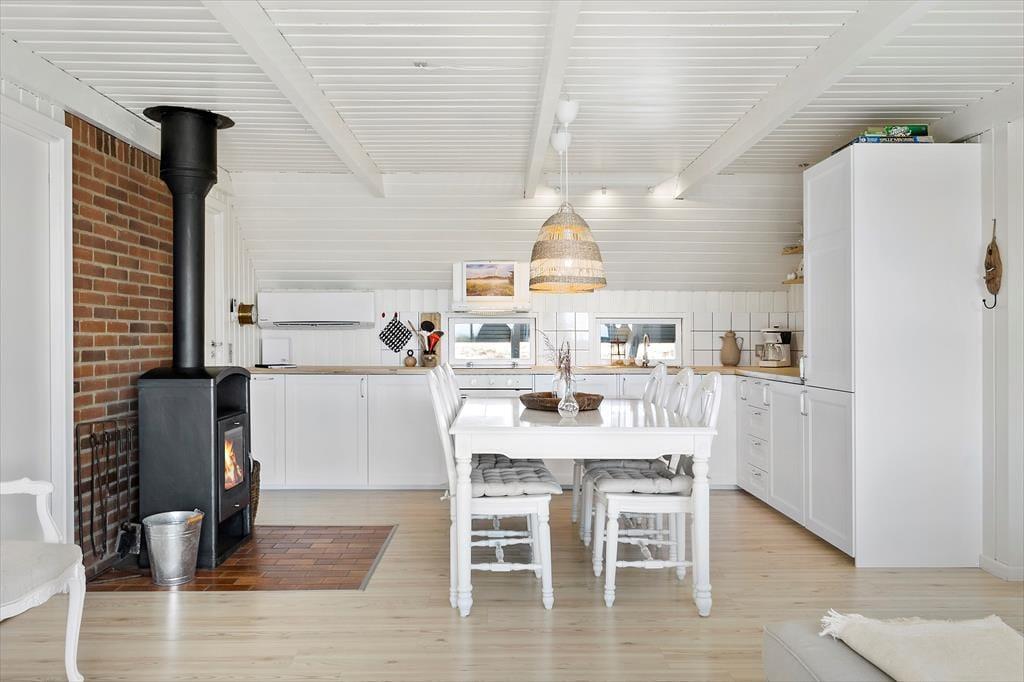 Nach einer Teilrenovierung im Jahr 2022 wirkt das Haus innen hell und einladend. Die Farbe Weiß zieht sich durch das ganze Haus - nicht nur in den drei Schlafzimmern und dem Duschbad, sondern auch im zentralen Wohnbereich des Hauses. Hier sind Wohnzimmer und Küche offen gestaltet, so dass Sie sich beim Kochen noch mit dem Rest der Familie unterhalten können. Wenn es Zeit zum Essen ist, können sich alle um den Esstisch versammeln, und danach kann man sich in der Sofaecke auf ein Kartenspiel oder einen Film vorbereiten. Im Wohnzimmer gibt es einen Holzofen, und Sie können auch die Wärmepumpe einschalten, die je nach Bedarf heizen oder kühlen kann.