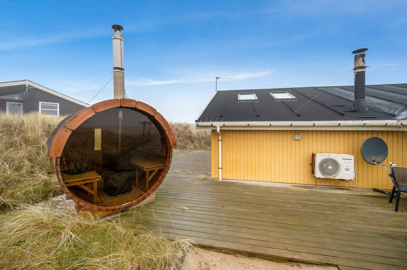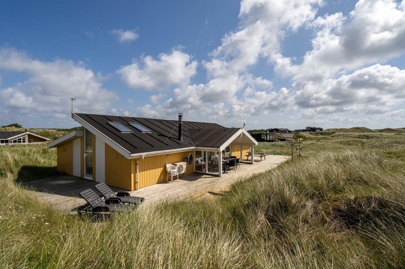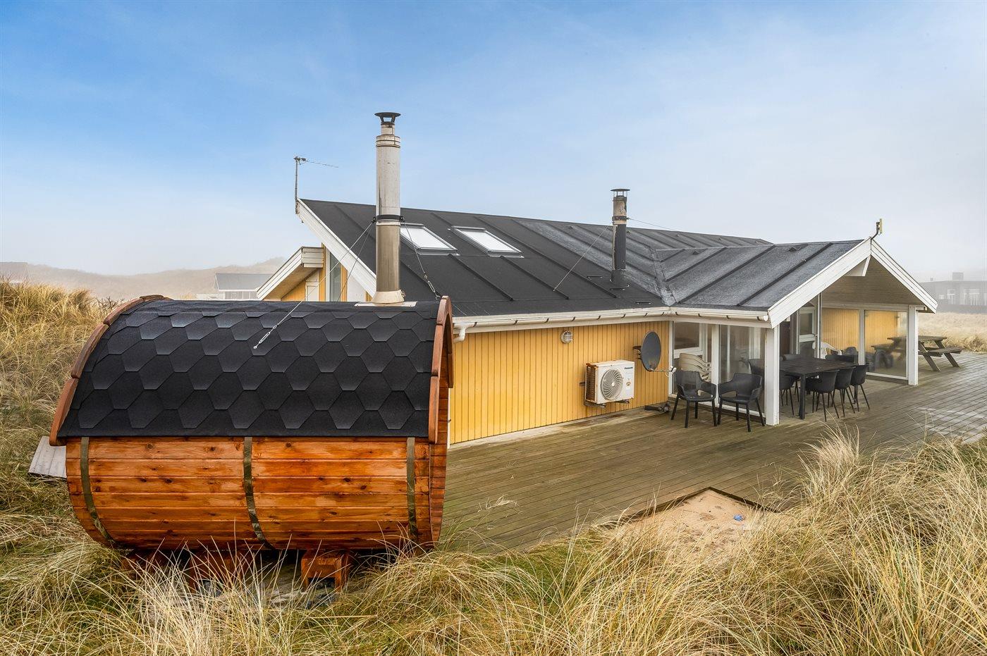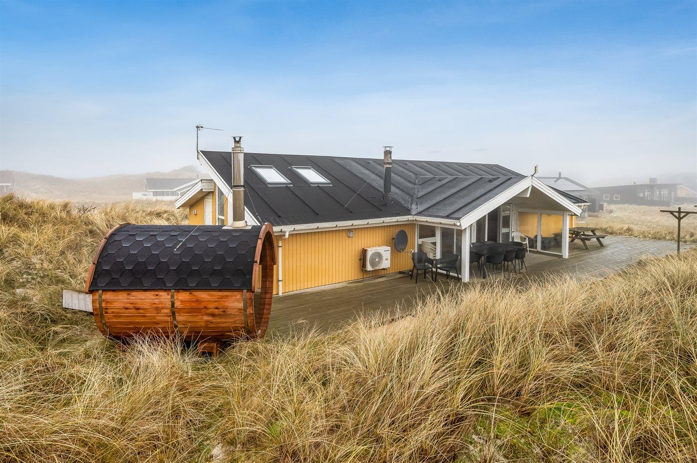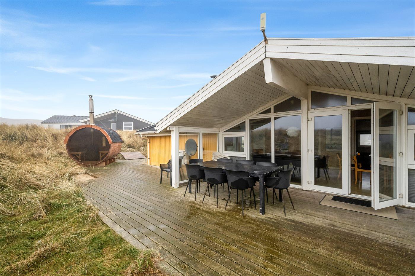 Auf der schmalsten Stelle der attraktiven Landzunge, Holmsland Klit, liegt dieses schöne Ferienhaus aus Holz mit u. a. Swimmingpool (4 x 3,3 x 1,4), Whirlpool und Outdoor-Sauna. Das Haus liegt auf einem Dünengrundstück, das an ein unter Naturschutz stehendes Dünengebiet grenzt - nur 100 m vom Wasser entfernt. Es gibt ein großes, teilweise überdachtes Terrassenareal mit Gartenmöbeln. Holzboden im Wohnzimmer, in der Küche, im Flur und den Zimmern. Das Haus enthält eine Pool-Abteilung mit Swimmingpool und Whirlpool. Von der Pool-Abteilung direkter Zutritt zu Duschnische und Gästetoilette. Darüber hinaus gibt es ein nettes Badezimmer mit Fußbodenheizung, Duschnische sowie Waschmaschine und Wäschetrockner. In der Küchenabteilung, die mit dem Wohnzimmer kombiniert ist, gibt es u. a. Kochinsel, Geschirrspüler, Mikrowelle und Tiefkühlgerät. Das gemütliche Wohnzimmer ist mit Kaminofen und TV mit digitalem Satellitenanschluss ausgestattet. Das Haus enthält auch 4 gute Schlafzimmer; hiervon 2 mit Doppelbetten und 2 mit je 2 Einzelbetten. An weiterer Ausstattung können kostenlose kabellose Internetverbindung (eigener Computer ist mitzubringen), Kinderbett sowie Kinderhochstuhl erwähnt werden und es ist eine energiegerechte Wärmepumpe installiert. Draußen Sandkasten für die Kinder. Ein herrliches Ferienhaus, das das ganze Jahr hindurch für sowohl 1 als auch 2 Familien geeignet ist. Nur wenige Min. Autofahrt zur Fischereistadt Hvide Sande.