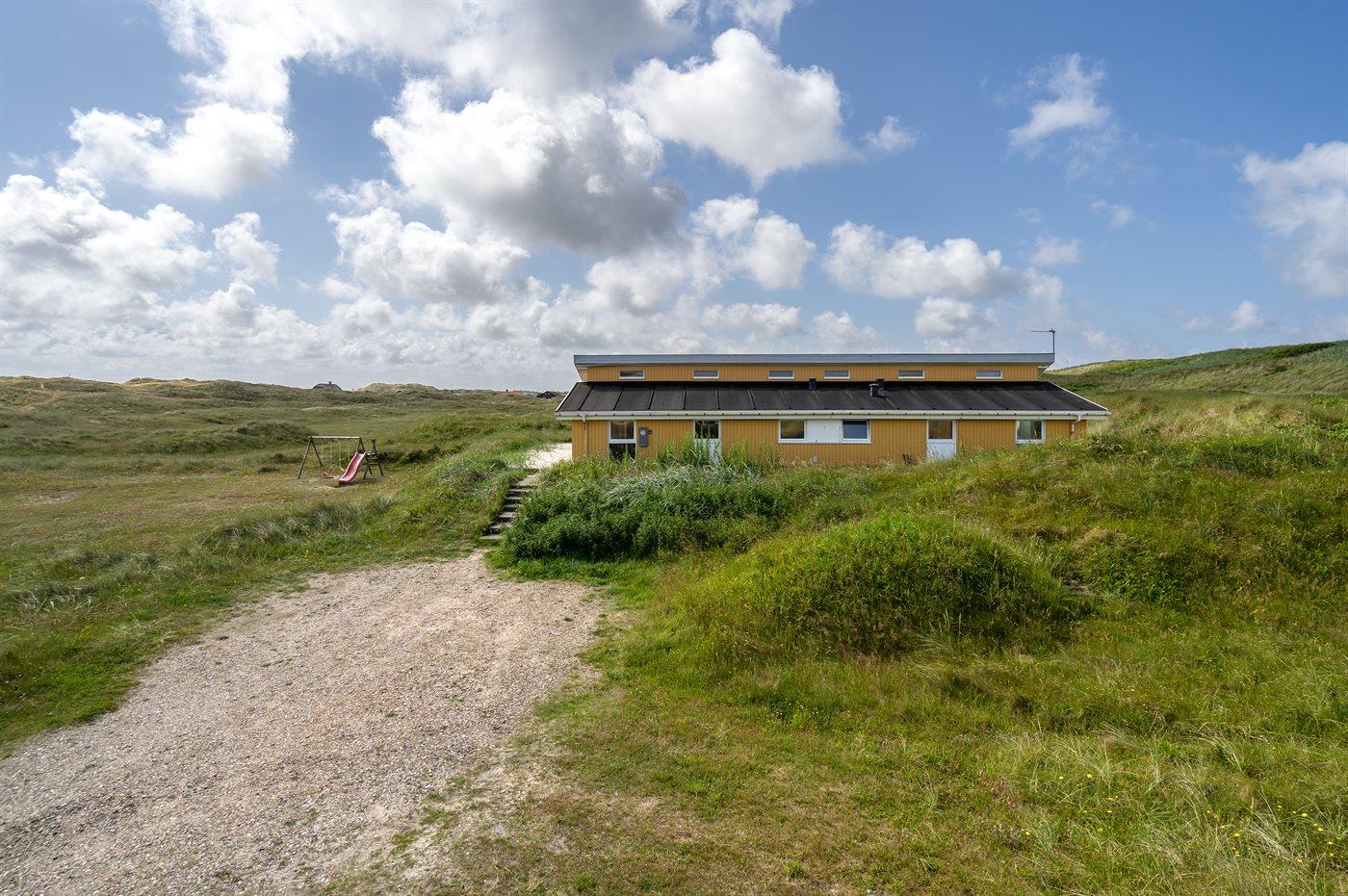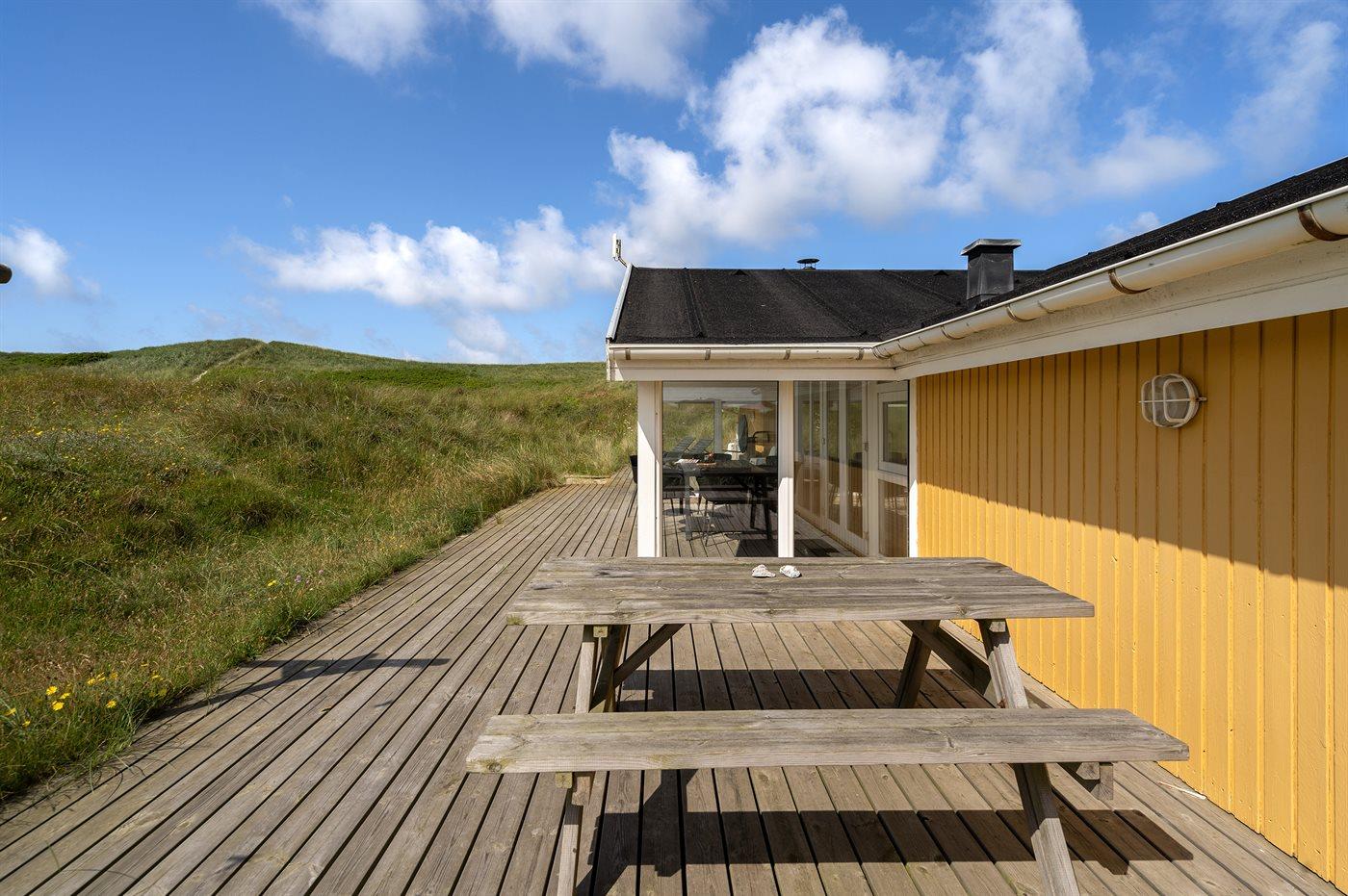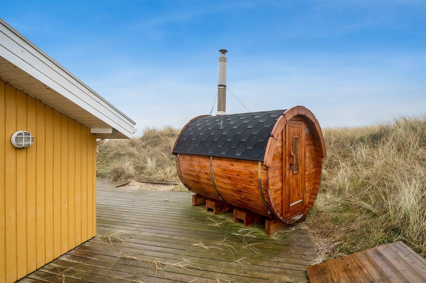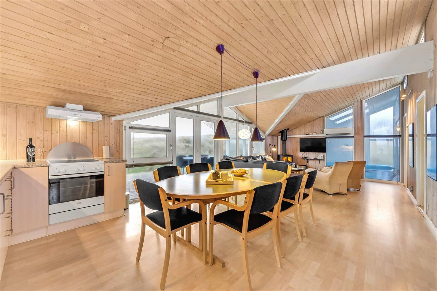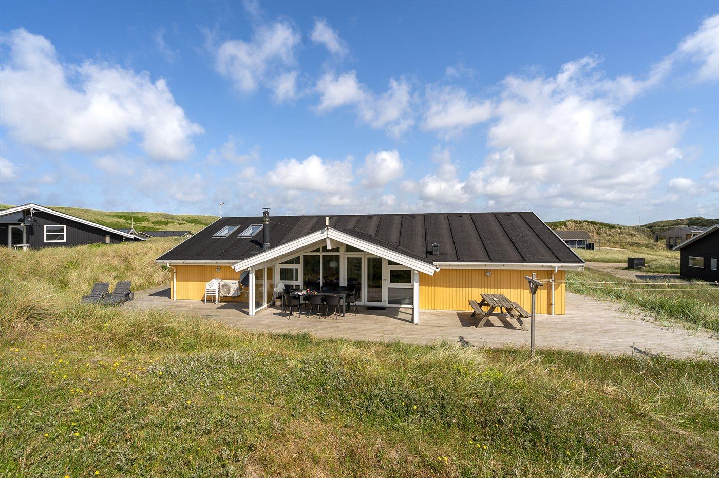 Auf der schmalsten Stelle der attraktiven Landzunge, Holmsland Klit, liegt dieses schöne Ferienhaus aus Holz mit u. a. Swimmingpool (4 x 3,3 x 1,4), Whirlpool und Outdoor-Sauna. Das Haus liegt auf einem Dünengrundstück, das an ein unter Naturschutz stehendes Dünengebiet grenzt - nur 100 m vom Wasser entfernt. Es gibt ein großes, teilweise überdachtes Terrassenareal mit Gartenmöbeln. Holzboden im Wohnzimmer, in der Küche, im Flur und den Zimmern. Das Haus enthält eine Pool-Abteilung mit Swimmingpool und Whirlpool. Von der Pool-Abteilung direkter Zutritt zu Duschnische und Gästetoilette. Darüber hinaus gibt es ein nettes Badezimmer mit Fußbodenheizung, Duschnische sowie Waschmaschine und Wäschetrockner. In der Küchenabteilung, die mit dem Wohnzimmer kombiniert ist, gibt es u. a. Kochinsel, Geschirrspüler, Mikrowelle und Tiefkühlgerät. Das gemütliche Wohnzimmer ist mit Kaminofen und TV mit digitalem Satellitenanschluss ausgestattet. Das Haus enthält auch 4 gute Schlafzimmer; hiervon 2 mit Doppelbetten und 2 mit je 2 Einzelbetten. An weiterer Ausstattung können kostenlose kabellose Internetverbindung (eigener Computer ist mitzubringen), Kinderbett sowie Kinderhochstuhl erwähnt werden und es ist eine energiegerechte Wärmepumpe installiert. Draußen Sandkasten für die Kinder. Ein herrliches Ferienhaus, das das ganze Jahr hindurch für sowohl 1 als auch 2 Familien geeignet ist. Nur wenige Min. Autofahrt zur Fischereistadt Hvide Sande.