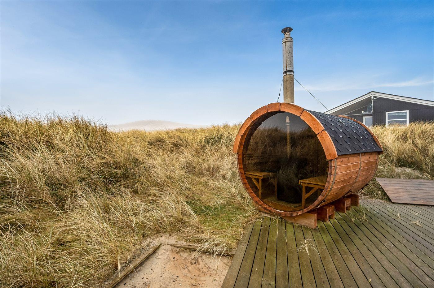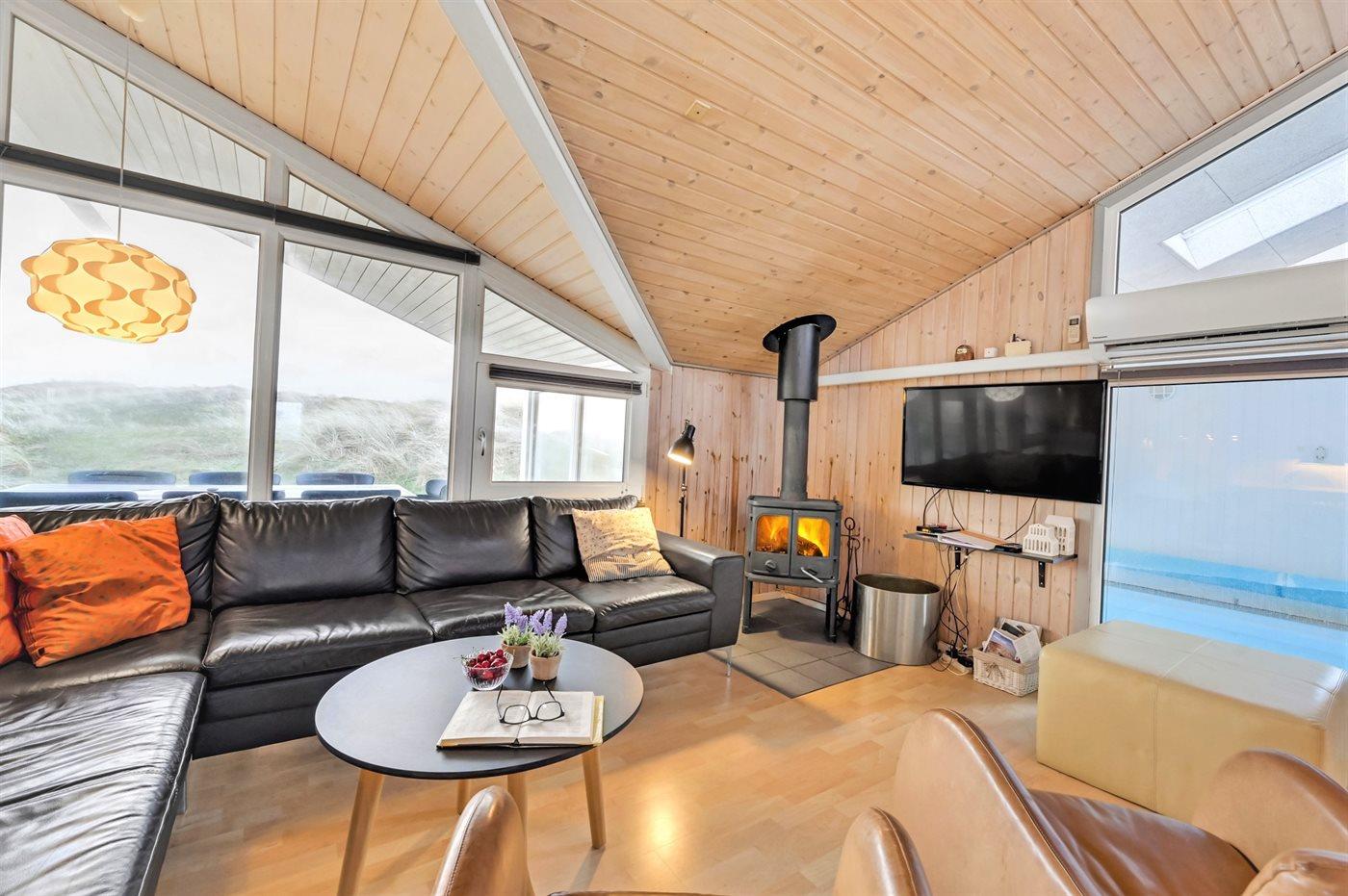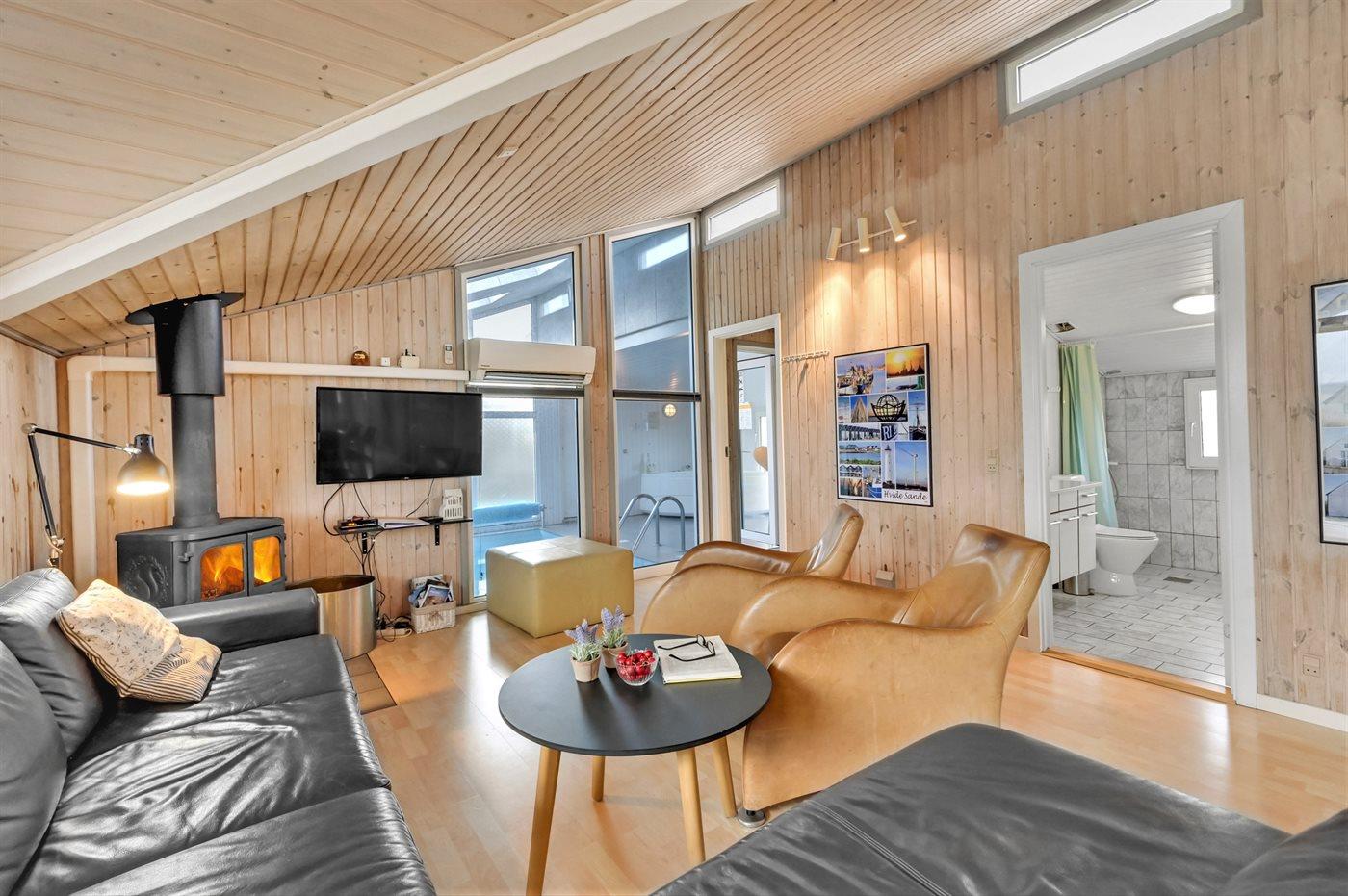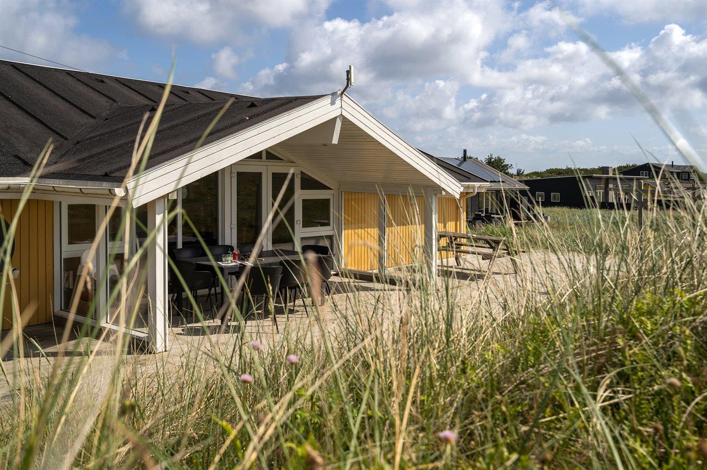 Auf der schmalsten Stelle der attraktiven Landzunge, Holmsland Klit, liegt dieses schöne Ferienhaus aus Holz mit u. a. Swimmingpool (4 x 3,3 x 1,4), Whirlpool und Outdoor-Sauna. Das Haus liegt auf einem Dünengrundstück, das an ein unter Naturschutz stehendes Dünengebiet grenzt - nur 100 m vom Wasser entfernt. Es gibt ein großes, teilweise überdachtes Terrassenareal mit Gartenmöbeln. Holzboden im Wohnzimmer, in der Küche, im Flur und den Zimmern. Das Haus enthält eine Pool-Abteilung mit Swimmingpool und Whirlpool. Von der Pool-Abteilung direkter Zutritt zu Duschnische und Gästetoilette. Darüber hinaus gibt es ein nettes Badezimmer mit Fußbodenheizung, Duschnische sowie Waschmaschine und Wäschetrockner. In der Küchenabteilung, die mit dem Wohnzimmer kombiniert ist, gibt es u. a. Kochinsel, Geschirrspüler, Mikrowelle und Tiefkühlgerät. Das gemütliche Wohnzimmer ist mit Kaminofen und TV mit digitalem Satellitenanschluss ausgestattet. Das Haus enthält auch 4 gute Schlafzimmer; hiervon 2 mit Doppelbetten und 2 mit je 2 Einzelbetten. An weiterer Ausstattung können kostenlose kabellose Internetverbindung (eigener Computer ist mitzubringen), Kinderbett sowie Kinderhochstuhl erwähnt werden und es ist eine energiegerechte Wärmepumpe installiert. Draußen Sandkasten für die Kinder. Ein herrliches Ferienhaus, das das ganze Jahr hindurch für sowohl 1 als auch 2 Familien geeignet ist. Nur wenige Min. Autofahrt zur Fischereistadt Hvide Sande.