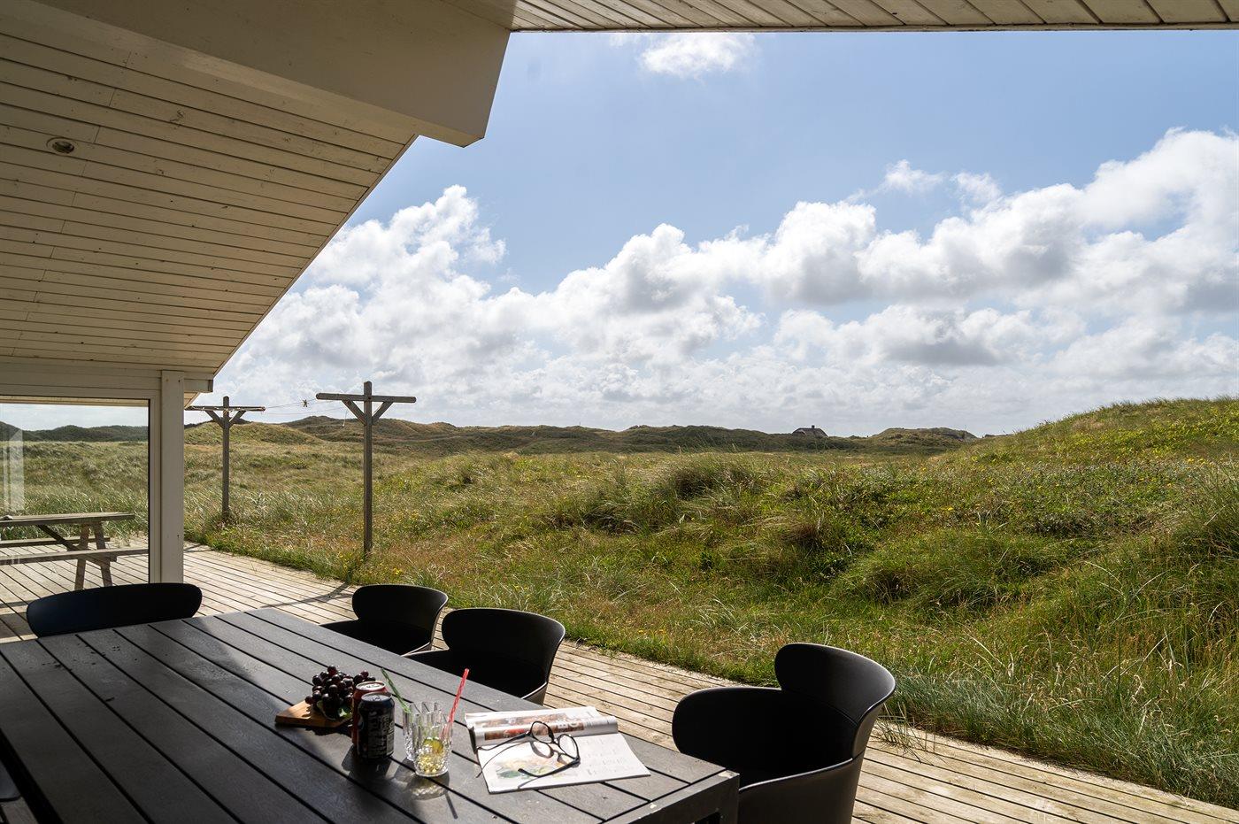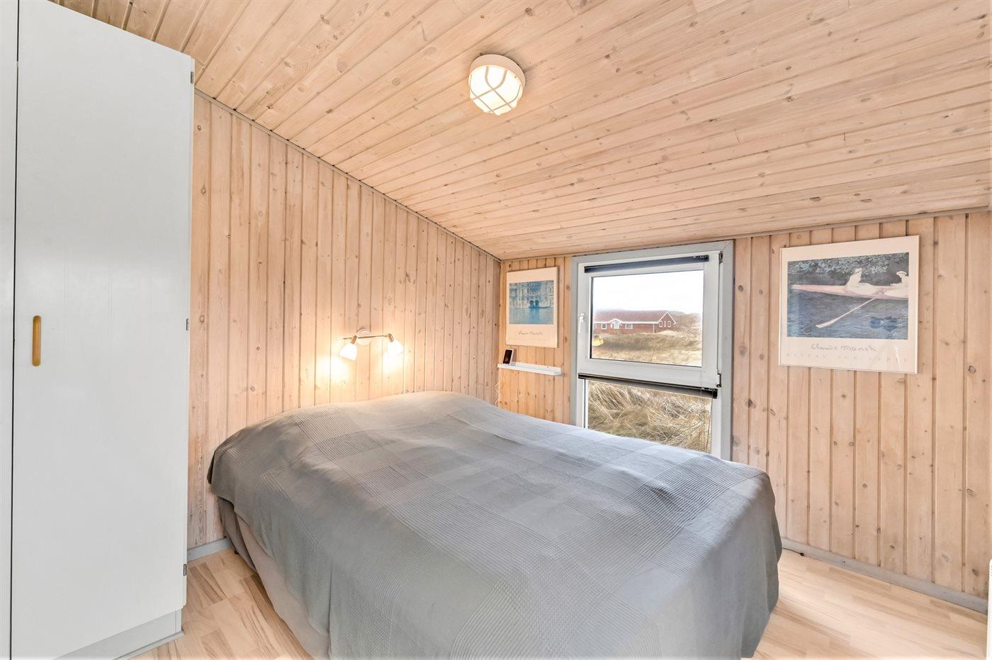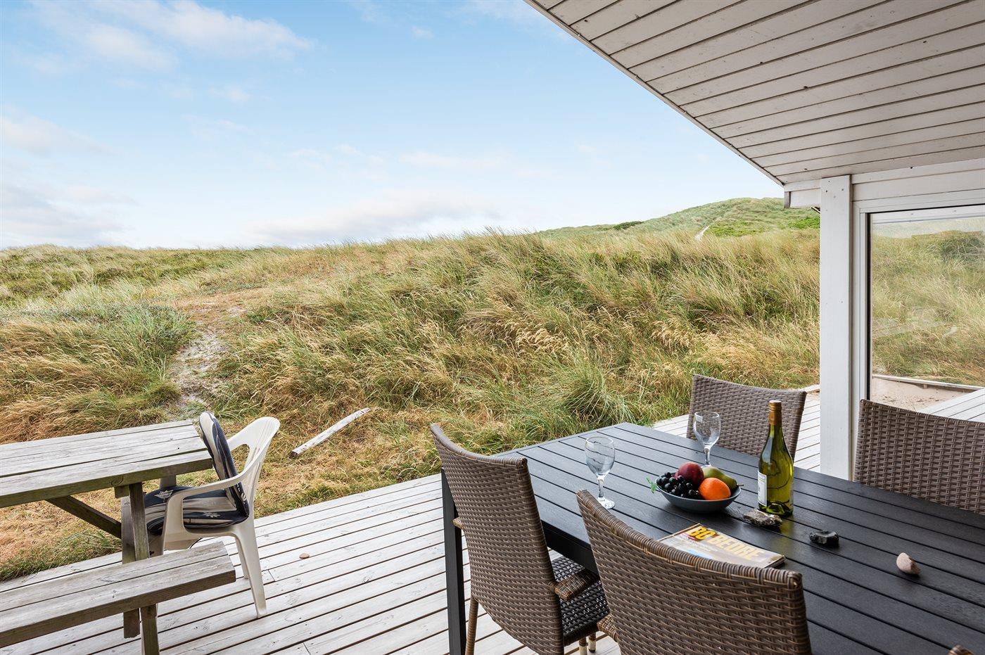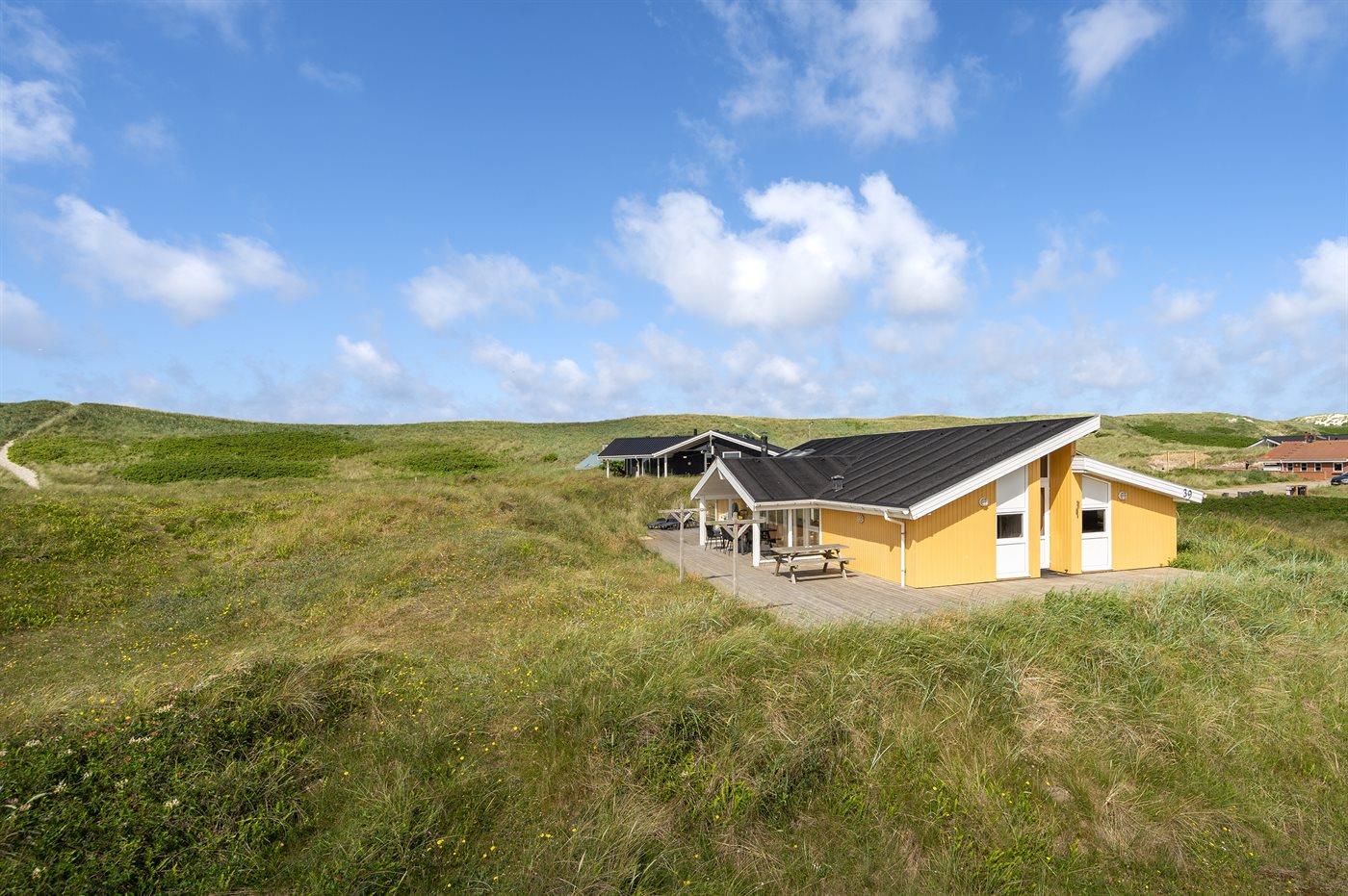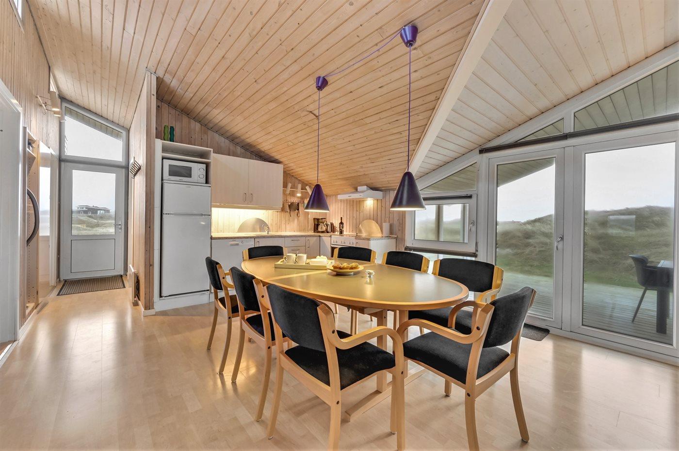Auf der schmalsten Stelle der attraktiven Landzunge, Holmsland Klit, liegt dieses schöne Ferienhaus aus Holz mit u. a. Swimmingpool (4 x 3,3 x 1,4), Whirlpool und Outdoor-Sauna. Das Haus liegt auf einem Dünengrundstück, das an ein unter Naturschutz stehendes Dünengebiet grenzt - nur 100 m vom Wasser entfernt. Es gibt ein großes, teilweise überdachtes Terrassenareal mit Gartenmöbeln. Holzboden im Wohnzimmer, in der Küche, im Flur und den Zimmern. Das Haus enthält eine Pool-Abteilung mit Swimmingpool und Whirlpool. Von der Pool-Abteilung direkter Zutritt zu Duschnische und Gästetoilette. Darüber hinaus gibt es ein nettes Badezimmer mit Fußbodenheizung, Duschnische sowie Waschmaschine und Wäschetrockner. In der Küchenabteilung, die mit dem Wohnzimmer kombiniert ist, gibt es u. a. Kochinsel, Geschirrspüler, Mikrowelle und Tiefkühlgerät. Das gemütliche Wohnzimmer ist mit Kaminofen und TV mit digitalem Satellitenanschluss ausgestattet. Das Haus enthält auch 4 gute Schlafzimmer; hiervon 2 mit Doppelbetten und 2 mit je 2 Einzelbetten. An weiterer Ausstattung können kostenlose kabellose Internetverbindung (eigener Computer ist mitzubringen), Kinderbett sowie Kinderhochstuhl erwähnt werden und es ist eine energiegerechte Wärmepumpe installiert. Draußen Sandkasten für die Kinder. Ein herrliches Ferienhaus, das das ganze Jahr hindurch für sowohl 1 als auch 2 Familien geeignet ist. Nur wenige Min. Autofahrt zur Fischereistadt Hvide Sande.