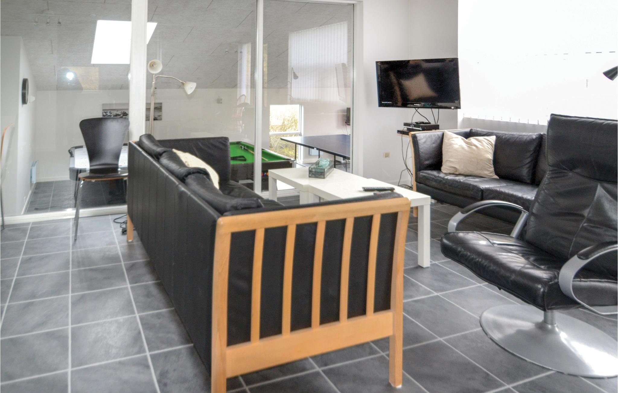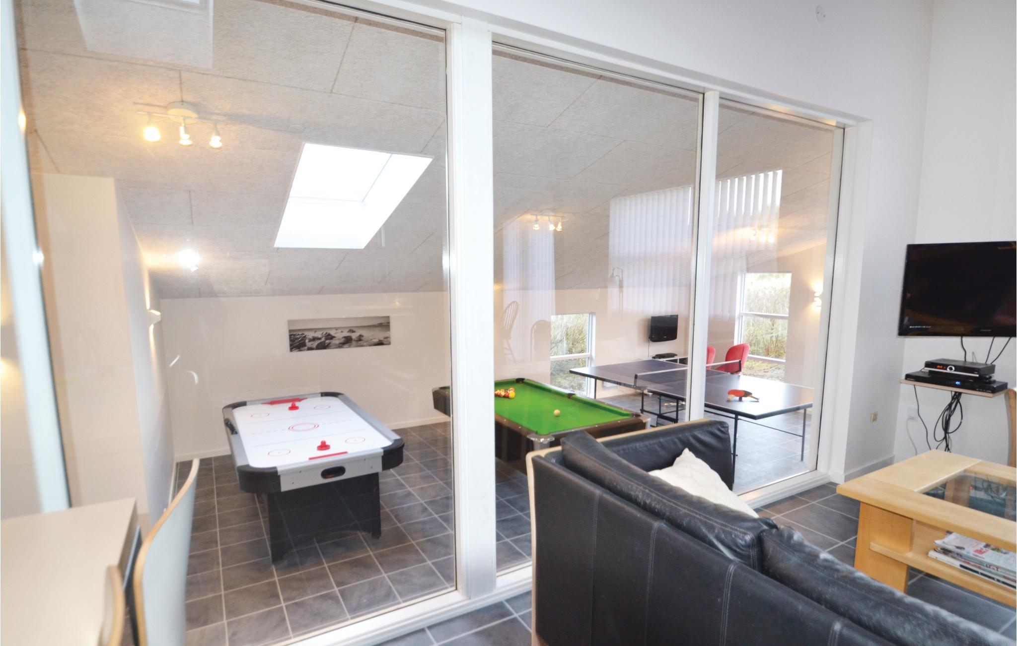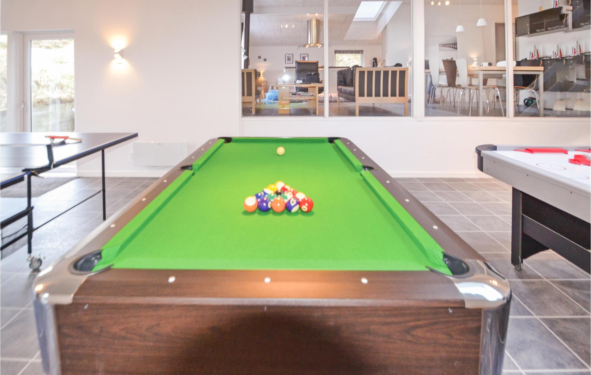 Hier, in geringer Entfernung von der tosenden Nordsee und den schier endlosen Sandstränden, eröffnet sich eine der schönsten Panoramaaussichten dieser Gegend auf den Ringkøbing Fjord aus diesem Ferienhaus, welches sich in zwei Ebenen in den großen, hügeligen Dünengrund schmiegt. Das Haus ist geschmackvoll eingerichtet, in modernem Stil mit schönen Laminatfußböden in allen Räumen. Der durchgehende Stil sorgt für eine angenehme Stimmung im gesamten Haus. Beide Badezimmer sind mit Fußbodenheizung ausgestattet, und eins dient als Wellnessraum mit Infrarotsauna und Whirlpool. Im großen Aktivitätsraum kann die ganze Familie lustige und unterhaltsame Stunden verbringen mit Möglichkeiten wie Tischtennis, Airhockey und Billard. Sie können hier aber auch gut im Freien aktiv sein. Im Fjord kann allerlei Wassersport betrieben werden, und im naheliegenden Surfzentrum können Sie Surfstunden nehmen. 300 m sind es zum nächsten Angelsee und 16 km zum nächsten Golfplatz. Besuchen Sie in Hvide Sande Kabelparken, Sie können dort Wasserski und Wakeboard fahren. Es gibt dort jeden Tag Anfängerstunden.