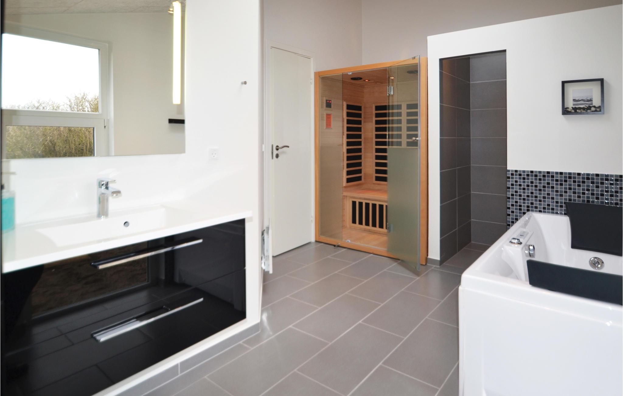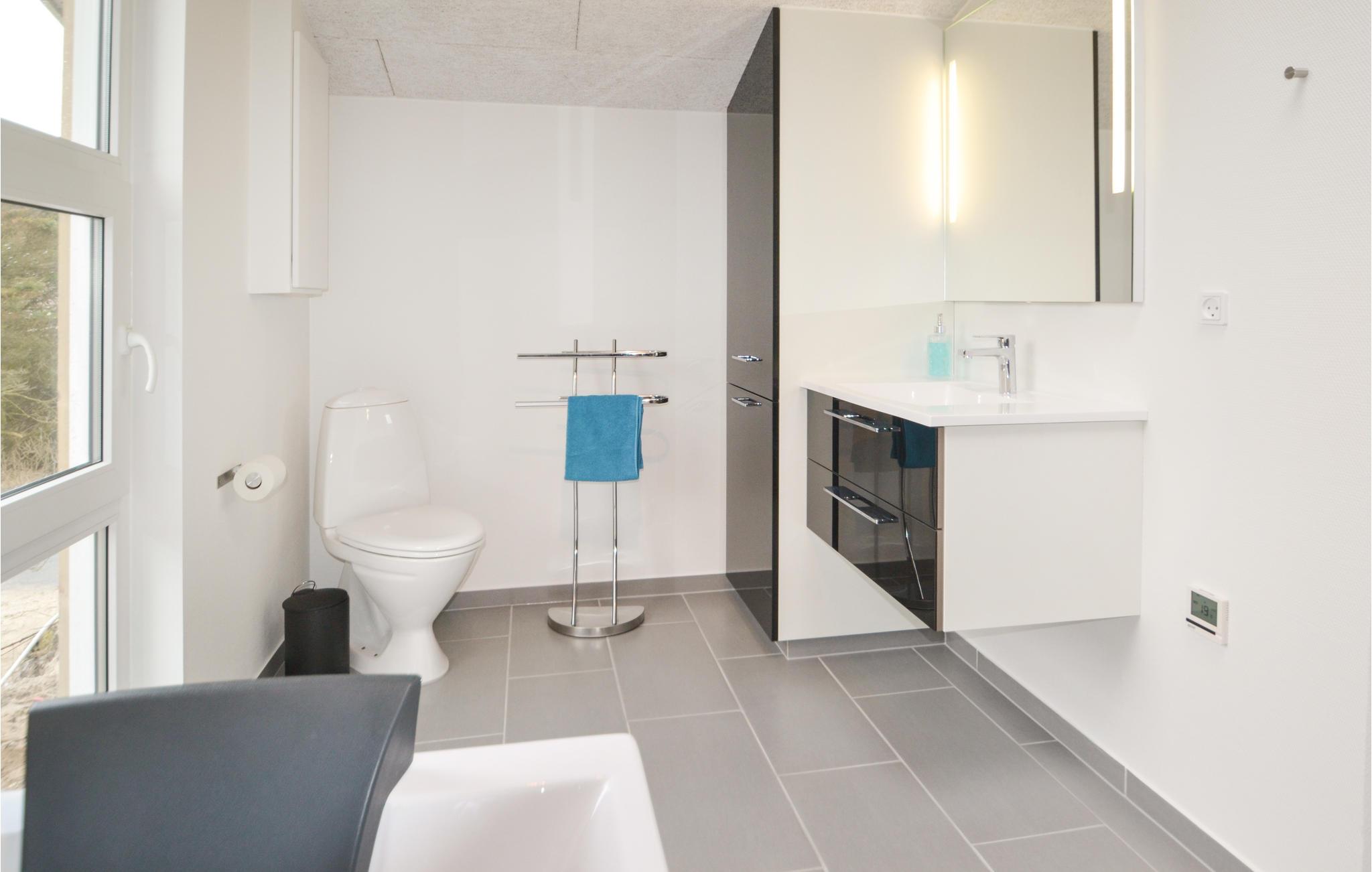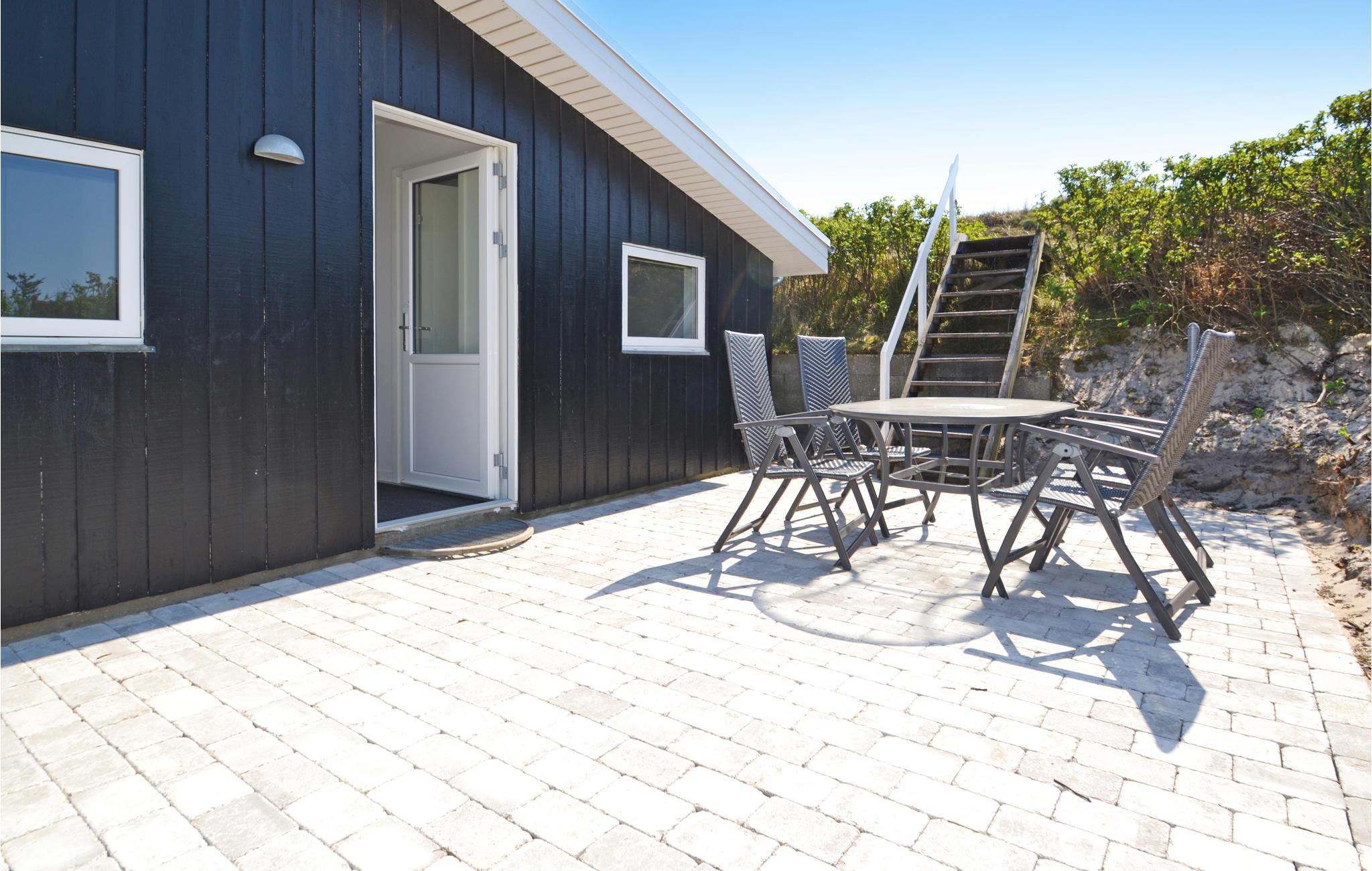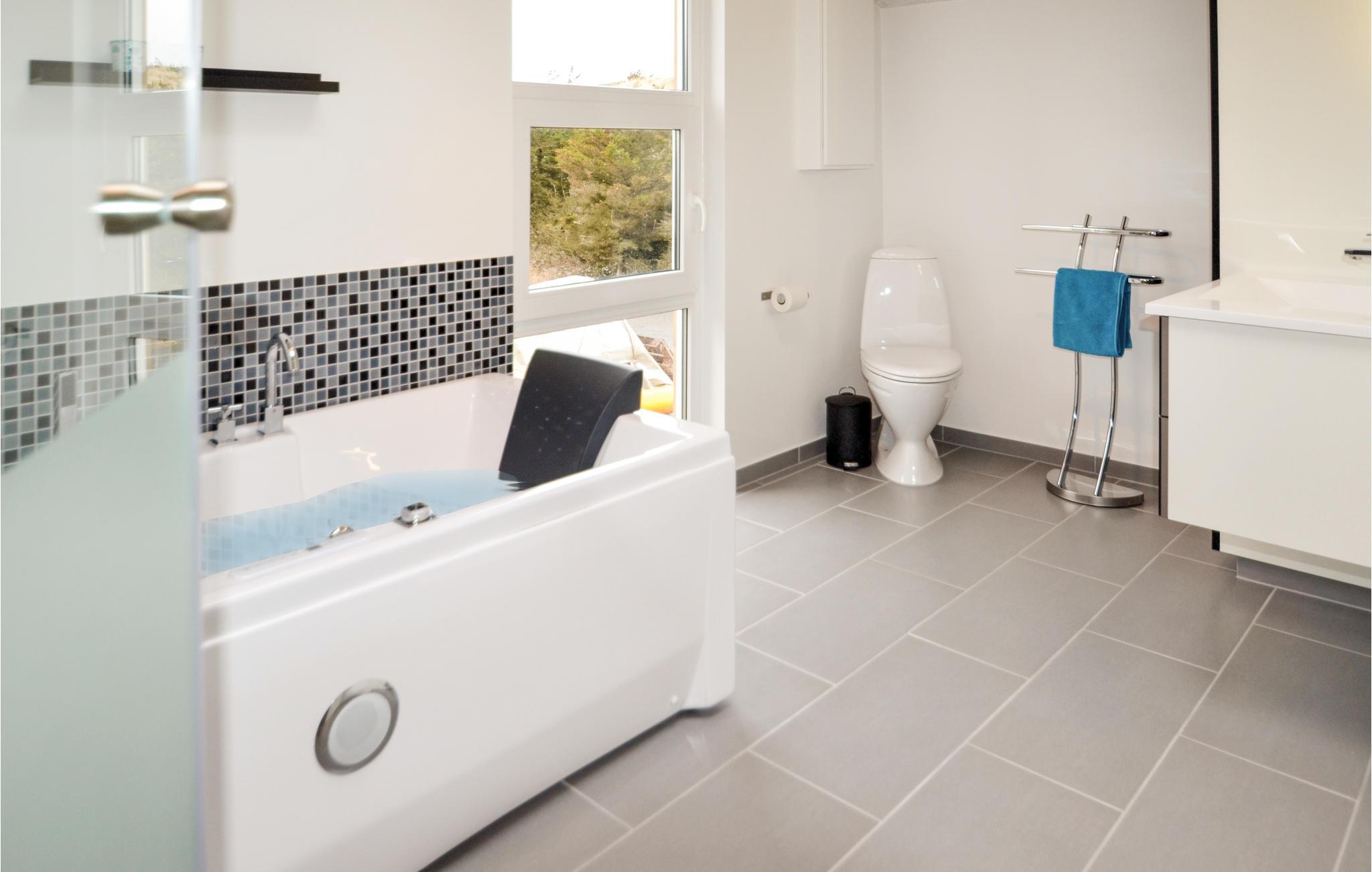 Hier, in geringer Entfernung von der tosenden Nordsee und den schier endlosen Sandstränden, eröffnet sich eine der schönsten Panoramaaussichten dieser Gegend auf den Ringkøbing Fjord aus diesem Ferienhaus, welches sich in zwei Ebenen in den großen, hügeligen Dünengrund schmiegt. Das Haus ist geschmackvoll eingerichtet, in modernem Stil mit schönen Laminatfußböden in allen Räumen. Der durchgehende Stil sorgt für eine angenehme Stimmung im gesamten Haus. Beide Badezimmer sind mit Fußbodenheizung ausgestattet, und eins dient als Wellnessraum mit Infrarotsauna und Whirlpool. Im großen Aktivitätsraum kann die ganze Familie lustige und unterhaltsame Stunden verbringen mit Möglichkeiten wie Tischtennis, Airhockey und Billard. Sie können hier aber auch gut im Freien aktiv sein. Im Fjord kann allerlei Wassersport betrieben werden, und im naheliegenden Surfzentrum können Sie Surfstunden nehmen. 300 m sind es zum nächsten Angelsee und 16 km zum nächsten Golfplatz. Besuchen Sie in Hvide Sande Kabelparken, Sie können dort Wasserski und Wakeboard fahren. Es gibt dort jeden Tag Anfängerstunden.