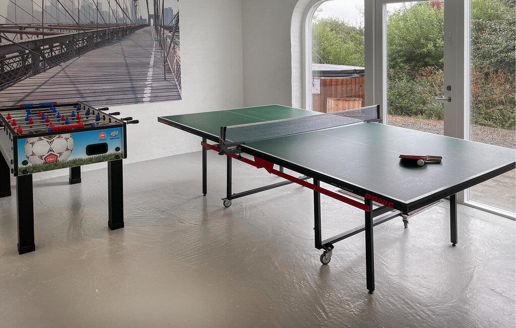 Erleben Sie gemütliche Stunden mit der Familie und lassen Sie die einzigartige Lage auf sich wirken. Betreten Sie den hellen Wohnbereich mit Sofas, großen Fenstern und offener Raumgestaltung. Machen Sie es sich gemütlich und genießen Sie die warme Atmosphäre. Nutzen Sie den großzügigen Essbereich für gemeinsame Mahlzeiten und kochen Sie in der Küche mit viel Arbeitsfläche. Steigen Sie die Wendeltreppe hinauf in die obere Etage, wo Sie einen weiteren Wohnraum mit komfortablen Sofas und Blick auf das Wasser erwartet. Spielen Sie Tischtennis oder Tischfußball im separaten Aktivitätsraum und verbringen Sie unterhaltsame Stunden.