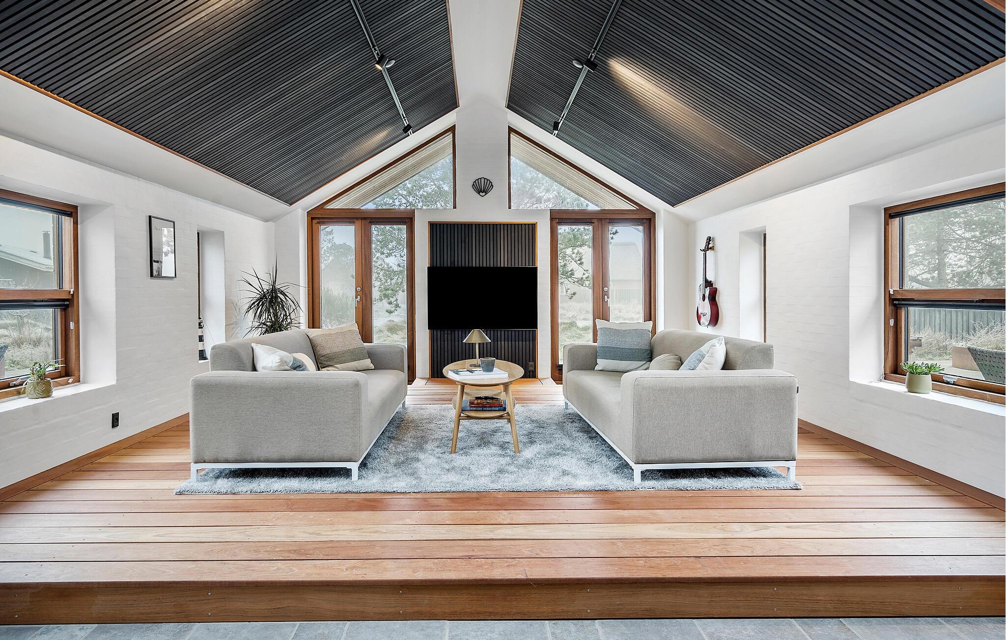 In Ihrem architektonisch ansprechenden Ferienhaus schafft der offene Wohnbereich mit hohen Decken und großen Fensterflächen eine lichtdurchflutete Atmosphäre. Der leicht erhöhte Wohnbereich mit Holzfußboden bildet einen eleganten Mittelpunkt des Hauses. Nehmen Sie hier auf den komfortablen Sofas Platz und genießen Sie den Blick ins Grüne. Bereiten Sie Ihre Mahlzeiten in der modernen Küche zu und nutzen Sie den langen Esstisch für gemeinsame Abende mit Familie oder Freunden.