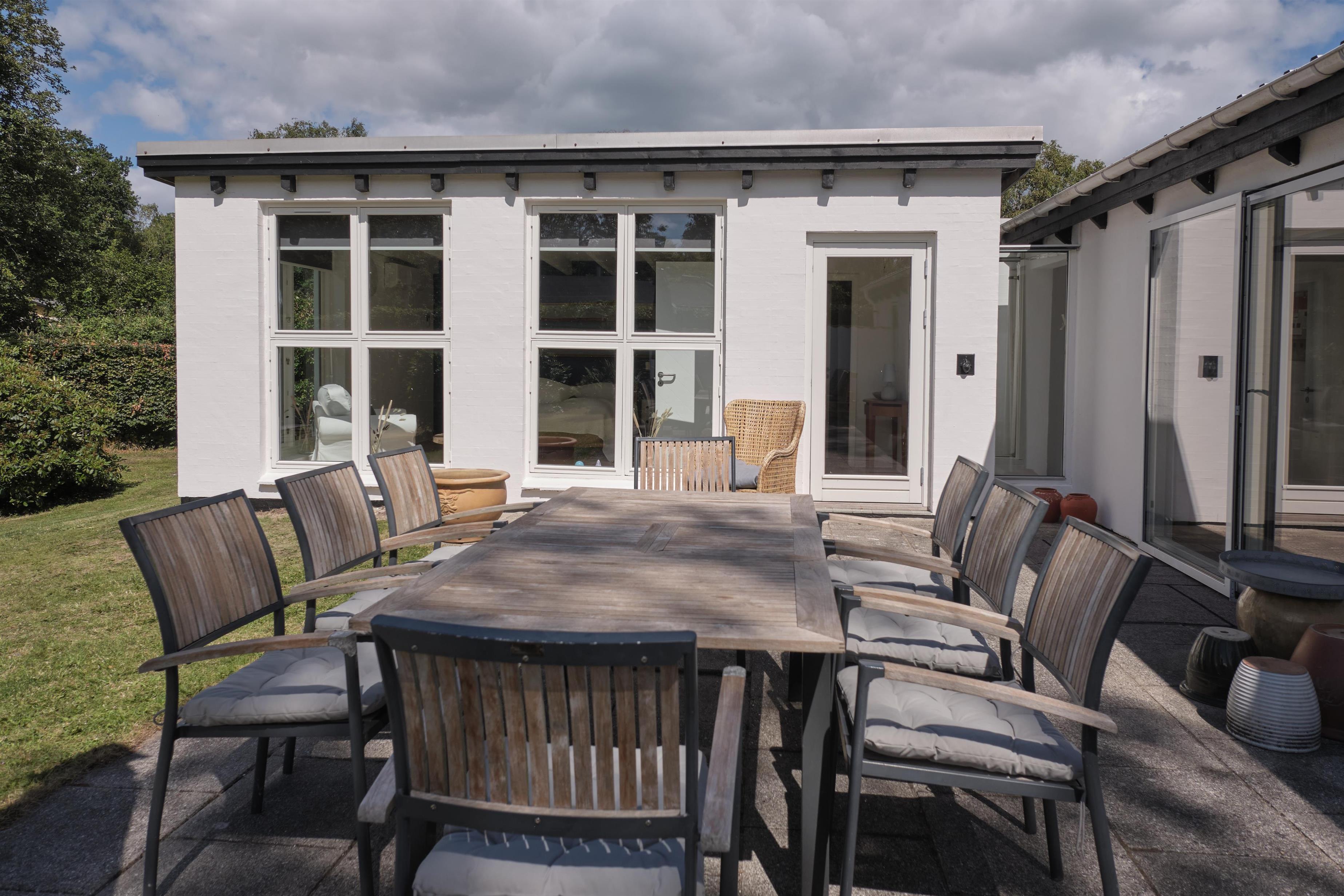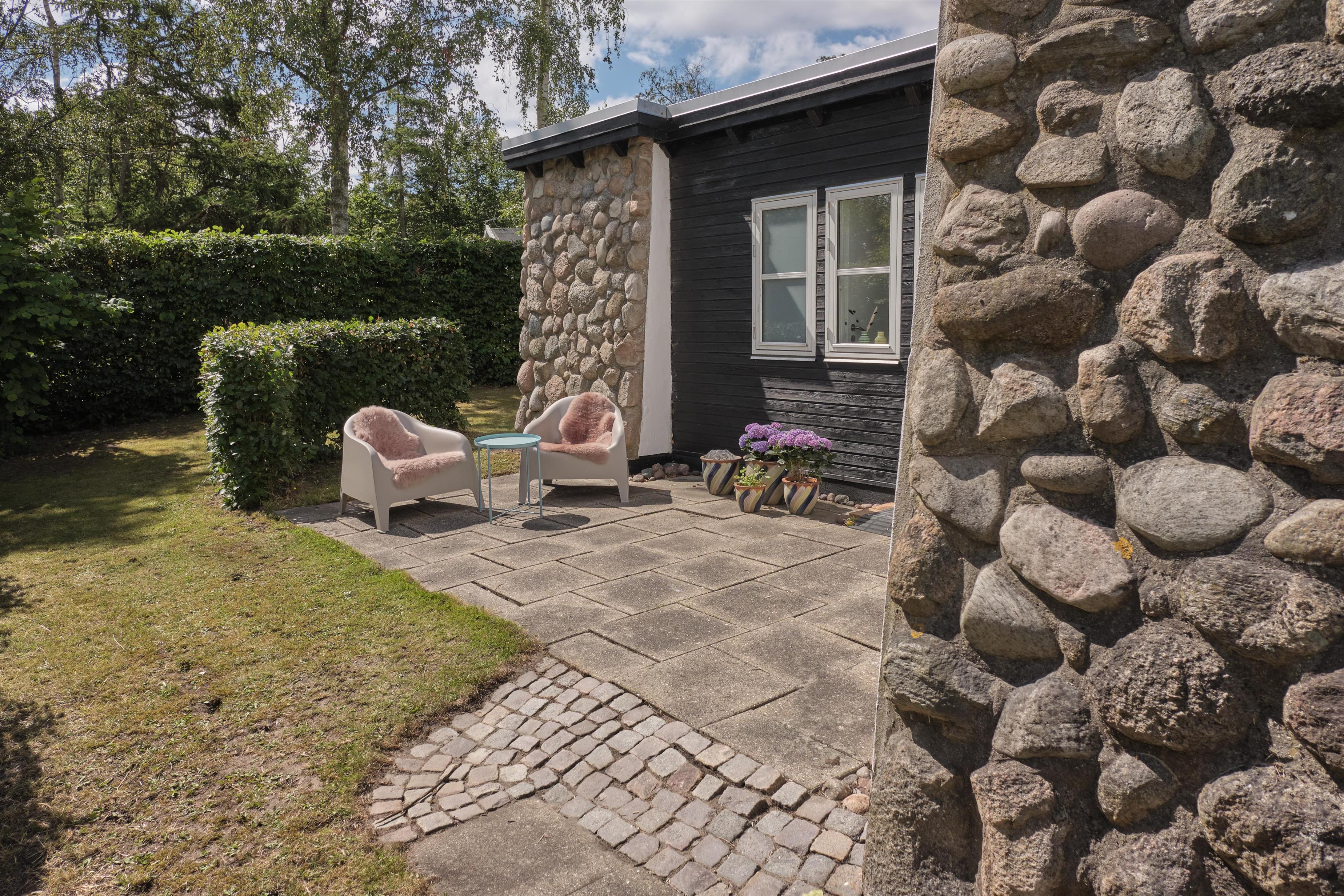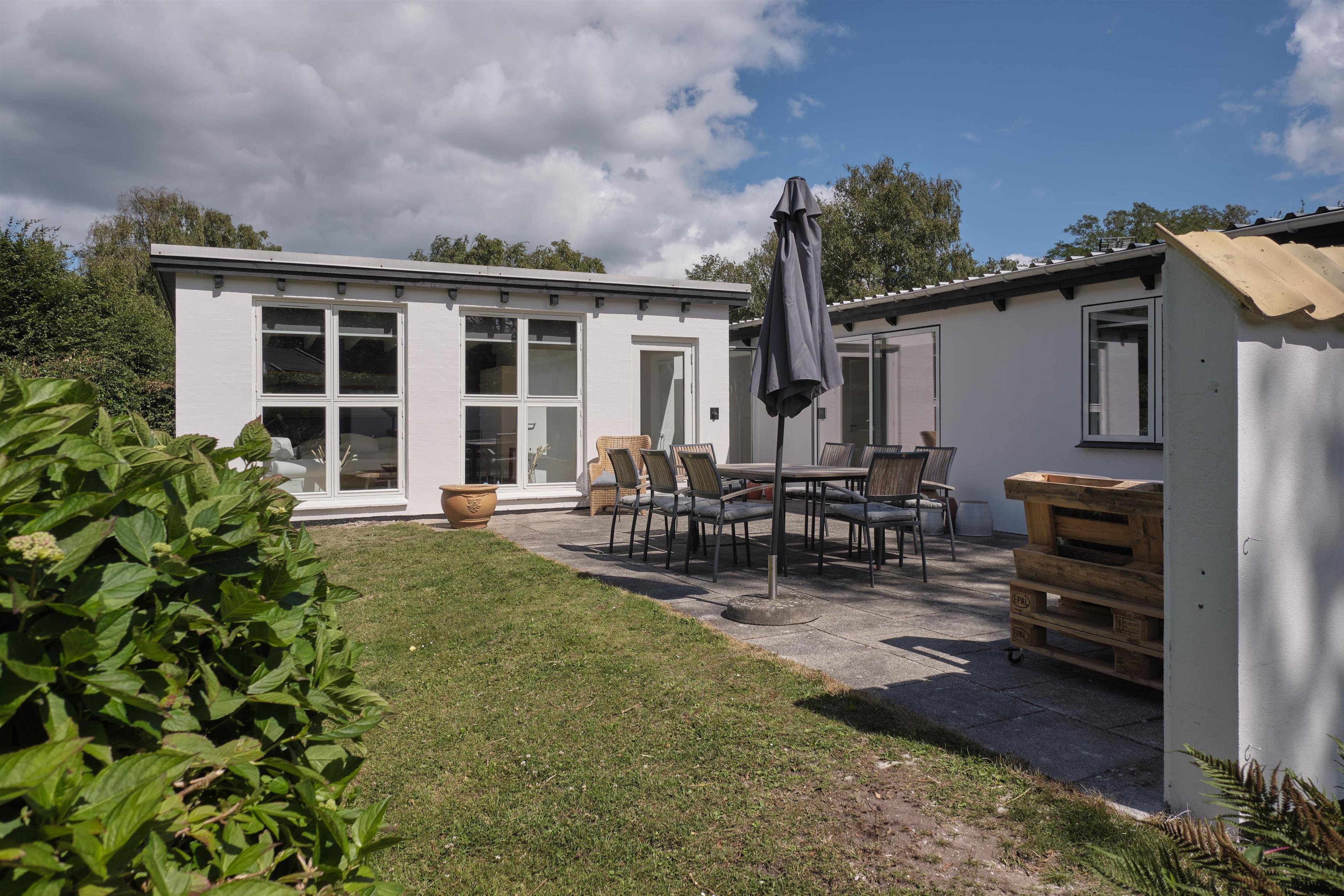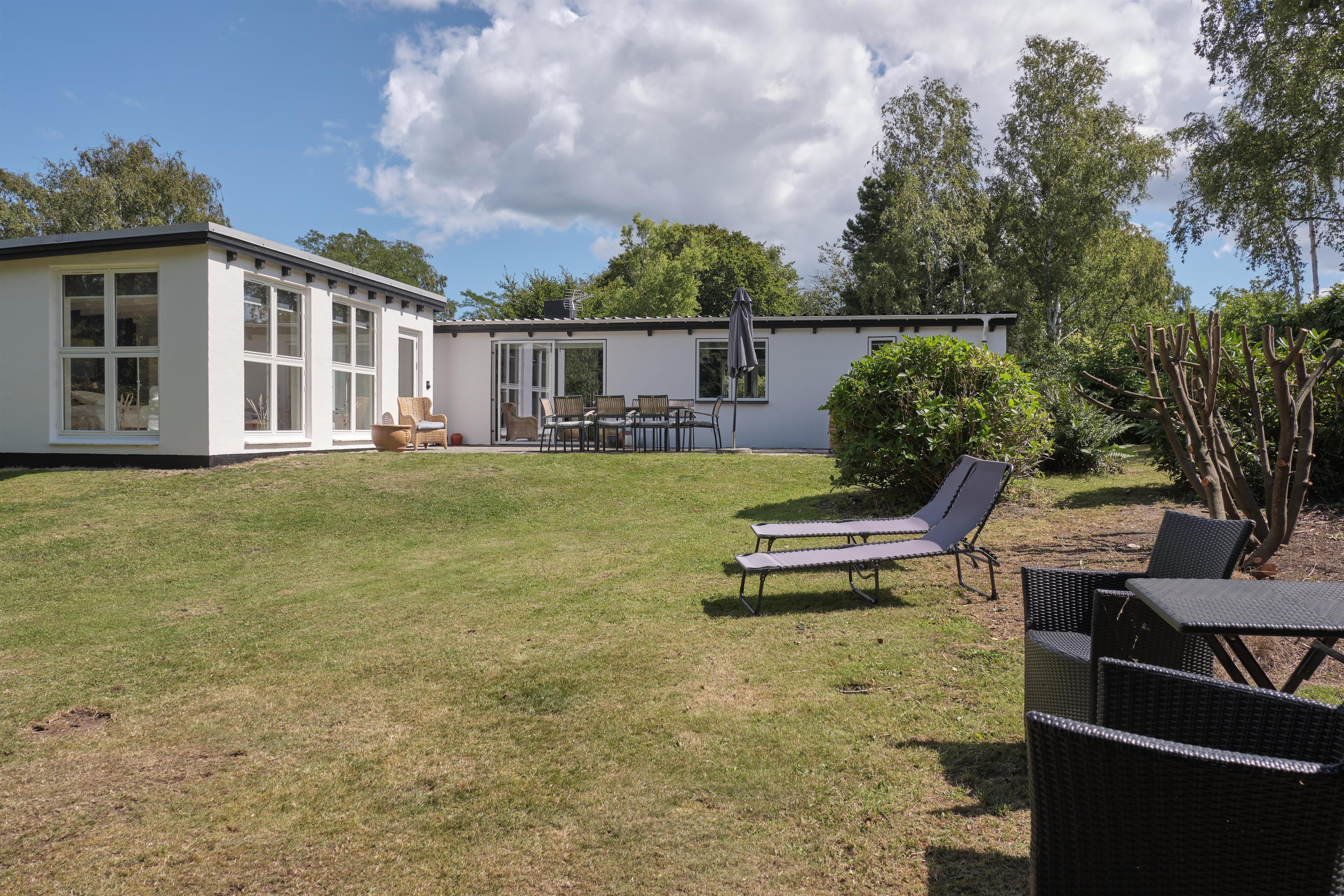 Älteres, aber gepflegtes und äußerst charmantes Ferienhaus auf einem großen, gepflegten Naturgrundstück, nur 250 m von einem kinderfreundlichen Sandstrand entfernt. Das Haus wurde laufend modernisiert und präsentiert sich hell und behaglich mit einem Hauch von Modernismus und Nostalgie. Schöne, abgeschirmte, nach Westen gewandte Fliesenterrasse mit Grill, Kamin, Gartenmöbeln, Liegestühlen und Sonnenschirm. Auf der kleineren Ostterrasse kann man die Morgensonne genießen.