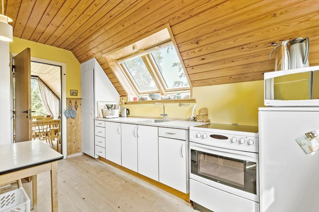 Dein gut eingerichtetes, gepflegtes Ferienhaus bildet einen schönen Rahmen für Urlaubstage, die im Zeichen von Erholung und Gemütlichkeit stehen. Die große, helle Küche befindet sich im Erdgeschoss und lädt zum gemeinsamen Kochen ein. Da es keinen Geschirrspüler gibt, wird der anschließende Abwasch zum geselligen Gemeinschaftsprojekt. Ein Kühlschrank mit kleinem Gefrierfach ist vorhanden. In den Schränken der Küche steht alles bereit, was ihr für die Zubereitung köstlicher Mahlzeiten benötigt. Einer der insgesamt drei gemütlichen Schlafräume ist im Erdgeschoss platziert. Gleiches gilt für ein Badezimmer mit Dusche. Der Wohnraum unterteilt sich in zwei Bereiche: einen Essbereich mit direktem Zugang zur Küche und einen gemütlichen Wohnbereich mit einem Kaminofen und Zugang zur Terrasse. Gemütlichen, erholsamen Urlaubstagen im Familien- oder Freundeskreis steht absolut nichts entgegen.