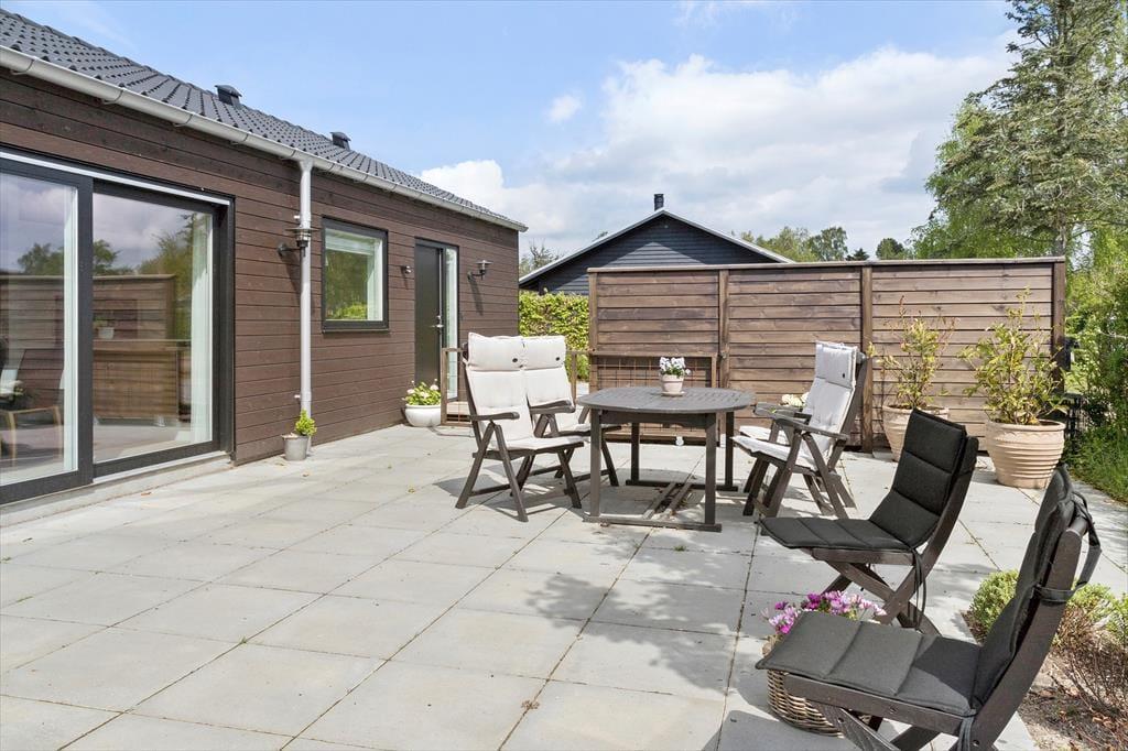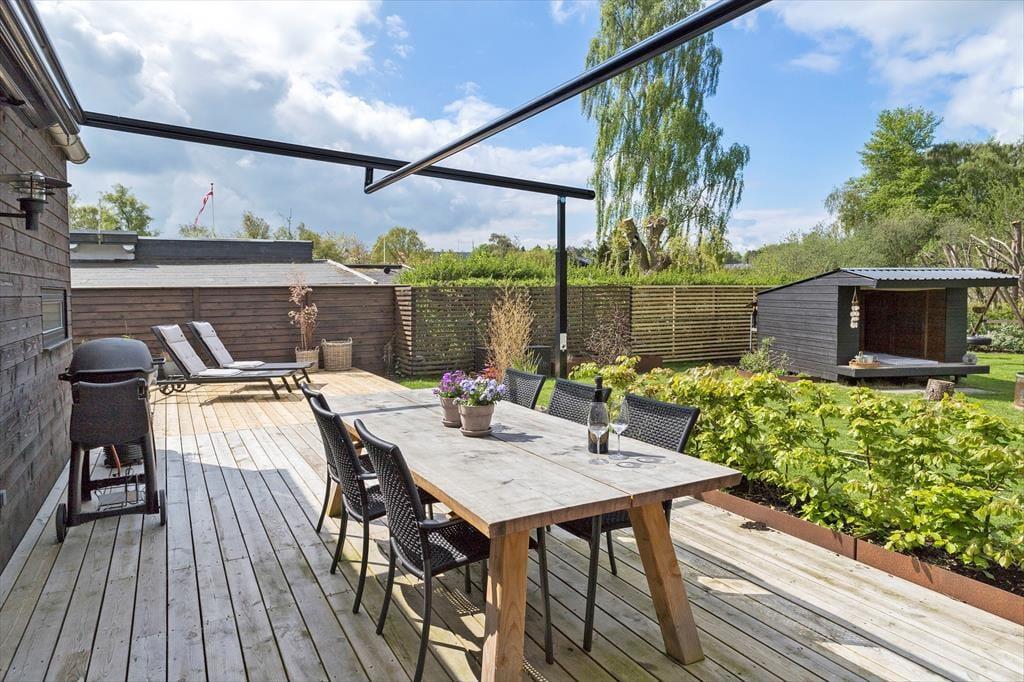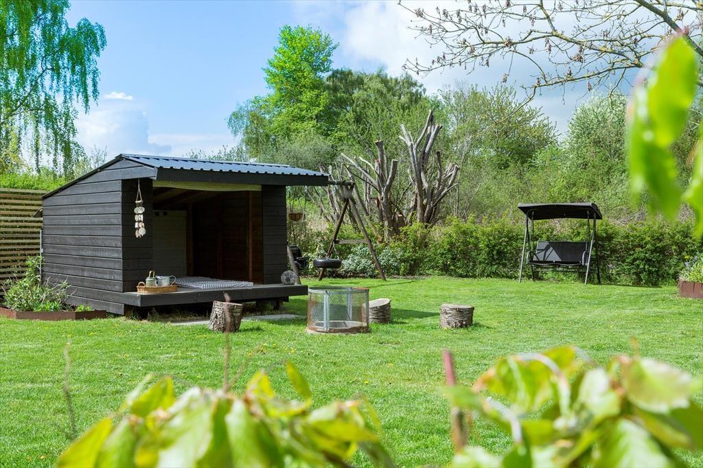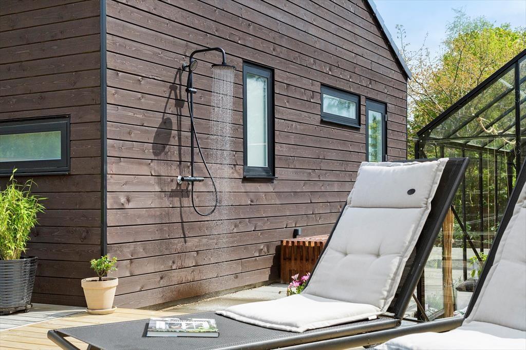 Das Leben im Freien wird hier ganz leicht. Die Terrassen auf beiden Seiten des Hauses ermöglichen es dir, der Sonne den ganzen Tag zu folgen und deinen eigenen Urlaubsrhythmus zu finden. Starte den Morgen mit einer Tasse Kaffee und dem Gesang der Vögel und lasse den Tag mit Sonnenschein, Spiel oder einer ruhigen Pause im Garten weitergehen. Die Terrasse kann nach Wunsch überdacht werden, sodass du bei Bedarf Schatten und Schutz findest. Am Abend wird sie zu einem wunderbaren Ort für Grillgerichte und lange Gespräche. Nach einem Besuch am Strand, der nur wenige Gehminuten entfernt liegt, kannst du das Salzwasser unter der Außendusche abspülen und die frische Küstenluft genießen. Der Garten bietet Platz für Spiel, Erholung und ruhige Momente, in denen du einfach den Duft des Meeres und die besondere Stimmung auf dich wirken lässt.