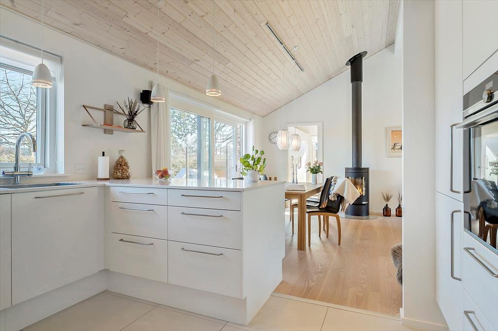 Beim Betreten des Hauses spürst du sofort wie sich die Urlaubsstimmung ausbreitet. Der große Wohnbereich vereint Küche, Essplatz und Wohnzimmer, sodass alle zusammen sein können, während die Mahlzeiten zubereitet werden, ein Spiel auf dem Tisch liegt oder Gespräche den Raum erfüllen. Die vielen Fenster lassen das Tageslicht hineinströmen und schaffen eine angenehme Verbindung zwischen drinnen und draußen, die perfekt zum Feriengefühl passt. Der Kaminofen spendet Wärme an kühleren Tagen und lädt zu ruhigen Momenten ein. Die Einrichtung zeigt Qualität und liebevolle Details, sodass du dich schnell zuhause fühlst und merkst wie das Haus für Entspannung und gemeinsame Zeit geschaffen ist.