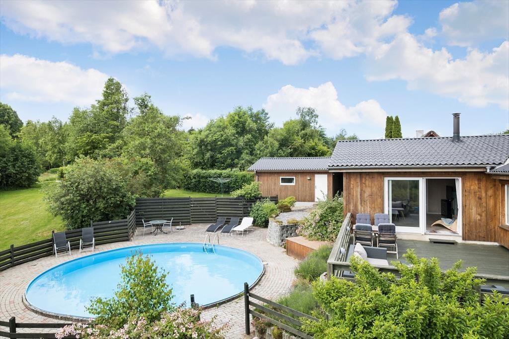 Obwohl es schön ist, Zeit im Wohnbereich zu verbringen, bekommen Sie vermutlich Lust, sich bei Sonnenschein und sommerlichen Temperaturen hinaus auf das 2823 m² große Grundstück zu begeben. Hier erwartet Sie nämlich eine schöne Oase in Form einer großen Terrasse auf mehreren Niveaus mit Swimmingpool. Der Pool ist unbeheizt, so dass Sie sich vor dem Spielen auf der Liegewiese und dem Grillabend auf dem überdachten Terrassenbereich sicher erfrischen werden. der Pool ist von Mai bis Oktober geöffnet