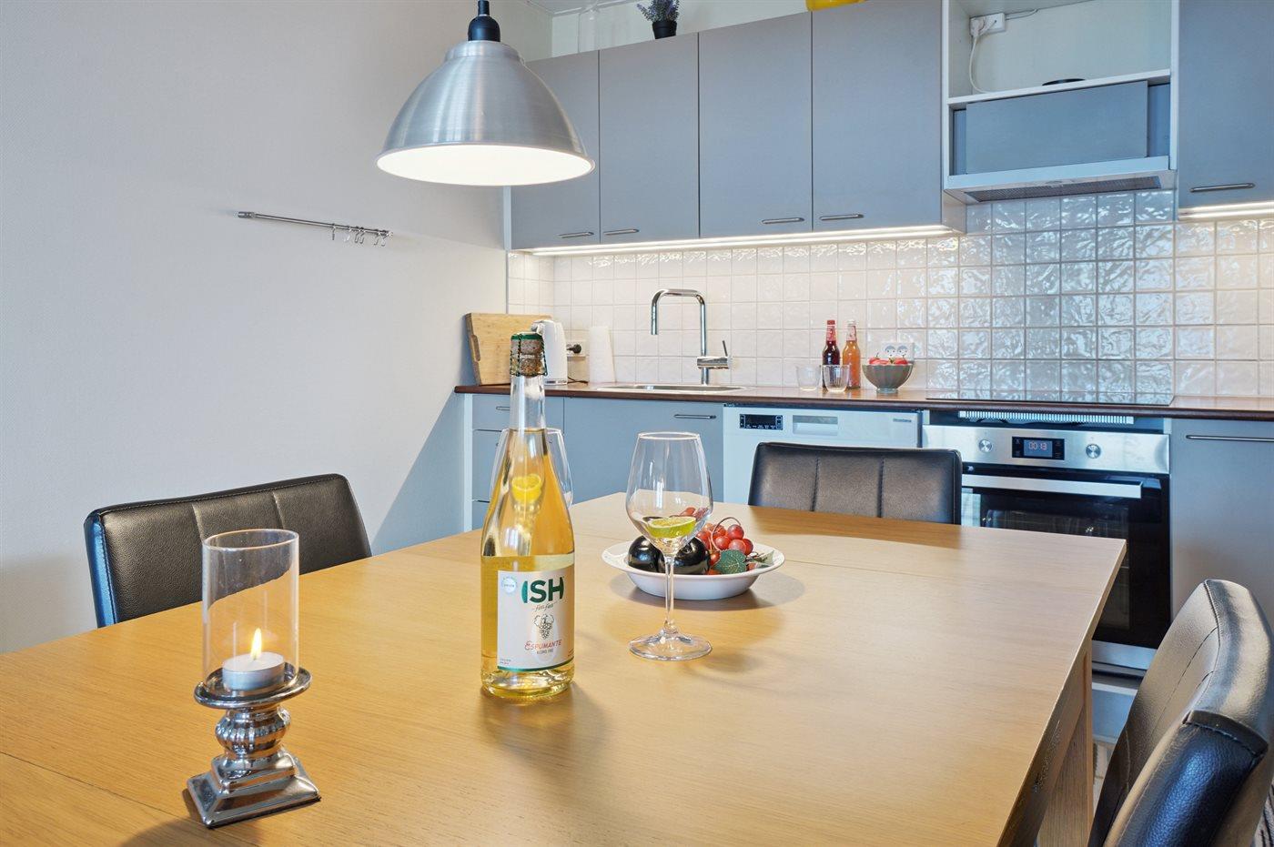 Die Küche ist mit Kühlschrank ausgestattet. Außerdem gibt es 4 Keramik-Kochfelder, Umluftofen sowie Geschirrspüler.
