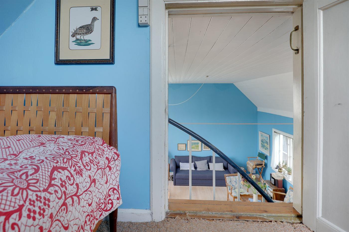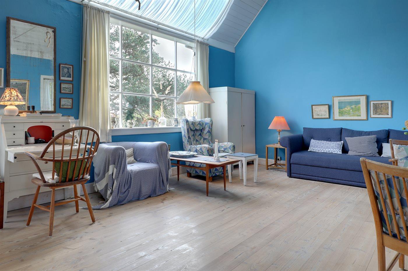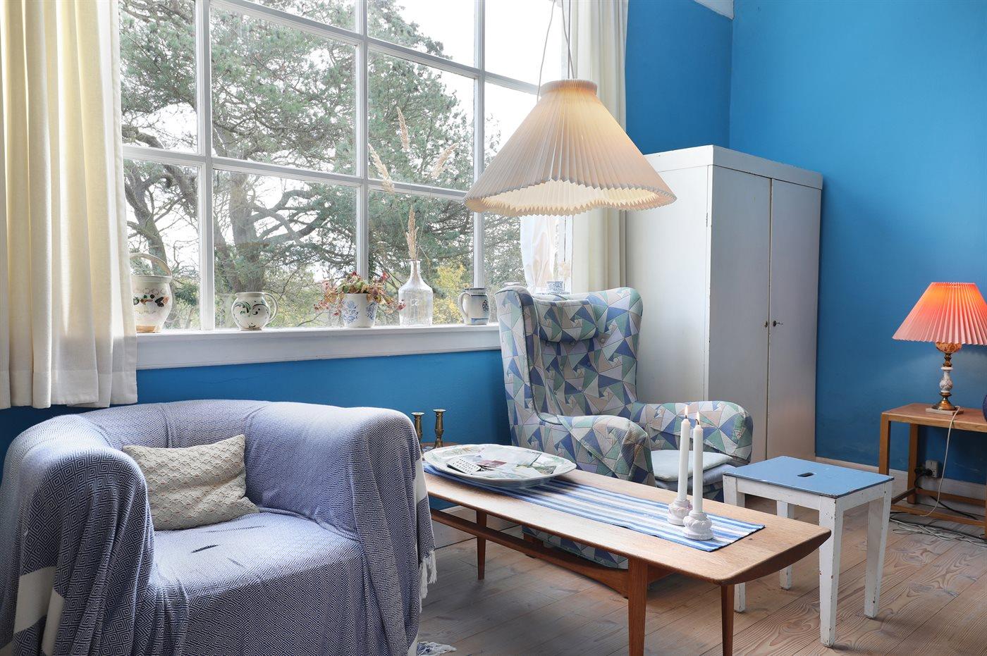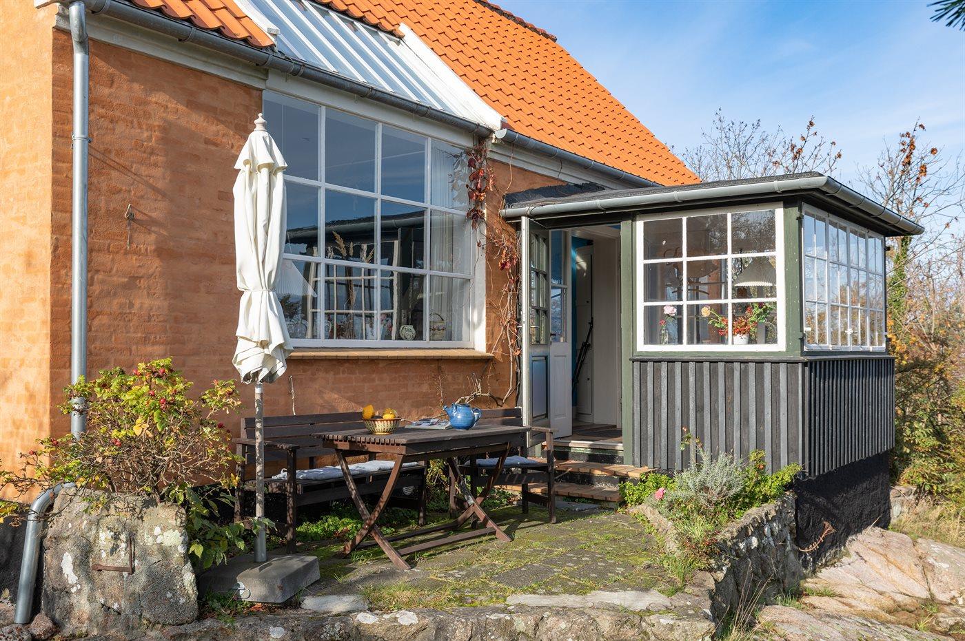 Erhöht gelegenes, älteres Ferienhaus auf einem fantastischen Naturgrundstück mit Felsvorsprung und natürlichen windgeschützten Ecken. Zum Haus gehört zudem eine erhöhte Holzterrasse, die in den Felsvorsprung eingearbeitet wurde. Ursprünglich wurde das Haus für einen Kunstmaler erbaut, dem der Allinges Geschäfte und Restaurants sind leicht zu erreichen. wunderschöne, kräftige Lichteinfall im großen Wohnzimmer zu verdanken ist. Badestrand, Räucherei sowie