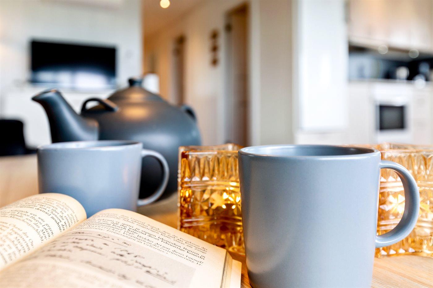 Die Küche ist mit Kühlschrank ausgestattet. Außerdem gibt es 4 Keramik-Kochfelder, Umluftofen, Mikrowelle sowie Geschirrspüler.