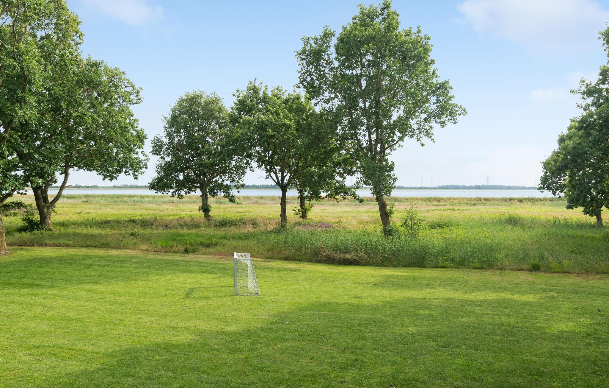 Gehen Sie auf die Terrasse mit Ausblick auf Wiesen, Bäume und die stille Bucht. Genießen Sie Ihre Mahlzeiten im Freien, nehmen Sie Platz am eleganten Gartentisch und lassen Sie die Weite auf sich wirken. Der Garten bietet Platz zum Spielen und Toben. Zwei Fußballtore laden zu kleinen Familien-Matches ein.
