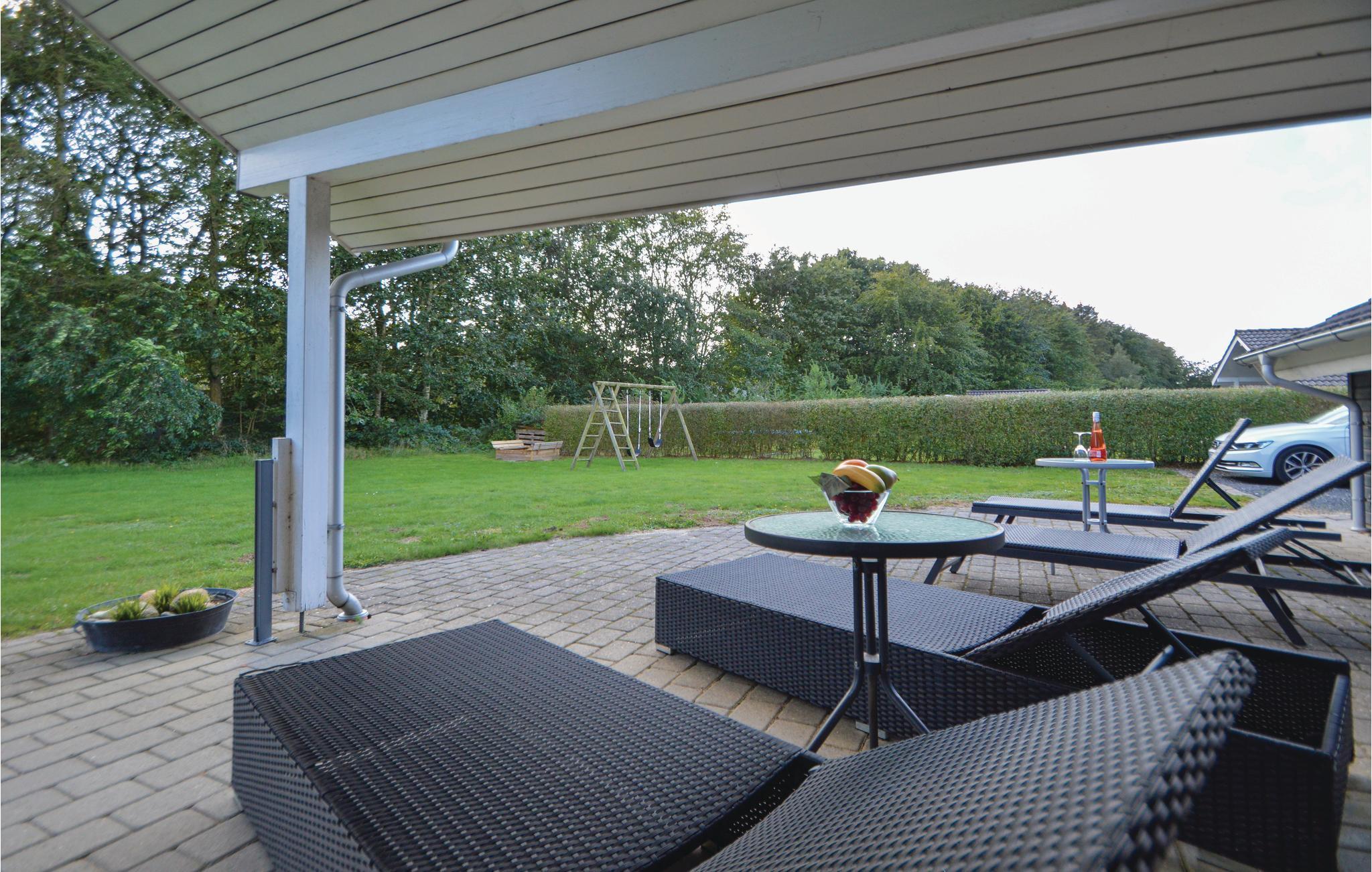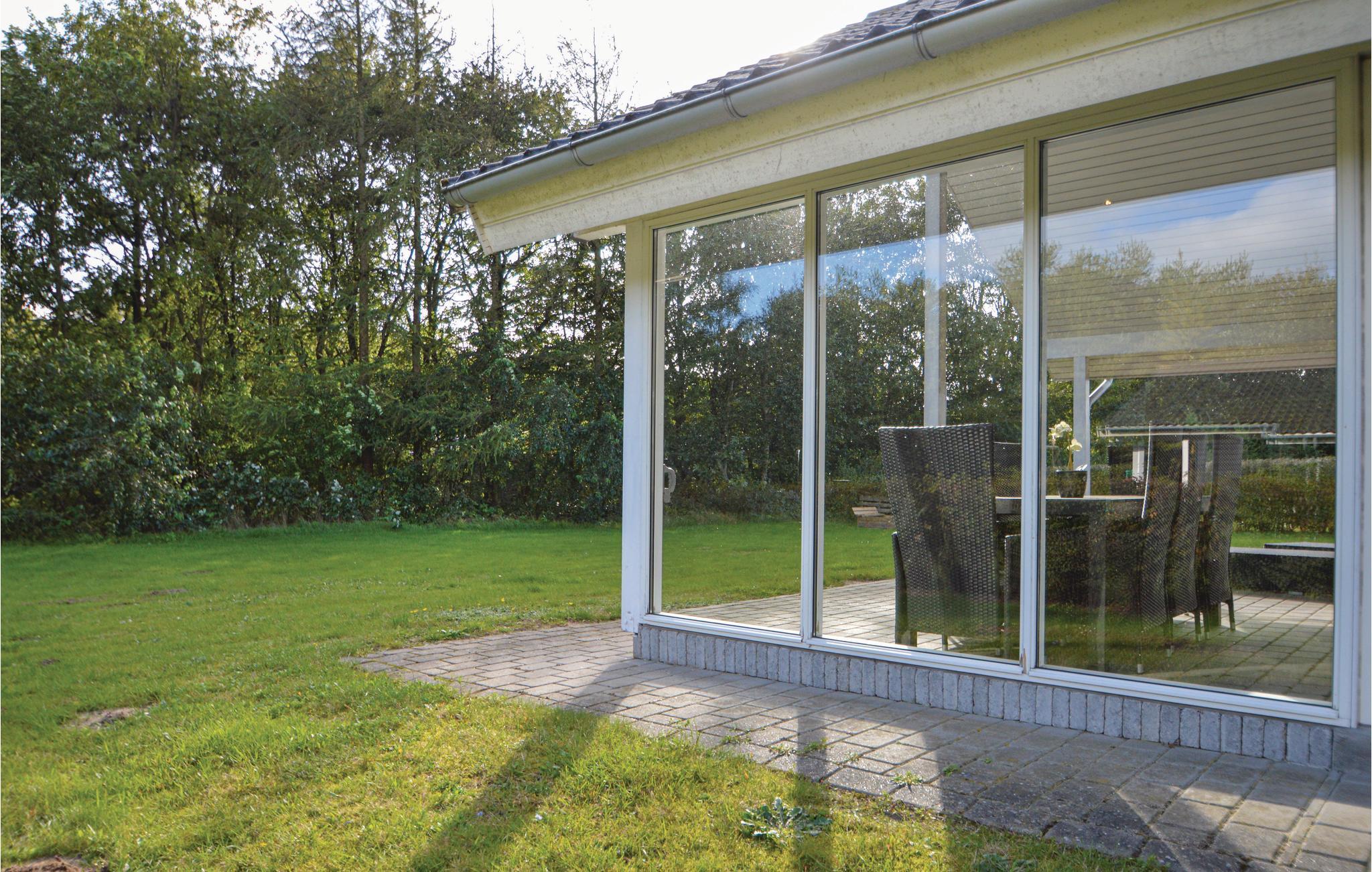 Das Haus liegt auf einem Rasengrundstück mit einem hohen Bewuchs gegen Südwesten, der einen guten Windschutz bietet. Hier können Sie richtig lange Sommerabende genießen und beinahe die Hälfte der Terrasse ist sogar überdacht.