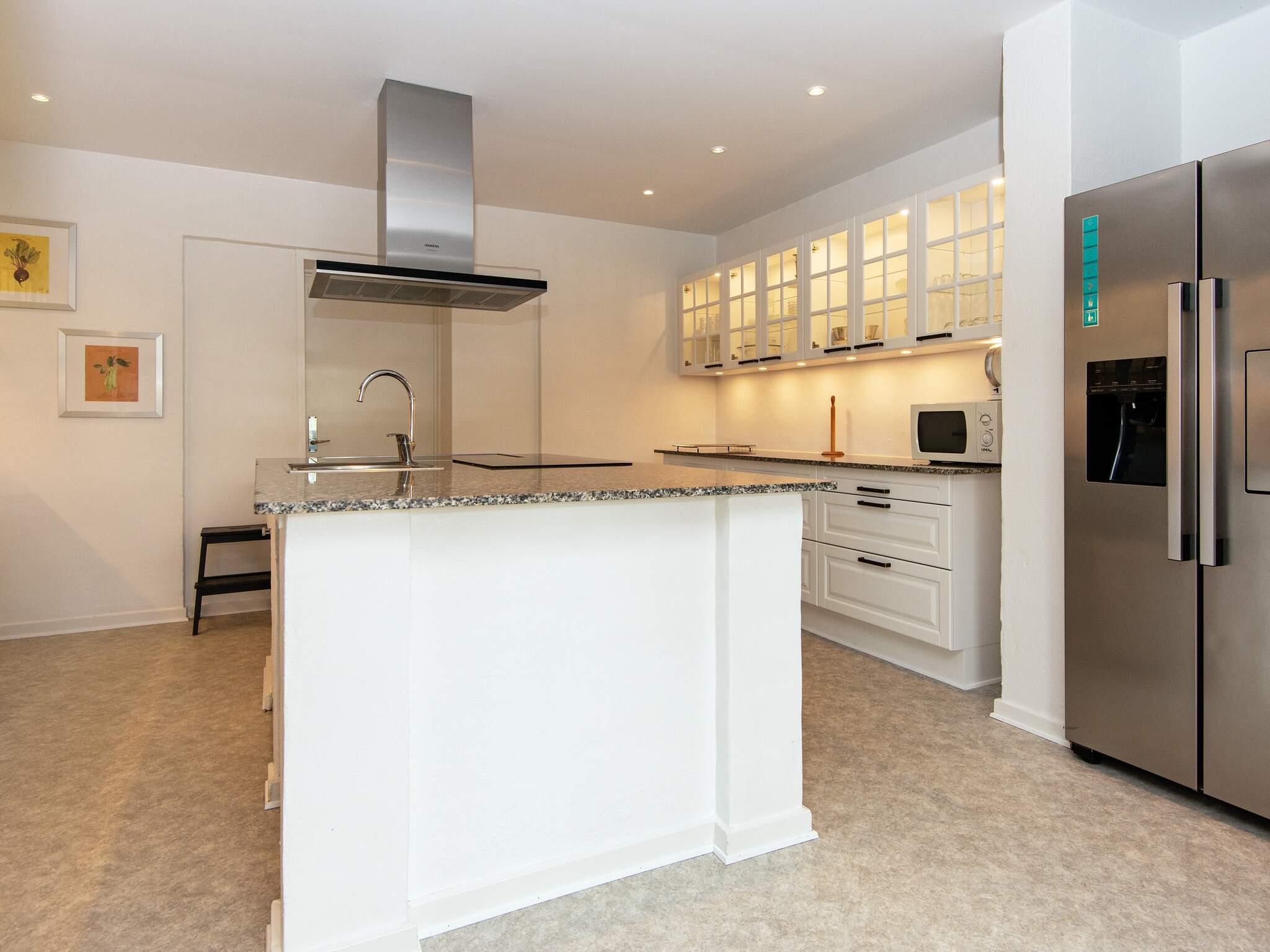 Neben dem Wohnzimmer liegt die praktisch eingerichtete Küche mit Kochinsel. Dort stehen zwei Elektroherde zur Verfügung. Im Erdgeschoss gibt es zudem drei Schlafzimmer mit zugehörigem Bad, ein Schlafzimmer ohne Bad und ein Badezimmer neben dem Esszimmer und dem Aktivitätsbereich.
