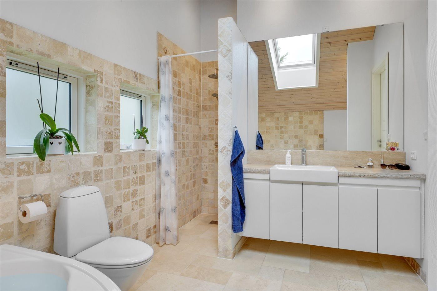 Es gibt 1 Badezimmer mit Duschnische und 2 Toiletten, davon 1 Gästetoilette. Fußbodenheizung in 1 Badezimmer. Fußbodenheizung in der Gästetoilette.. Badewanne.