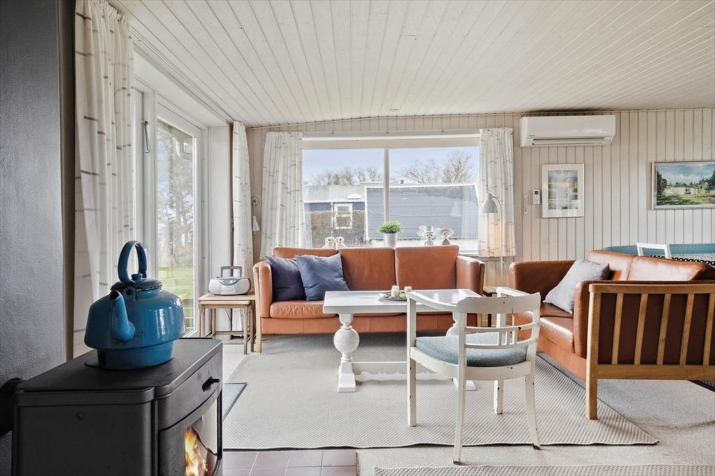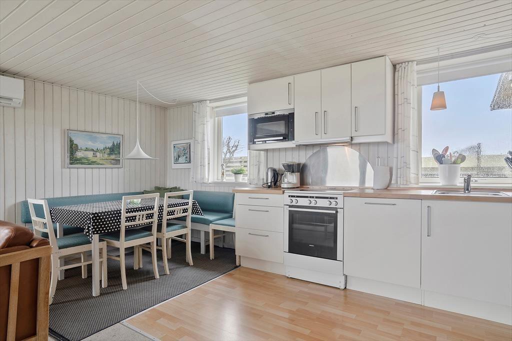 Das quadratische, reizende Ferienhaus präsentiert sich angenehm gepflegt und schön hell. Die offene Küche verfügt über einen gemütlichen Essplatz mit einer Bank und grenzt unmittelbar an den stimmungsvollen Wohnraum. Mit angenehm viel Schrankfläche, einem Geschirrspüler, einem Kühl- und Gefrierschrank und weiteren Annehmlichkeiten bietet Ihnen die Küche gute Arbeitsbedingungen. Die große Fensterpartie vor der Polstersitzgruppe verwöhnt mit Meerblick in Richtung Südosten. Durch die Terrassentür treten Sie hinaus auf die gepflasterte Terrasse, vor der sich der Garten und das Strandgrundstück erstrecken. Im kombinierten Küchen-, Wohn- und Essbereich werden Sie viel gemeinsame Zeit beim Zubereiten der Mahlzeiten, beim Kartenspielen und während gemütlicher Filmabende verleben. Der Fernseher empfängt dänische und deutsche Sender.