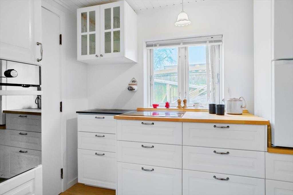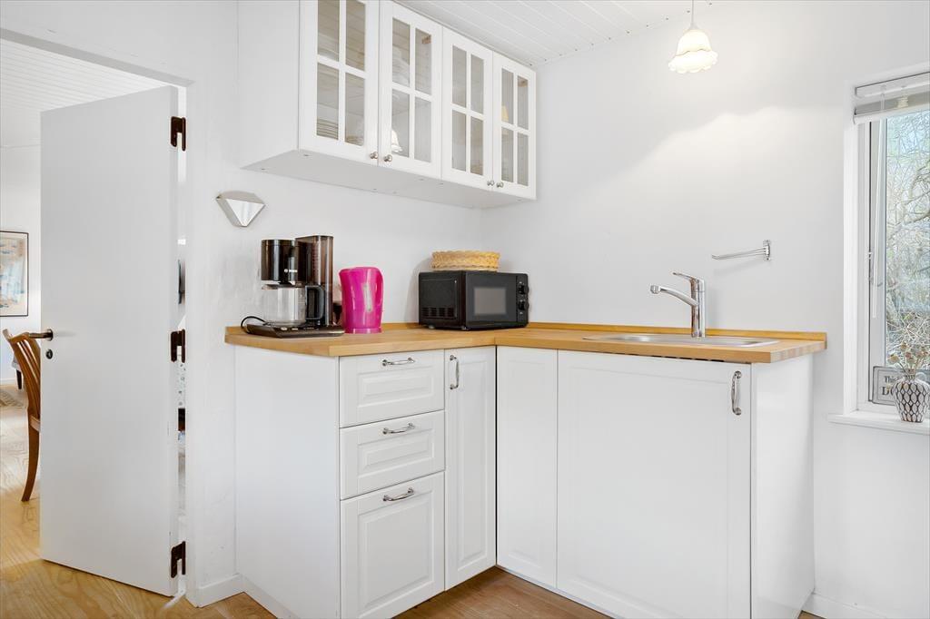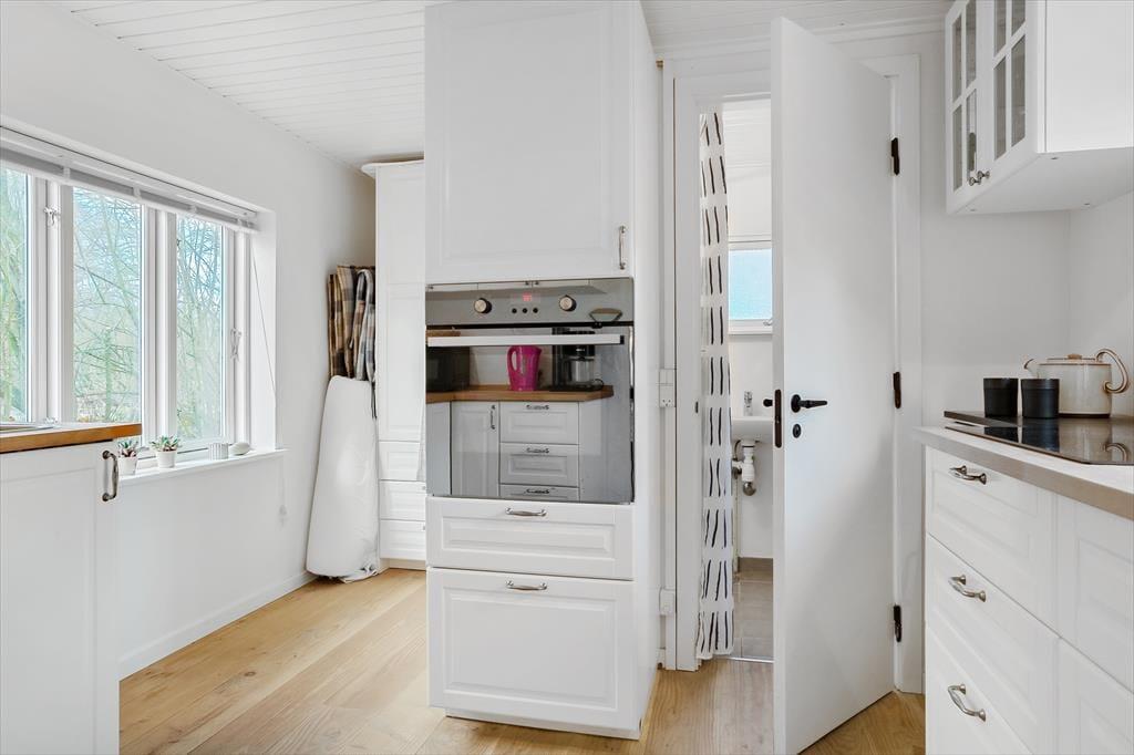 Die separate Küche mit einem schönen Holzfußboden ist neu und funktionell. Trotz der geringen Größe beinhaltet Sie alles Notwendige, wie beispielsweise einen Kühlschrank mit Gefriermöglichkeit, einen Backofen und eine Kaffeemaschine.