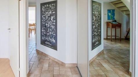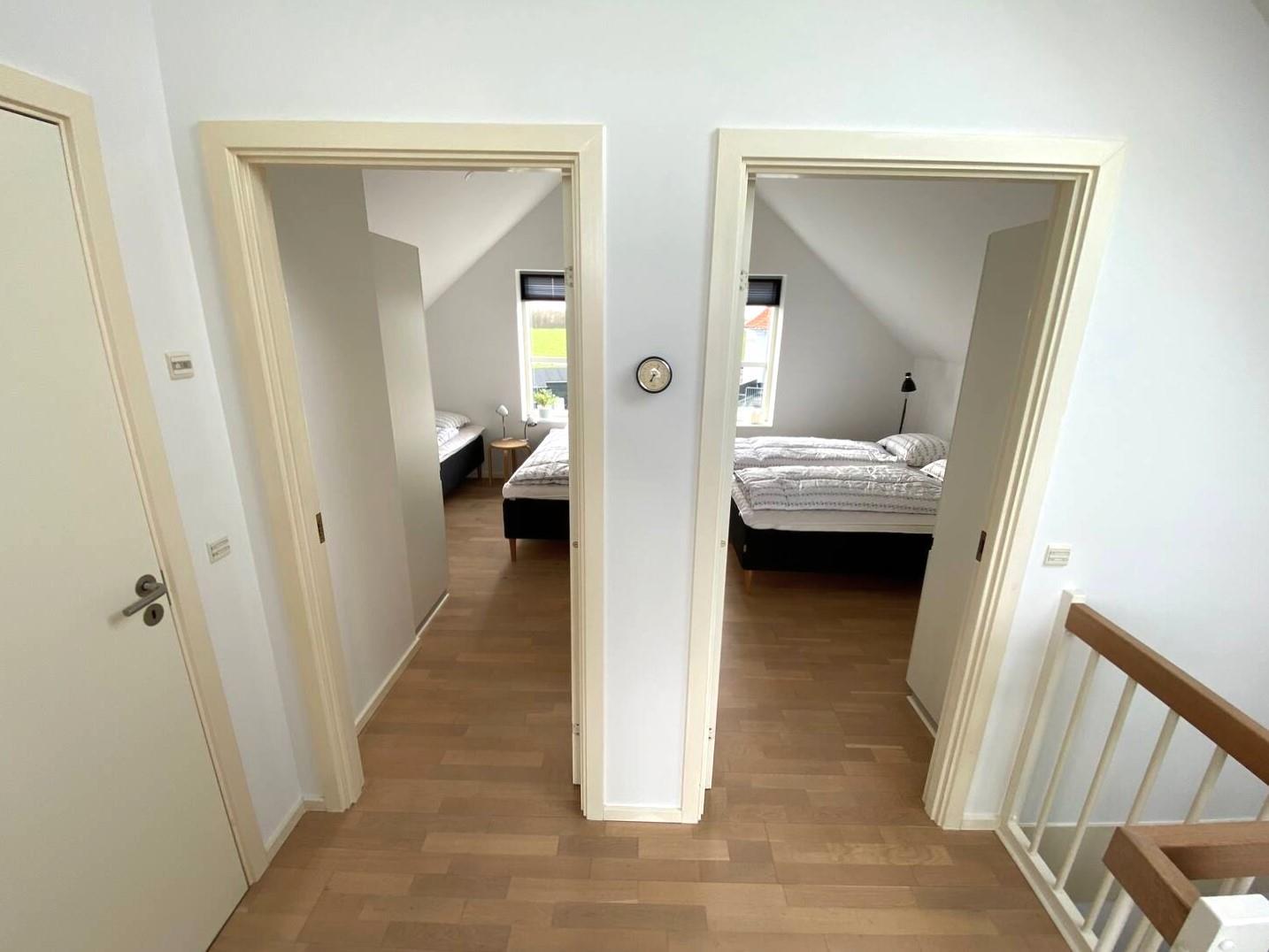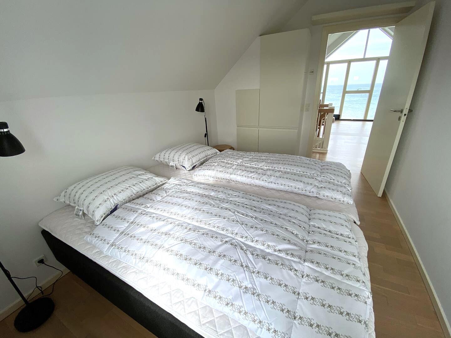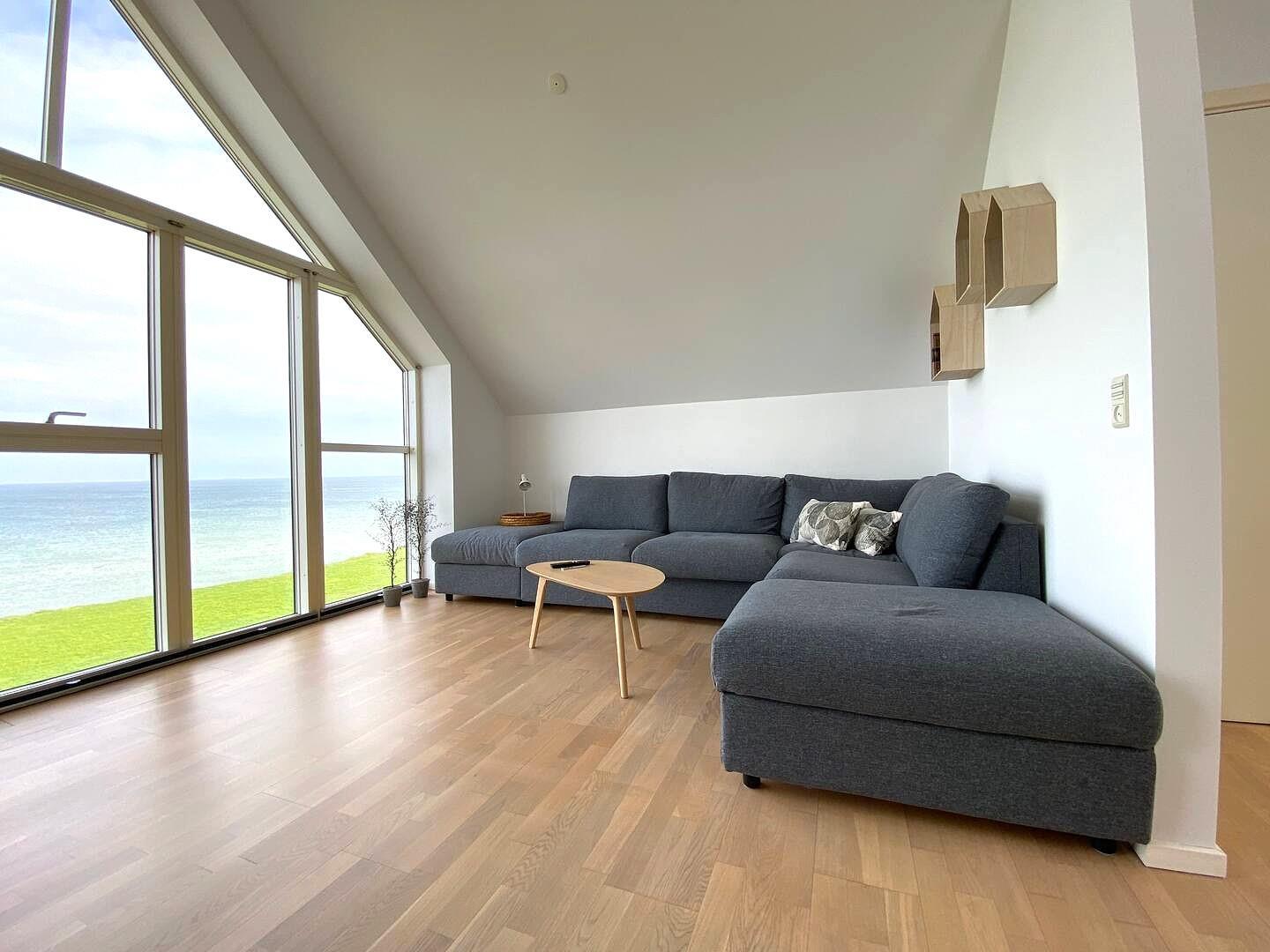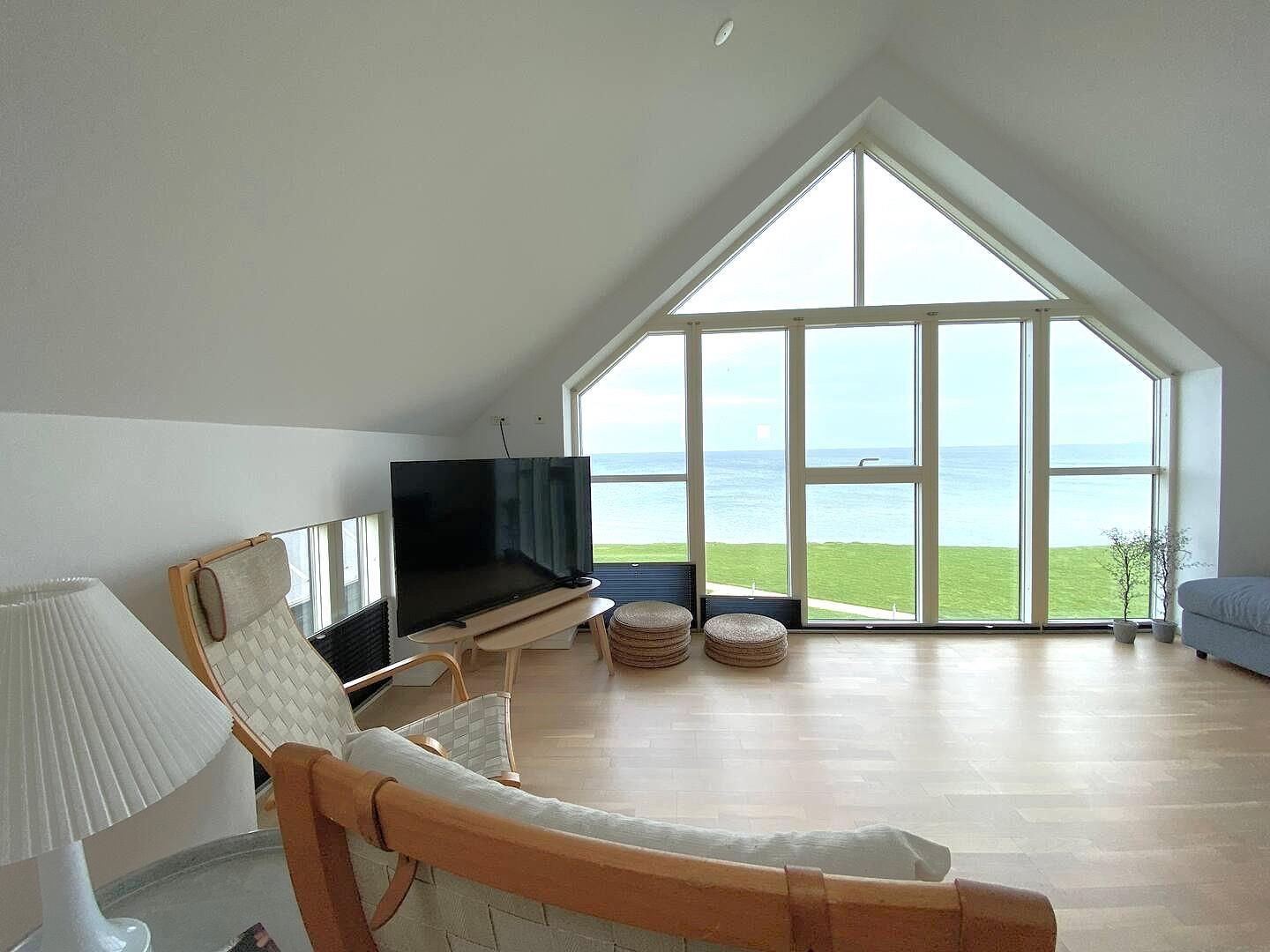 Im ersten Stock betreten Sie direkt das helle Wohnzimmer mit großen Panoramafenstern, von denen aus Sie den Blick auf das Meer und die Grünflächen genießen können. Machen Sie es sich auf dem weichen Sofa bequem, schalten Sie den Fernseher ein – oder lassen Sie Ihren Blick über den Horizont schweifen. Hier oben finden Sie zwei weitere Schlafzimmer (eines mit Doppelbett und eines mit zwei Einzelbetten) sowie ein weiteres Badezimmer mit Duschkabine.