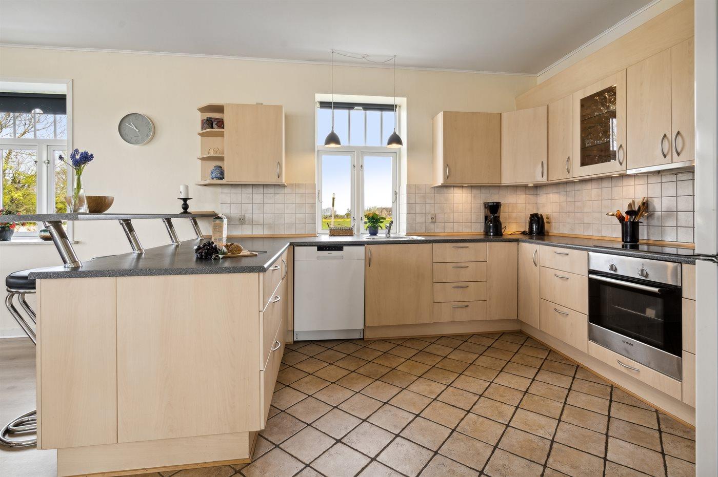 Die Küche ist mit Kühlschrank ausgestattet. Außerdem gibt es 4 Keramik-Kochfelder, Umluftofen, Mikrowelle sowie Geschirrspüler. Fußbodenheizung in der Küche.